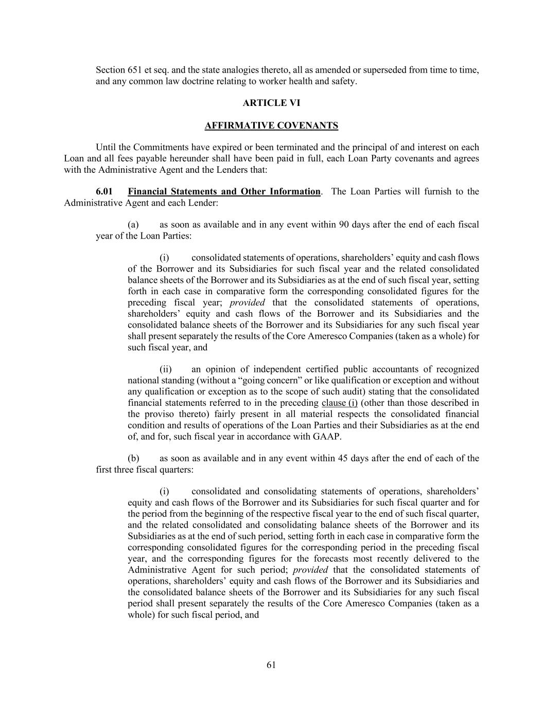 61 Section 651 et seq. and the state analogies thereto, all as amended or superseded from time to time, and any common law doctrine relating to worker health and safety. ARTICLE VI AFFIRMATIVE COVENANTS Until the Commitments have expired or been terminated and the principal of and interest on each Loan and all fees payable hereunder shall have been paid in full, each Loan Party covenants and agrees with the Administrative Agent and the Lenders that: 6.01 Financial Statements and Other Information. The Loan Parties will furnish to the Administrative Agent and each Lender: (a) as soon as available and in any event within 90 days after the end of each fiscal year of the Loan Parties: (i) consolidated statements of operations, shareholders’ equity and cash flows of the Borrower and its Subsidiaries for such fiscal year and the related consolidated balance sheets of the Borrower and its Subsidiaries as at the end of such fiscal year, setting forth in each case in comparative form the corresponding consolidated figures for the preceding fiscal year; provided that the consolidated statements of operations, shareholders’ equity and cash flows of the Borrower and its Subsidiaries and the consolidated balance sheets of the Borrower and its Subsidiaries for any such fiscal year shall present separately the results of the Core Ameresco Companies (taken as a whole) for such fiscal year, and (ii) an opinion of independent certified public accountants of recognized national standing (without a “going concern” or like qualification or exception and without any qualification or exception as to the scope of such audit) stating that the consolidated financial statements referred to in the preceding clause (i) (other than those described in the proviso thereto) fairly present in all material respects the consolidated financial condition and results of operations of the Loan Parties and their Subsidiaries as at the end of, and for, such fiscal year in accordance with GAAP. (b) as soon as available and in any event within 45 days after the end of each of the first three fiscal quarters: (i) consolidated and consolidating statements of operations, shareholders’ equity and cash flows of the Borrower and its Subsidiaries for such fiscal quarter and for the period from the beginning of the respective fiscal year to the end of such fiscal quarter, and the related consolidated and consolidating balance sheets of the Borrower and its Subsidiaries as at the end of such period, setting forth in each case in comparative form the corresponding consolidated figures for the corresponding period in the preceding fiscal year, and the corresponding figures for the forecasts most recently delivered to the Administrative Agent for such period; provided that the consolidated statements of operations, shareholders’ equity and cash flows of the Borrower and its Subsidiaries and the consolidated balance sheets of the Borrower and its Subsidiaries for any such fiscal period shall present separately the results of the Core Ameresco Companies (taken as a whole) for such fiscal period, and