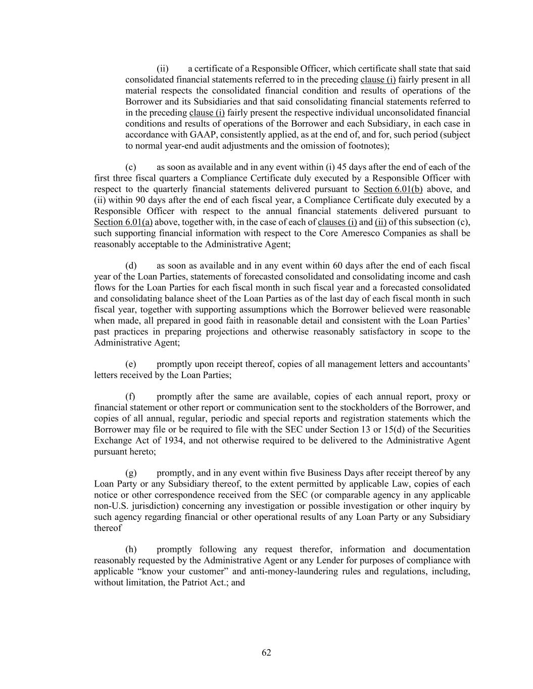 62 (ii) a certificate of a Responsible Officer, which certificate shall state that said consolidated financial statements referred to in the preceding clause (i) fairly present in all material respects the consolidated financial condition and results of operations of the Borrower and its Subsidiaries and that said consolidating financial statements referred to in the preceding clause (i) fairly present the respective individual unconsolidated financial conditions and results of operations of the Borrower and each Subsidiary, in each case in accordance with GAAP, consistently applied, as at the end of, and for, such period (subject to normal year-end audit adjustments and the omission of footnotes); (c) as soon as available and in any event within (i) 45 days after the end of each of the first three fiscal quarters a Compliance Certificate duly executed by a Responsible Officer with respect to the quarterly financial statements delivered pursuant to Section 6.01(b) above, and (ii) within 90 days after the end of each fiscal year, a Compliance Certificate duly executed by a Responsible Officer with respect to the annual financial statements delivered pursuant to Section 6.01(a) above, together with, in the case of each of clauses (i) and (ii) of this subsection (c), such supporting financial information with respect to the Core Ameresco Companies as shall be reasonably acceptable to the Administrative Agent; (d) as soon as available and in any event within 60 days after the end of each fiscal year of the Loan Parties, statements of forecasted consolidated and consolidating income and cash flows for the Loan Parties for each fiscal month in such fiscal year and a forecasted consolidated and consolidating balance sheet of the Loan Parties as of the last day of each fiscal month in such fiscal year, together with supporting assumptions which the Borrower believed were reasonable when made, all prepared in good faith in reasonable detail and consistent with the Loan Parties’ past practices in preparing projections and otherwise reasonably satisfactory in scope to the Administrative Agent; (e) promptly upon receipt thereof, copies of all management letters and accountants’ letters received by the Loan Parties; (f) promptly after the same are available, copies of each annual report, proxy or financial statement or other report or communication sent to the stockholders of the Borrower, and copies of all annual, regular, periodic and special reports and registration statements which the Borrower may file or be required to file with the SEC under Section 13 or 15(d) of the Securities Exchange Act of 1934, and not otherwise required to be delivered to the Administrative Agent pursuant hereto; (g) promptly, and in any event within five Business Days after receipt thereof by any Loan Party or any Subsidiary thereof, to the extent permitted by applicable Law, copies of each notice or other correspondence received from the SEC (or comparable agency in any applicable non-U.S. jurisdiction) concerning any investigation or possible investigation or other inquiry by such agency regarding financial or other operational results of any Loan Party or any Subsidiary thereof (h) promptly following any request therefor, information and documentation reasonably requested by the Administrative Agent or any Lender for purposes of compliance with applicable “know your customer” and anti-money-laundering rules and regulations, including, without limitation, the Patriot Act.; and