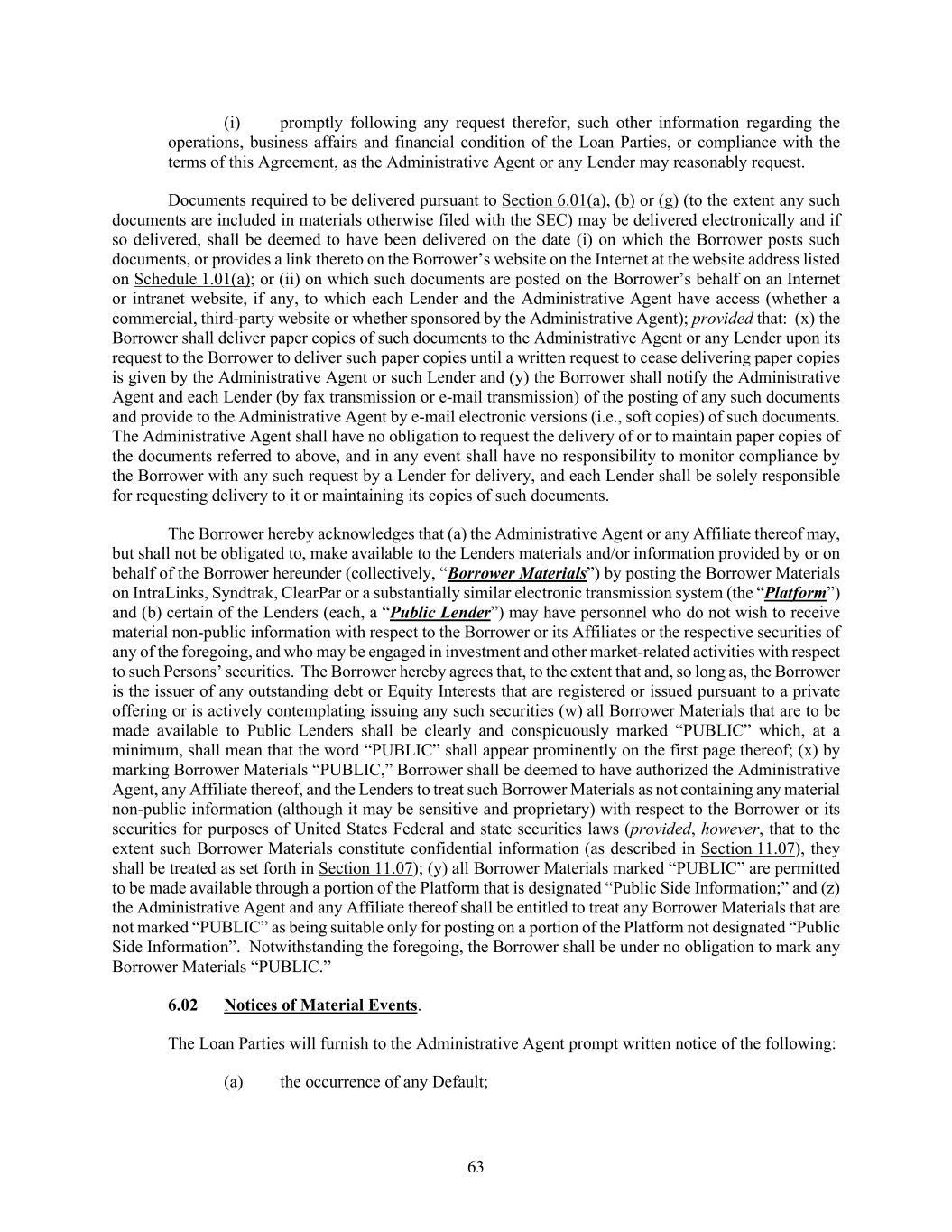 63 (i) promptly following any request therefor, such other information regarding the operations, business affairs and financial condition of the Loan Parties, or compliance with the terms of this Agreement, as the Administrative Agent or any Lender may reasonably request. Documents required to be delivered pursuant to Section 6.01(a), (b) or (g) (to the extent any such documents are included in materials otherwise filed with the SEC) may be delivered electronically and if so delivered, shall be deemed to have been delivered on the date (i) on which the Borrower posts such documents, or provides a link thereto on the Borrower’s website on the Internet at the website address listed on Schedule 1.01(a); or (ii) on which such documents are posted on the Borrower’s behalf on an Internet or intranet website, if any, to which each Lender and the Administrative Agent have access (whether a commercial, third-party website or whether sponsored by the Administrative Agent); provided that: (x) the Borrower shall deliver paper copies of such documents to the Administrative Agent or any Lender upon its request to the Borrower to deliver such paper copies until a written request to cease delivering paper copies is given by the Administrative Agent or such Lender and (y) the Borrower shall notify the Administrative Agent and each Lender (by fax transmission or e-mail transmission) of the posting of any such documents and provide to the Administrative Agent by e-mail electronic versions (i.e., soft copies) of such documents. The Administrative Agent shall have no obligation to request the delivery of or to maintain paper copies of the documents referred to above, and in any event shall have no responsibility to monitor compliance by the Borrower with any such request by a Lender for delivery, and each Lender shall be solely responsible for requesting delivery to it or maintaining its copies of such documents. The Borrower hereby acknowledges that (a) the Administrative Agent or any Affiliate thereof may, but shall not be obligated to, make available to the Lenders materials and/or information provided by or on behalf of the Borrower hereunder (collectively, “Borrower Materials”) by posting the Borrower Materials on IntraLinks, Syndtrak, ClearPar or a substantially similar electronic transmission system (the “Platform”) and (b) certain of the Lenders (each, a “Public Lender”) may have personnel who do not wish to receive material non-public information with respect to the Borrower or its Affiliates or the respective securities of any of the foregoing, and who may be engaged in investment and other market-related activities with respect to such Persons’ securities. The Borrower hereby agrees that, to the extent that and, so long as, the Borrower is the issuer of any outstanding debt or Equity Interests that are registered or issued pursuant to a private offering or is actively contemplating issuing any such securities (w) all Borrower Materials that are to be made available to Public Lenders shall be clearly and conspicuously marked “PUBLIC” which, at a minimum, shall mean that the word “PUBLIC” shall appear prominently on the first page thereof; (x) by marking Borrower Materials “PUBLIC,” Borrower shall be deemed to have authorized the Administrative Agent, any Affiliate thereof, and the Lenders to treat such Borrower Materials as not containing any material non-public information (although it may be sensitive and proprietary) with respect to the Borrower or its securities for purposes of United States Federal and state securities laws (provided, however, that to the extent such Borrower Materials constitute confidential information (as described in Section 11.07), they shall be treated as set forth in Section 11.07); (y) all Borrower Materials marked “PUBLIC” are permitted to be made available through a portion of the Platform that is designated “Public Side Information;” and (z) the Administrative Agent and any Affiliate thereof shall be entitled to treat any Borrower Materials that are not marked “PUBLIC” as being suitable only for posting on a portion of the Platform not designated “Public Side Information”. Notwithstanding the foregoing, the Borrower shall be under no obligation to mark any Borrower Materials “PUBLIC.” 6.02 Notices of Material Events. The Loan Parties will furnish to the Administrative Agent prompt written notice of the following: (a) the occurrence of any Default;