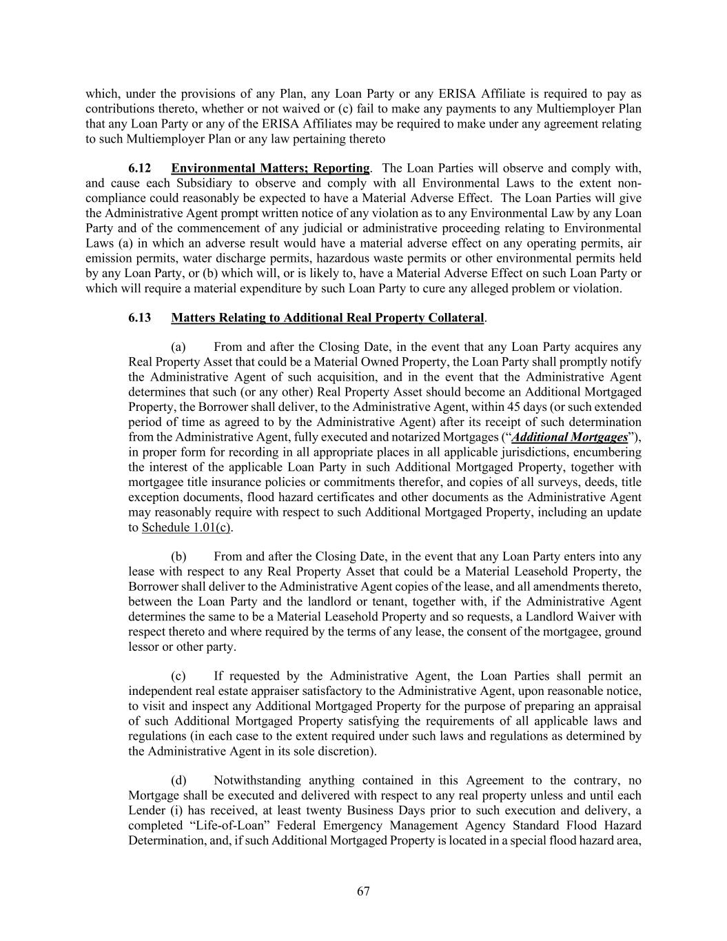 67 which, under the provisions of any Plan, any Loan Party or any ERISA Affiliate is required to pay as contributions thereto, whether or not waived or (c) fail to make any payments to any Multiemployer Plan that any Loan Party or any of the ERISA Affiliates may be required to make under any agreement relating to such Multiemployer Plan or any law pertaining thereto 6.12 Environmental Matters; Reporting. The Loan Parties will observe and comply with, and cause each Subsidiary to observe and comply with all Environmental Laws to the extent non- compliance could reasonably be expected to have a Material Adverse Effect. The Loan Parties will give the Administrative Agent prompt written notice of any violation as to any Environmental Law by any Loan Party and of the commencement of any judicial or administrative proceeding relating to Environmental Laws (a) in which an adverse result would have a material adverse effect on any operating permits, air emission permits, water discharge permits, hazardous waste permits or other environmental permits held by any Loan Party, or (b) which will, or is likely to, have a Material Adverse Effect on such Loan Party or which will require a material expenditure by such Loan Party to cure any alleged problem or violation. 6.13 Matters Relating to Additional Real Property Collateral. (a) From and after the Closing Date, in the event that any Loan Party acquires any Real Property Asset that could be a Material Owned Property, the Loan Party shall promptly notify the Administrative Agent of such acquisition, and in the event that the Administrative Agent determines that such (or any other) Real Property Asset should become an Additional Mortgaged Property, the Borrower shall deliver, to the Administrative Agent, within 45 days (or such extended period of time as agreed to by the Administrative Agent) after its receipt of such determination from the Administrative Agent, fully executed and notarized Mortgages (“Additional Mortgages”), in proper form for recording in all appropriate places in all applicable jurisdictions, encumbering the interest of the applicable Loan Party in such Additional Mortgaged Property, together with mortgagee title insurance policies or commitments therefor, and copies of all surveys, deeds, title exception documents, flood hazard certificates and other documents as the Administrative Agent may reasonably require with respect to such Additional Mortgaged Property, including an update to Schedule 1.01(c). (b) From and after the Closing Date, in the event that any Loan Party enters into any lease with respect to any Real Property Asset that could be a Material Leasehold Property, the Borrower shall deliver to the Administrative Agent copies of the lease, and all amendments thereto, between the Loan Party and the landlord or tenant, together with, if the Administrative Agent determines the same to be a Material Leasehold Property and so requests, a Landlord Waiver with respect thereto and where required by the terms of any lease, the consent of the mortgagee, ground lessor or other party. (c) If requested by the Administrative Agent, the Loan Parties shall permit an independent real estate appraiser satisfactory to the Administrative Agent, upon reasonable notice, to visit and inspect any Additional Mortgaged Property for the purpose of preparing an appraisal of such Additional Mortgaged Property satisfying the requirements of all applicable laws and regulations (in each case to the extent required under such laws and regulations as determined by the Administrative Agent in its sole discretion). (d) Notwithstanding anything contained in this Agreement to the contrary, no Mortgage shall be executed and delivered with respect to any real property unless and until each Lender (i) has received, at least twenty Business Days prior to such execution and delivery, a completed “Life-of-Loan” Federal Emergency Management Agency Standard Flood Hazard Determination, and, if such Additional Mortgaged Property is located in a special flood hazard area,