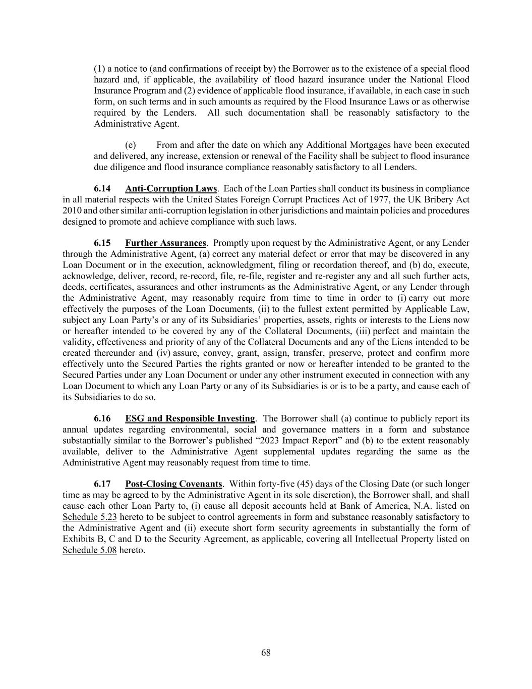 68 (1) a notice to (and confirmations of receipt by) the Borrower as to the existence of a special flood hazard and, if applicable, the availability of flood hazard insurance under the National Flood Insurance Program and (2) evidence of applicable flood insurance, if available, in each case in such form, on such terms and in such amounts as required by the Flood Insurance Laws or as otherwise required by the Lenders. All such documentation shall be reasonably satisfactory to the Administrative Agent. (e) From and after the date on which any Additional Mortgages have been executed and delivered, any increase, extension or renewal of the Facility shall be subject to flood insurance due diligence and flood insurance compliance reasonably satisfactory to all Lenders. 6.14 Anti-Corruption Laws. Each of the Loan Parties shall conduct its business in compliance in all material respects with the United States Foreign Corrupt Practices Act of 1977, the UK Bribery Act 2010 and other similar anti-corruption legislation in other jurisdictions and maintain policies and procedures designed to promote and achieve compliance with such laws. 6.15 Further Assurances. Promptly upon request by the Administrative Agent, or any Lender through the Administrative Agent, (a) correct any material defect or error that may be discovered in any Loan Document or in the execution, acknowledgment, filing or recordation thereof, and (b) do, execute, acknowledge, deliver, record, re-record, file, re-file, register and re-register any and all such further acts, deeds, certificates, assurances and other instruments as the Administrative Agent, or any Lender through the Administrative Agent, may reasonably require from time to time in order to (i) carry out more effectively the purposes of the Loan Documents, (ii) to the fullest extent permitted by Applicable Law, subject any Loan Party’s or any of its Subsidiaries’ properties, assets, rights or interests to the Liens now or hereafter intended to be covered by any of the Collateral Documents, (iii) perfect and maintain the validity, effectiveness and priority of any of the Collateral Documents and any of the Liens intended to be created thereunder and (iv) assure, convey, grant, assign, transfer, preserve, protect and confirm more effectively unto the Secured Parties the rights granted or now or hereafter intended to be granted to the Secured Parties under any Loan Document or under any other instrument executed in connection with any Loan Document to which any Loan Party or any of its Subsidiaries is or is to be a party, and cause each of its Subsidiaries to do so. 6.16 ESG and Responsible Investing. The Borrower shall (a) continue to publicly report its annual updates regarding environmental, social and governance matters in a form and substance substantially similar to the Borrower’s published “2023 Impact Report” and (b) to the extent reasonably available, deliver to the Administrative Agent supplemental updates regarding the same as the Administrative Agent may reasonably request from time to time. 6.17 Post-Closing Covenants. Within forty-five (45) days of the Closing Date (or such longer time as may be agreed to by the Administrative Agent in its sole discretion), the Borrower shall, and shall cause each other Loan Party to, (i) cause all deposit accounts held at Bank of America, N.A. listed on Schedule 5.23 hereto to be subject to control agreements in form and substance reasonably satisfactory to the Administrative Agent and (ii) execute short form security agreements in substantially the form of Exhibits B, C and D to the Security Agreement, as applicable, covering all Intellectual Property listed on Schedule 5.08 hereto.