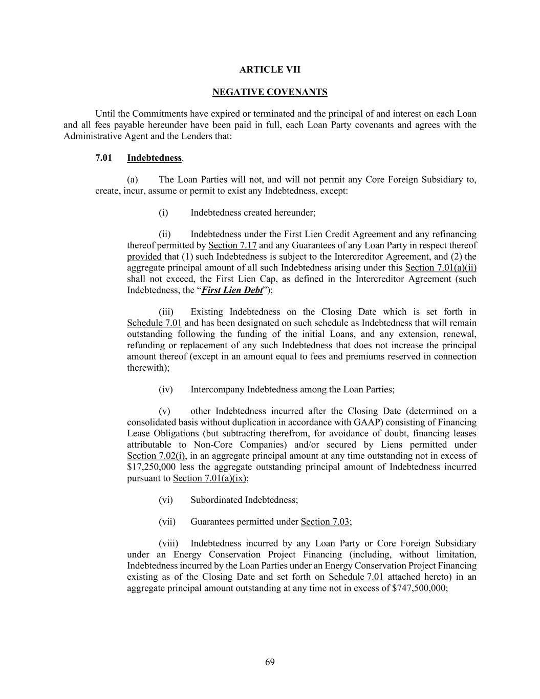 69 ARTICLE VII NEGATIVE COVENANTS Until the Commitments have expired or terminated and the principal of and interest on each Loan and all fees payable hereunder have been paid in full, each Loan Party covenants and agrees with the Administrative Agent and the Lenders that: 7.01 Indebtedness. (a) The Loan Parties will not, and will not permit any Core Foreign Subsidiary to, create, incur, assume or permit to exist any Indebtedness, except: (i) Indebtedness created hereunder; (ii) Indebtedness under the First Lien Credit Agreement and any refinancing thereof permitted by Section 7.17 and any Guarantees of any Loan Party in respect thereof provided that (1) such Indebtedness is subject to the Intercreditor Agreement, and (2) the aggregate principal amount of all such Indebtedness arising under this Section 7.01(a)(ii) shall not exceed, the First Lien Cap, as defined in the Intercreditor Agreement (such Indebtedness, the “First Lien Debt”); (iii) Existing Indebtedness on the Closing Date which is set forth in Schedule 7.01 and has been designated on such schedule as Indebtedness that will remain outstanding following the funding of the initial Loans, and any extension, renewal, refunding or replacement of any such Indebtedness that does not increase the principal amount thereof (except in an amount equal to fees and premiums reserved in connection therewith); (iv) Intercompany Indebtedness among the Loan Parties; (v) other Indebtedness incurred after the Closing Date (determined on a consolidated basis without duplication in accordance with GAAP) consisting of Financing Lease Obligations (but subtracting therefrom, for avoidance of doubt, financing leases attributable to Non-Core Companies) and/or secured by Liens permitted under Section 7.02(i), in an aggregate principal amount at any time outstanding not in excess of $17,250,000 less the aggregate outstanding principal amount of Indebtedness incurred pursuant to Section 7.01(a)(ix); (vi) Subordinated Indebtedness; (vii) Guarantees permitted under Section 7.03; (viii) Indebtedness incurred by any Loan Party or Core Foreign Subsidiary under an Energy Conservation Project Financing (including, without limitation, Indebtedness incurred by the Loan Parties under an Energy Conservation Project Financing existing as of the Closing Date and set forth on Schedule 7.01 attached hereto) in an aggregate principal amount outstanding at any time not in excess of $747,500,000;