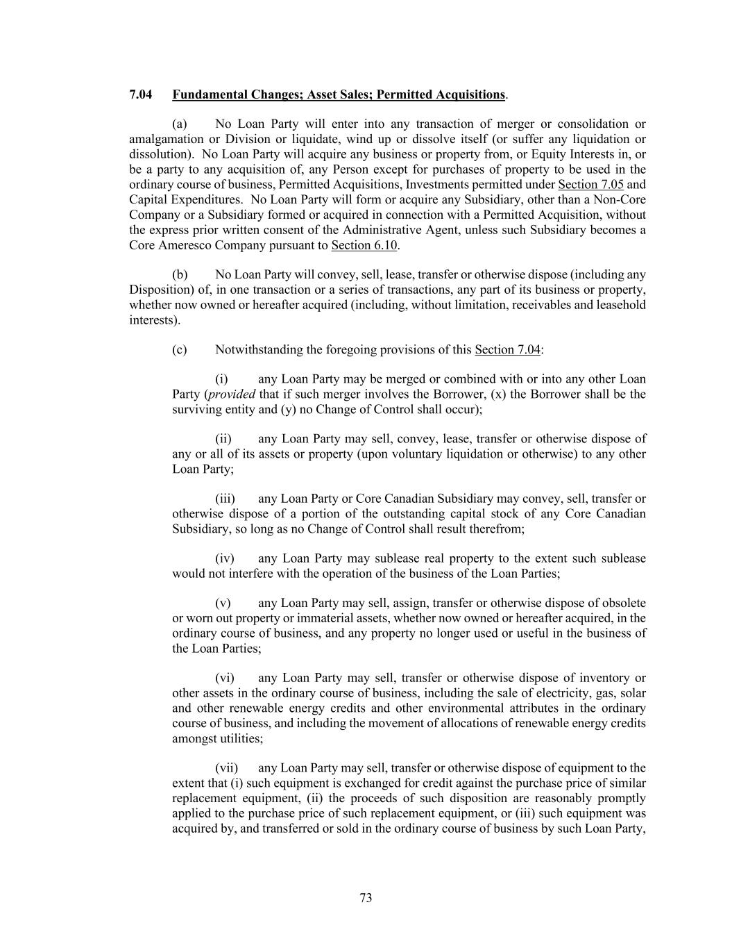 73 7.04 Fundamental Changes; Asset Sales; Permitted Acquisitions. (a) No Loan Party will enter into any transaction of merger or consolidation or amalgamation or Division or liquidate, wind up or dissolve itself (or suffer any liquidation or dissolution). No Loan Party will acquire any business or property from, or Equity Interests in, or be a party to any acquisition of, any Person except for purchases of property to be used in the ordinary course of business, Permitted Acquisitions, Investments permitted under Section 7.05 and Capital Expenditures. No Loan Party will form or acquire any Subsidiary, other than a Non-Core Company or a Subsidiary formed or acquired in connection with a Permitted Acquisition, without the express prior written consent of the Administrative Agent, unless such Subsidiary becomes a Core Ameresco Company pursuant to Section 6.10. (b) No Loan Party will convey, sell, lease, transfer or otherwise dispose (including any Disposition) of, in one transaction or a series of transactions, any part of its business or property, whether now owned or hereafter acquired (including, without limitation, receivables and leasehold interests). (c) Notwithstanding the foregoing provisions of this Section 7.04: (i) any Loan Party may be merged or combined with or into any other Loan Party (provided that if such merger involves the Borrower, (x) the Borrower shall be the surviving entity and (y) no Change of Control shall occur); (ii) any Loan Party may sell, convey, lease, transfer or otherwise dispose of any or all of its assets or property (upon voluntary liquidation or otherwise) to any other Loan Party; (iii) any Loan Party or Core Canadian Subsidiary may convey, sell, transfer or otherwise dispose of a portion of the outstanding capital stock of any Core Canadian Subsidiary, so long as no Change of Control shall result therefrom; (iv) any Loan Party may sublease real property to the extent such sublease would not interfere with the operation of the business of the Loan Parties; (v) any Loan Party may sell, assign, transfer or otherwise dispose of obsolete or worn out property or immaterial assets, whether now owned or hereafter acquired, in the ordinary course of business, and any property no longer used or useful in the business of the Loan Parties; (vi) any Loan Party may sell, transfer or otherwise dispose of inventory or other assets in the ordinary course of business, including the sale of electricity, gas, solar and other renewable energy credits and other environmental attributes in the ordinary course of business, and including the movement of allocations of renewable energy credits amongst utilities; (vii) any Loan Party may sell, transfer or otherwise dispose of equipment to the extent that (i) such equipment is exchanged for credit against the purchase price of similar replacement equipment, (ii) the proceeds of such disposition are reasonably promptly applied to the purchase price of such replacement equipment, or (iii) such equipment was acquired by, and transferred or sold in the ordinary course of business by such Loan Party,
