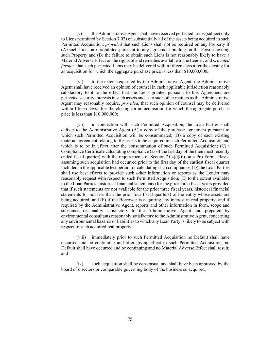 75 (v) the Administrative Agent shall have received perfected Liens (subject only to Liens permitted by Section 7.02) on substantially all of the assets being acquired in such Permitted Acquisition, provided that such Liens shall not be required on any Property if (A) such Liens are prohibited pursuant to any agreement binding on the Person owning such Property and (B) the failure to obtain such Liens is not reasonably likely to have a Material Adverse Effect on the rights of and remedies available to the Lender, and provided further, that such perfected Liens may be delivered within fifteen days after the closing for an acquisition for which the aggregate purchase price is less than $10,000,000; (vi) to the extent requested by the Administrative Agent, the Administrative Agent shall have received an opinion of counsel in each applicable jurisdiction reasonably satisfactory to it to the effect that the Liens granted pursuant to this Agreement are perfected security interests in such assets and as to such other matters as the Administrative Agent may reasonably require, provided, that such opinion of counsel may be delivered within fifteen days after the closing for an acquisition for which the aggregate purchase price is less than $10,000,000; (vii) in connection with such Permitted Acquisition, the Loan Parties shall deliver to the Administrative Agent (A) a copy of the purchase agreement pursuant to which such Permitted Acquisition will be consummated; (B) a copy of each existing material agreement relating to the assets to be acquired in such Permitted Acquisition and which is to be in effect after the consummation of such Permitted Acquisition; (C) a Compliance Certificate calculating compliance (as of the last day of the then most recently ended fiscal quarter) with the requirements of Section 7.04(d)(ii) on a Pro Forma Basis, assuming such acquisition had occurred prior to the first day of the earliest fiscal quarter included in the applicable test period for calculating such compliance; (D) the Loan Parties shall use best efforts to provide such other information or reports as the Lender may reasonably request with respect to such Permitted Acquisition; (E) to the extent available to the Loan Parties, historical financial statements (for the prior three fiscal years provided that if such statements are not available for the prior three fiscal years, historical financial statements for not less than the prior four fiscal quarters) of the entity whose assets are being acquired; and (F) if the Borrower is acquiring any interest in real property, and if required by the Administrative Agent, reports and other information in form, scope and substance reasonably satisfactory to the Administrative Agent and prepared by environmental consultants reasonably satisfactory to the Administrative Agent, concerning any environmental hazards or liabilities to which any Loan Party is likely to be subject with respect to such acquired real property; (viii) immediately prior to such Permitted Acquisition no Default shall have occurred and be continuing and after giving effect to such Permitted Acquisition, no Default shall have occurred and be continuing and no Material Adverse Effect shall result; and (ix) such acquisition shall be consensual and shall have been approved by the board of directors or comparable governing body of the business so acquired.