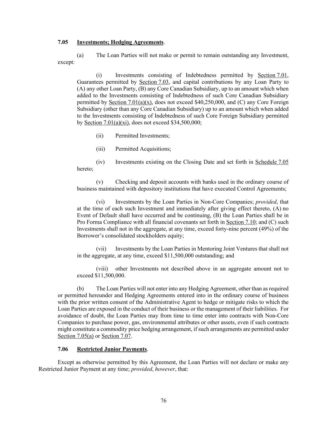 76 7.05 Investments; Hedging Agreements. (a) The Loan Parties will not make or permit to remain outstanding any Investment, except: (i) Investments consisting of Indebtedness permitted by Section 7.01, Guarantees permitted by Section 7.03, and capital contributions by any Loan Party to (A) any other Loan Party, (B) any Core Canadian Subsidiary, up to an amount which when added to the Investments consisting of Indebtedness of such Core Canadian Subsidiary permitted by Section 7.01(a)(x), does not exceed $40,250,000, and (C) any Core Foreign Subsidiary (other than any Core Canadian Subsidiary) up to an amount which when added to the Investments consisting of Indebtedness of such Core Foreign Subsidiary permitted by Section 7.01(a)(xi), does not exceed $34,500,000; (ii) Permitted Investments; (iii) Permitted Acquisitions; (iv) Investments existing on the Closing Date and set forth in Schedule 7.05 hereto; (v) Checking and deposit accounts with banks used in the ordinary course of business maintained with depository institutions that have executed Control Agreements; (vi) Investments by the Loan Parties in Non-Core Companies; provided, that at the time of each such Investment and immediately after giving effect thereto, (A) no Event of Default shall have occurred and be continuing, (B) the Loan Parties shall be in Pro Forma Compliance with all financial covenants set forth in Section 7.10; and (C) such Investments shall not in the aggregate, at any time, exceed forty-nine percent (49%) of the Borrower’s consolidated stockholders equity; (vii) Investments by the Loan Parties in Mentoring Joint Ventures that shall not in the aggregate, at any time, exceed $11,500,000 outstanding; and (viii) other Investments not described above in an aggregate amount not to exceed $11,500,000. (b) The Loan Parties will not enter into any Hedging Agreement, other than as required or permitted hereunder and Hedging Agreements entered into in the ordinary course of business with the prior written consent of the Administrative Agent to hedge or mitigate risks to which the Loan Parties are exposed in the conduct of their business or the management of their liabilities. For avoidance of doubt, the Loan Parties may from time to time enter into contracts with Non-Core Companies to purchase power, gas, environmental attributes or other assets, even if such contracts might constitute a commodity price hedging arrangement, if such arrangements are permitted under Section 7.05(a) or Section 7.07. 7.06 Restricted Junior Payments. Except as otherwise permitted by this Agreement, the Loan Parties will not declare or make any Restricted Junior Payment at any time; provided, however, that: