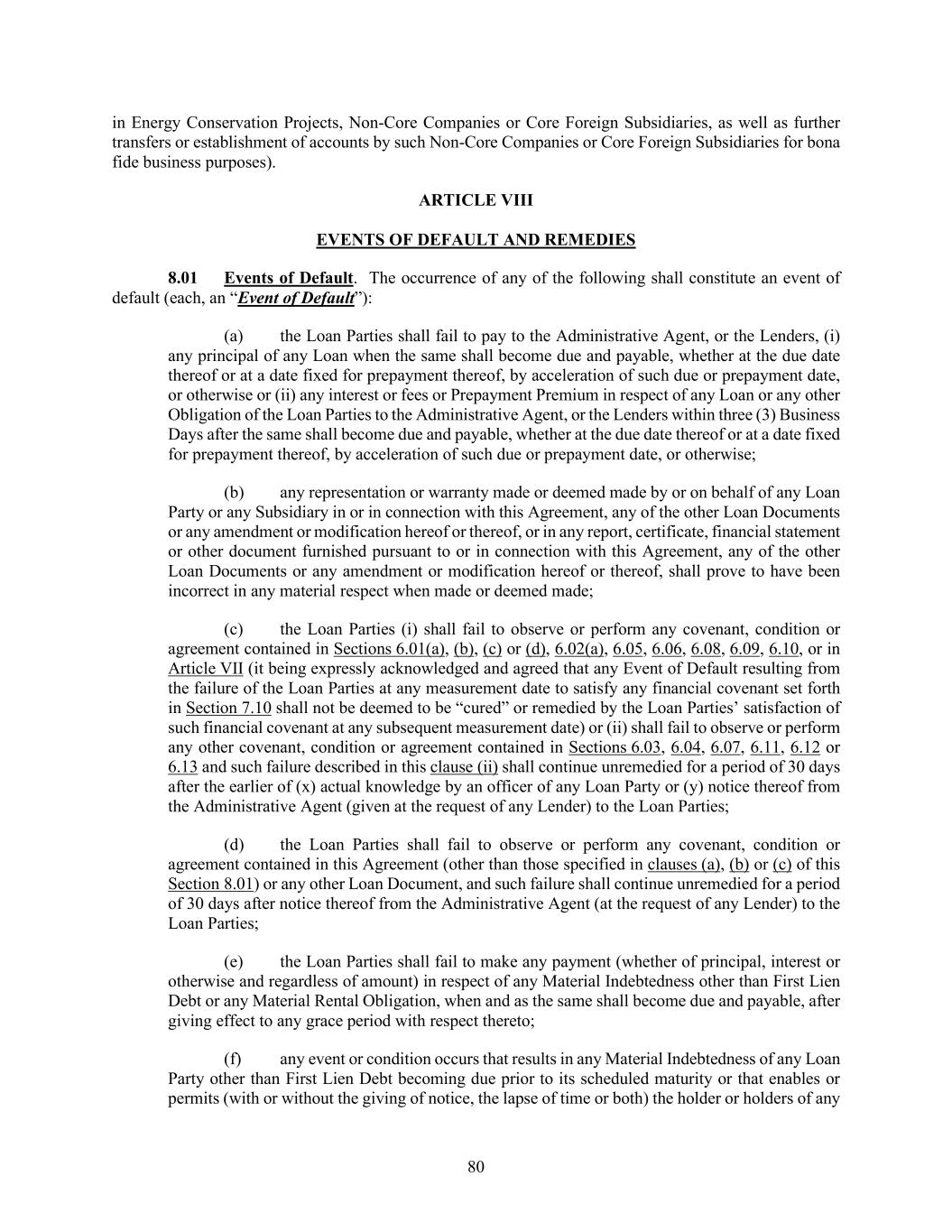 80 in Energy Conservation Projects, Non-Core Companies or Core Foreign Subsidiaries, as well as further transfers or establishment of accounts by such Non-Core Companies or Core Foreign Subsidiaries for bona fide business purposes). ARTICLE VIII EVENTS OF DEFAULT AND REMEDIES 8.01 Events of Default. The occurrence of any of the following shall constitute an event of default (each, an “Event of Default”): (a) the Loan Parties shall fail to pay to the Administrative Agent, or the Lenders, (i) any principal of any Loan when the same shall become due and payable, whether at the due date thereof or at a date fixed for prepayment thereof, by acceleration of such due or prepayment date, or otherwise or (ii) any interest or fees or Prepayment Premium in respect of any Loan or any other Obligation of the Loan Parties to the Administrative Agent, or the Lenders within three (3) Business Days after the same shall become due and payable, whether at the due date thereof or at a date fixed for prepayment thereof, by acceleration of such due or prepayment date, or otherwise; (b) any representation or warranty made or deemed made by or on behalf of any Loan Party or any Subsidiary in or in connection with this Agreement, any of the other Loan Documents or any amendment or modification hereof or thereof, or in any report, certificate, financial statement or other document furnished pursuant to or in connection with this Agreement, any of the other Loan Documents or any amendment or modification hereof or thereof, shall prove to have been incorrect in any material respect when made or deemed made; (c) the Loan Parties (i) shall fail to observe or perform any covenant, condition or agreement contained in Sections 6.01(a), (b), (c) or (d), 6.02(a), 6.05, 6.06, 6.08, 6.09, 6.10, or in Article VII (it being expressly acknowledged and agreed that any Event of Default resulting from the failure of the Loan Parties at any measurement date to satisfy any financial covenant set forth in Section 7.10 shall not be deemed to be “cured” or remedied by the Loan Parties’ satisfaction of such financial covenant at any subsequent measurement date) or (ii) shall fail to observe or perform any other covenant, condition or agreement contained in Sections 6.03, 6.04, 6.07, 6.11, 6.12 or 6.13 and such failure described in this clause (ii) shall continue unremedied for a period of 30 days after the earlier of (x) actual knowledge by an officer of any Loan Party or (y) notice thereof from the Administrative Agent (given at the request of any Lender) to the Loan Parties; (d) the Loan Parties shall fail to observe or perform any covenant, condition or agreement contained in this Agreement (other than those specified in clauses (a), (b) or (c) of this Section 8.01) or any other Loan Document, and such failure shall continue unremedied for a period of 30 days after notice thereof from the Administrative Agent (at the request of any Lender) to the Loan Parties; (e) the Loan Parties shall fail to make any payment (whether of principal, interest or otherwise and regardless of amount) in respect of any Material Indebtedness other than First Lien Debt or any Material Rental Obligation, when and as the same shall become due and payable, after giving effect to any grace period with respect thereto; (f) any event or condition occurs that results in any Material Indebtedness of any Loan Party other than First Lien Debt becoming due prior to its scheduled maturity or that enables or permits (with or without the giving of notice, the lapse of time or both) the holder or holders of any