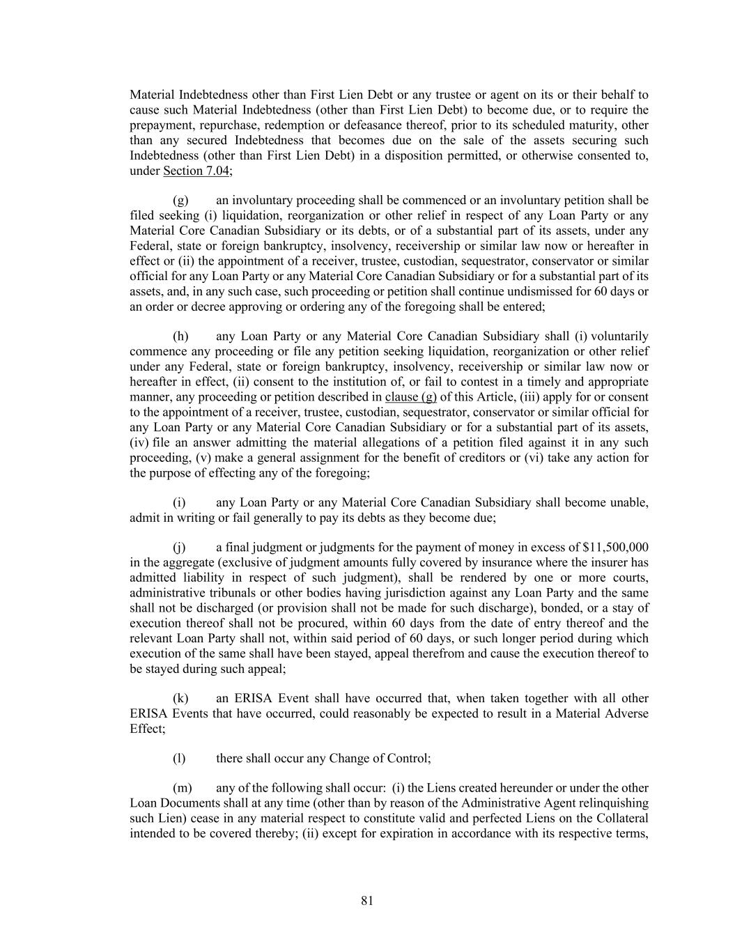 81 Material Indebtedness other than First Lien Debt or any trustee or agent on its or their behalf to cause such Material Indebtedness (other than First Lien Debt) to become due, or to require the prepayment, repurchase, redemption or defeasance thereof, prior to its scheduled maturity, other than any secured Indebtedness that becomes due on the sale of the assets securing such Indebtedness (other than First Lien Debt) in a disposition permitted, or otherwise consented to, under Section 7.04; (g) an involuntary proceeding shall be commenced or an involuntary petition shall be filed seeking (i) liquidation, reorganization or other relief in respect of any Loan Party or any Material Core Canadian Subsidiary or its debts, or of a substantial part of its assets, under any Federal, state or foreign bankruptcy, insolvency, receivership or similar law now or hereafter in effect or (ii) the appointment of a receiver, trustee, custodian, sequestrator, conservator or similar official for any Loan Party or any Material Core Canadian Subsidiary or for a substantial part of its assets, and, in any such case, such proceeding or petition shall continue undismissed for 60 days or an order or decree approving or ordering any of the foregoing shall be entered; (h) any Loan Party or any Material Core Canadian Subsidiary shall (i) voluntarily commence any proceeding or file any petition seeking liquidation, reorganization or other relief under any Federal, state or foreign bankruptcy, insolvency, receivership or similar law now or hereafter in effect, (ii) consent to the institution of, or fail to contest in a timely and appropriate manner, any proceeding or petition described in clause (g) of this Article, (iii) apply for or consent to the appointment of a receiver, trustee, custodian, sequestrator, conservator or similar official for any Loan Party or any Material Core Canadian Subsidiary or for a substantial part of its assets, (iv) file an answer admitting the material allegations of a petition filed against it in any such proceeding, (v) make a general assignment for the benefit of creditors or (vi) take any action for the purpose of effecting any of the foregoing; (i) any Loan Party or any Material Core Canadian Subsidiary shall become unable, admit in writing or fail generally to pay its debts as they become due; (j) a final judgment or judgments for the payment of money in excess of $11,500,000 in the aggregate (exclusive of judgment amounts fully covered by insurance where the insurer has admitted liability in respect of such judgment), shall be rendered by one or more courts, administrative tribunals or other bodies having jurisdiction against any Loan Party and the same shall not be discharged (or provision shall not be made for such discharge), bonded, or a stay of execution thereof shall not be procured, within 60 days from the date of entry thereof and the relevant Loan Party shall not, within said period of 60 days, or such longer period during which execution of the same shall have been stayed, appeal therefrom and cause the execution thereof to be stayed during such appeal; (k) an ERISA Event shall have occurred that, when taken together with all other ERISA Events that have occurred, could reasonably be expected to result in a Material Adverse Effect; (l) there shall occur any Change of Control; (m) any of the following shall occur: (i) the Liens created hereunder or under the other Loan Documents shall at any time (other than by reason of the Administrative Agent relinquishing such Lien) cease in any material respect to constitute valid and perfected Liens on the Collateral intended to be covered thereby; (ii) except for expiration in accordance with its respective terms,