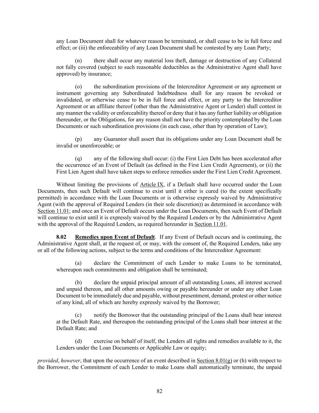 82 any Loan Document shall for whatever reason be terminated, or shall cease to be in full force and effect; or (iii) the enforceability of any Loan Document shall be contested by any Loan Party; (n) there shall occur any material loss theft, damage or destruction of any Collateral not fully covered (subject to such reasonable deductibles as the Administrative Agent shall have approved) by insurance; (o) the subordination provisions of the Intercreditor Agreement or any agreement or instrument governing any Subordinated Indebtedness shall for any reason be revoked or invalidated, or otherwise cease to be in full force and effect, or any party to the Intercreditor Agreement or an affiliate thereof (other than the Administrative Agent or Lender) shall contest in any manner the validity or enforceability thereof or deny that it has any further liability or obligation thereunder, or the Obligations, for any reason shall not have the priority contemplated by the Loan Documents or such subordination provisions (in each case, other than by operation of Law); (p) any Guarantor shall assert that its obligations under any Loan Document shall be invalid or unenforceable; or (q) any of the following shall occur: (i) the First Lien Debt has been accelerated after the occurrence of an Event of Default (as defined in the First Lien Credit Agreement), or (ii) the First Lien Agent shall have taken steps to enforce remedies under the First Lien Credit Agreement. Without limiting the provisions of Article IX, if a Default shall have occurred under the Loan Documents, then such Default will continue to exist until it either is cured (to the extent specifically permitted) in accordance with the Loan Documents or is otherwise expressly waived by Administrative Agent (with the approval of Required Lenders (in their sole discretion)) as determined in accordance with Section 11.01; and once an Event of Default occurs under the Loan Documents, then such Event of Default will continue to exist until it is expressly waived by the Required Lenders or by the Administrative Agent with the approval of the Required Lenders, as required hereunder in Section 11.01. 8.02 Remedies upon Event of Default. If any Event of Default occurs and is continuing, the Administrative Agent shall, at the request of, or may, with the consent of, the Required Lenders, take any or all of the following actions, subject to the terms and conditions of the Intercreditor Agreement: (a) declare the Commitment of each Lender to make Loans to be terminated, whereupon such commitments and obligation shall be terminated; (b) declare the unpaid principal amount of all outstanding Loans, all interest accrued and unpaid thereon, and all other amounts owing or payable hereunder or under any other Loan Document to be immediately due and payable, without presentment, demand, protest or other notice of any kind, all of which are hereby expressly waived by the Borrower; (c) notify the Borrower that the outstanding principal of the Loans shall bear interest at the Default Rate, and thereupon the outstanding principal of the Loans shall bear interest at the Default Rate; and (d) exercise on behalf of itself, the Lenders all rights and remedies available to it, the Lenders under the Loan Documents or Applicable Law or equity; provided, however, that upon the occurrence of an event described in Section 8.01(g) or (h) with respect to the Borrower, the Commitment of each Lender to make Loans shall automatically terminate, the unpaid