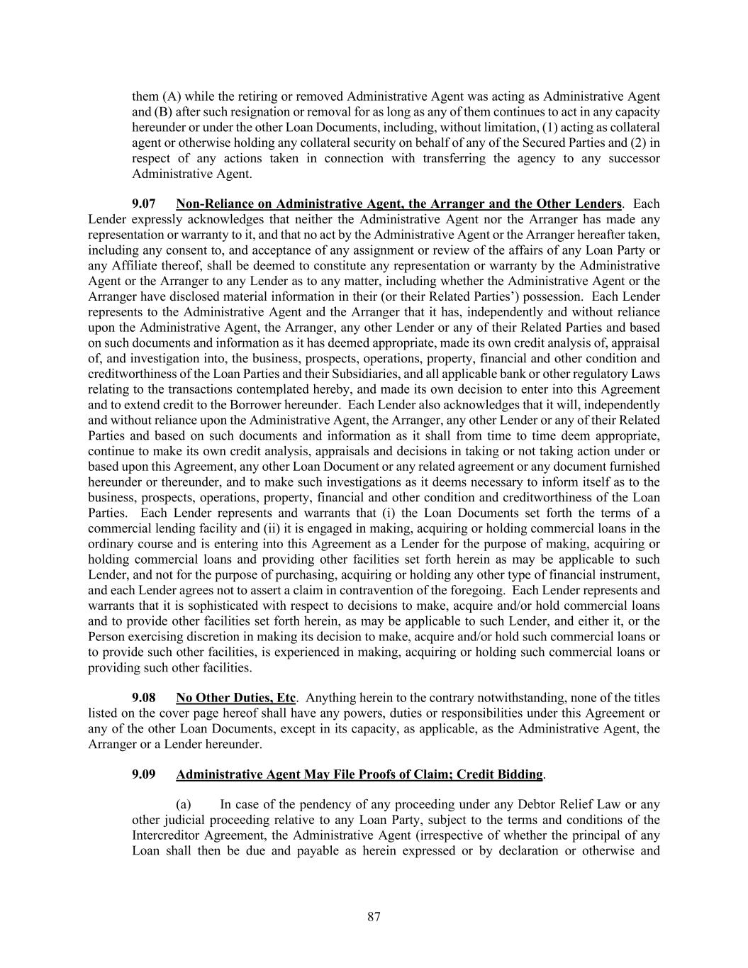 87 them (A) while the retiring or removed Administrative Agent was acting as Administrative Agent and (B) after such resignation or removal for as long as any of them continues to act in any capacity hereunder or under the other Loan Documents, including, without limitation, (1) acting as collateral agent or otherwise holding any collateral security on behalf of any of the Secured Parties and (2) in respect of any actions taken in connection with transferring the agency to any successor Administrative Agent. 9.07 Non-Reliance on Administrative Agent, the Arranger and the Other Lenders. Each Lender expressly acknowledges that neither the Administrative Agent nor the Arranger has made any representation or warranty to it, and that no act by the Administrative Agent or the Arranger hereafter taken, including any consent to, and acceptance of any assignment or review of the affairs of any Loan Party or any Affiliate thereof, shall be deemed to constitute any representation or warranty by the Administrative Agent or the Arranger to any Lender as to any matter, including whether the Administrative Agent or the Arranger have disclosed material information in their (or their Related Parties’) possession. Each Lender represents to the Administrative Agent and the Arranger that it has, independently and without reliance upon the Administrative Agent, the Arranger, any other Lender or any of their Related Parties and based on such documents and information as it has deemed appropriate, made its own credit analysis of, appraisal of, and investigation into, the business, prospects, operations, property, financial and other condition and creditworthiness of the Loan Parties and their Subsidiaries, and all applicable bank or other regulatory Laws relating to the transactions contemplated hereby, and made its own decision to enter into this Agreement and to extend credit to the Borrower hereunder. Each Lender also acknowledges that it will, independently and without reliance upon the Administrative Agent, the Arranger, any other Lender or any of their Related Parties and based on such documents and information as it shall from time to time deem appropriate, continue to make its own credit analysis, appraisals and decisions in taking or not taking action under or based upon this Agreement, any other Loan Document or any related agreement or any document furnished hereunder or thereunder, and to make such investigations as it deems necessary to inform itself as to the business, prospects, operations, property, financial and other condition and creditworthiness of the Loan Parties. Each Lender represents and warrants that (i) the Loan Documents set forth the terms of a commercial lending facility and (ii) it is engaged in making, acquiring or holding commercial loans in the ordinary course and is entering into this Agreement as a Lender for the purpose of making, acquiring or holding commercial loans and providing other facilities set forth herein as may be applicable to such Lender, and not for the purpose of purchasing, acquiring or holding any other type of financial instrument, and each Lender agrees not to assert a claim in contravention of the foregoing. Each Lender represents and warrants that it is sophisticated with respect to decisions to make, acquire and/or hold commercial loans and to provide other facilities set forth herein, as may be applicable to such Lender, and either it, or the Person exercising discretion in making its decision to make, acquire and/or hold such commercial loans or to provide such other facilities, is experienced in making, acquiring or holding such commercial loans or providing such other facilities. 9.08 No Other Duties, Etc. Anything herein to the contrary notwithstanding, none of the titles listed on the cover page hereof shall have any powers, duties or responsibilities under this Agreement or any of the other Loan Documents, except in its capacity, as applicable, as the Administrative Agent, the Arranger or a Lender hereunder. 9.09 Administrative Agent May File Proofs of Claim; Credit Bidding. (a) In case of the pendency of any proceeding under any Debtor Relief Law or any other judicial proceeding relative to any Loan Party, subject to the terms and conditions of the Intercreditor Agreement, the Administrative Agent (irrespective of whether the principal of any Loan shall then be due and payable as herein expressed or by declaration or otherwise and