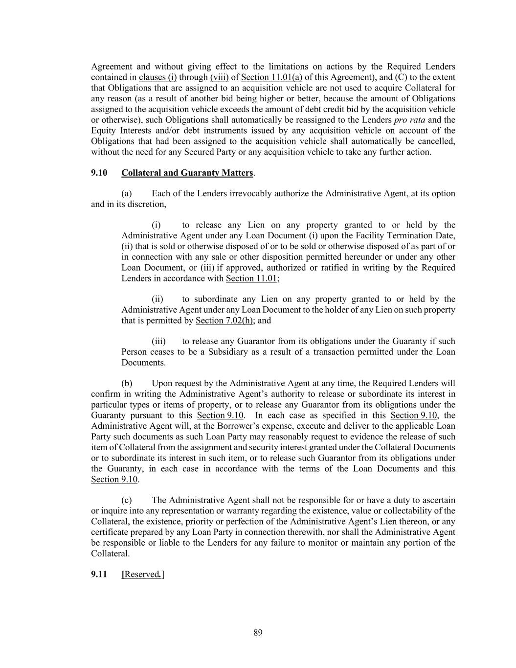 89 Agreement and without giving effect to the limitations on actions by the Required Lenders contained in clauses (i) through (viii) of Section 11.01(a) of this Agreement), and (C) to the extent that Obligations that are assigned to an acquisition vehicle are not used to acquire Collateral for any reason (as a result of another bid being higher or better, because the amount of Obligations assigned to the acquisition vehicle exceeds the amount of debt credit bid by the acquisition vehicle or otherwise), such Obligations shall automatically be reassigned to the Lenders pro rata and the Equity Interests and/or debt instruments issued by any acquisition vehicle on account of the Obligations that had been assigned to the acquisition vehicle shall automatically be cancelled, without the need for any Secured Party or any acquisition vehicle to take any further action. 9.10 Collateral and Guaranty Matters. (a) Each of the Lenders irrevocably authorize the Administrative Agent, at its option and in its discretion, (i) to release any Lien on any property granted to or held by the Administrative Agent under any Loan Document (i) upon the Facility Termination Date, (ii) that is sold or otherwise disposed of or to be sold or otherwise disposed of as part of or in connection with any sale or other disposition permitted hereunder or under any other Loan Document, or (iii) if approved, authorized or ratified in writing by the Required Lenders in accordance with Section 11.01; (ii) to subordinate any Lien on any property granted to or held by the Administrative Agent under any Loan Document to the holder of any Lien on such property that is permitted by Section 7.02(h); and (iii) to release any Guarantor from its obligations under the Guaranty if such Person ceases to be a Subsidiary as a result of a transaction permitted under the Loan Documents. (b) Upon request by the Administrative Agent at any time, the Required Lenders will confirm in writing the Administrative Agent’s authority to release or subordinate its interest in particular types or items of property, or to release any Guarantor from its obligations under the Guaranty pursuant to this Section 9.10. In each case as specified in this Section 9.10, the Administrative Agent will, at the Borrower’s expense, execute and deliver to the applicable Loan Party such documents as such Loan Party may reasonably request to evidence the release of such item of Collateral from the assignment and security interest granted under the Collateral Documents or to subordinate its interest in such item, or to release such Guarantor from its obligations under the Guaranty, in each case in accordance with the terms of the Loan Documents and this Section 9.10. (c) The Administrative Agent shall not be responsible for or have a duty to ascertain or inquire into any representation or warranty regarding the existence, value or collectability of the Collateral, the existence, priority or perfection of the Administrative Agent’s Lien thereon, or any certificate prepared by any Loan Party in connection therewith, nor shall the Administrative Agent be responsible or liable to the Lenders for any failure to monitor or maintain any portion of the Collateral. 9.11 [Reserved.]
