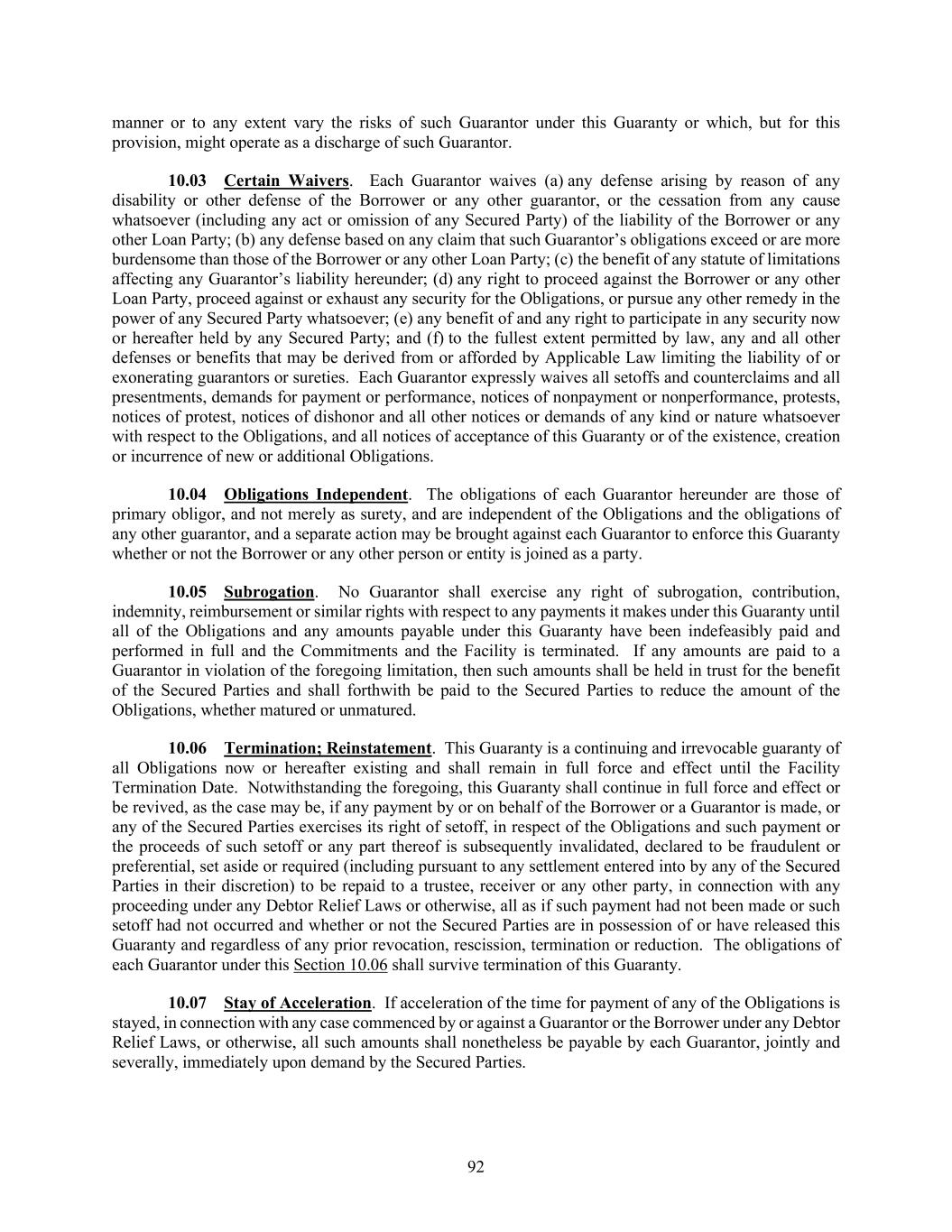 92 manner or to any extent vary the risks of such Guarantor under this Guaranty or which, but for this provision, might operate as a discharge of such Guarantor. 10.03 Certain Waivers. Each Guarantor waives (a) any defense arising by reason of any disability or other defense of the Borrower or any other guarantor, or the cessation from any cause whatsoever (including any act or omission of any Secured Party) of the liability of the Borrower or any other Loan Party; (b) any defense based on any claim that such Guarantor’s obligations exceed or are more burdensome than those of the Borrower or any other Loan Party; (c) the benefit of any statute of limitations affecting any Guarantor’s liability hereunder; (d) any right to proceed against the Borrower or any other Loan Party, proceed against or exhaust any security for the Obligations, or pursue any other remedy in the power of any Secured Party whatsoever; (e) any benefit of and any right to participate in any security now or hereafter held by any Secured Party; and (f) to the fullest extent permitted by law, any and all other defenses or benefits that may be derived from or afforded by Applicable Law limiting the liability of or exonerating guarantors or sureties. Each Guarantor expressly waives all setoffs and counterclaims and all presentments, demands for payment or performance, notices of nonpayment or nonperformance, protests, notices of protest, notices of dishonor and all other notices or demands of any kind or nature whatsoever with respect to the Obligations, and all notices of acceptance of this Guaranty or of the existence, creation or incurrence of new or additional Obligations. 10.04 Obligations Independent. The obligations of each Guarantor hereunder are those of primary obligor, and not merely as surety, and are independent of the Obligations and the obligations of any other guarantor, and a separate action may be brought against each Guarantor to enforce this Guaranty whether or not the Borrower or any other person or entity is joined as a party. 10.05 Subrogation. No Guarantor shall exercise any right of subrogation, contribution, indemnity, reimbursement or similar rights with respect to any payments it makes under this Guaranty until all of the Obligations and any amounts payable under this Guaranty have been indefeasibly paid and performed in full and the Commitments and the Facility is terminated. If any amounts are paid to a Guarantor in violation of the foregoing limitation, then such amounts shall be held in trust for the benefit of the Secured Parties and shall forthwith be paid to the Secured Parties to reduce the amount of the Obligations, whether matured or unmatured. 10.06 Termination; Reinstatement. This Guaranty is a continuing and irrevocable guaranty of all Obligations now or hereafter existing and shall remain in full force and effect until the Facility Termination Date. Notwithstanding the foregoing, this Guaranty shall continue in full force and effect or be revived, as the case may be, if any payment by or on behalf of the Borrower or a Guarantor is made, or any of the Secured Parties exercises its right of setoff, in respect of the Obligations and such payment or the proceeds of such setoff or any part thereof is subsequently invalidated, declared to be fraudulent or preferential, set aside or required (including pursuant to any settlement entered into by any of the Secured Parties in their discretion) to be repaid to a trustee, receiver or any other party, in connection with any proceeding under any Debtor Relief Laws or otherwise, all as if such payment had not been made or such setoff had not occurred and whether or not the Secured Parties are in possession of or have released this Guaranty and regardless of any prior revocation, rescission, termination or reduction. The obligations of each Guarantor under this Section 10.06 shall survive termination of this Guaranty. 10.07 Stay of Acceleration. If acceleration of the time for payment of any of the Obligations is stayed, in connection with any case commenced by or against a Guarantor or the Borrower under any Debtor Relief Laws, or otherwise, all such amounts shall nonetheless be payable by each Guarantor, jointly and severally, immediately upon demand by the Secured Parties.