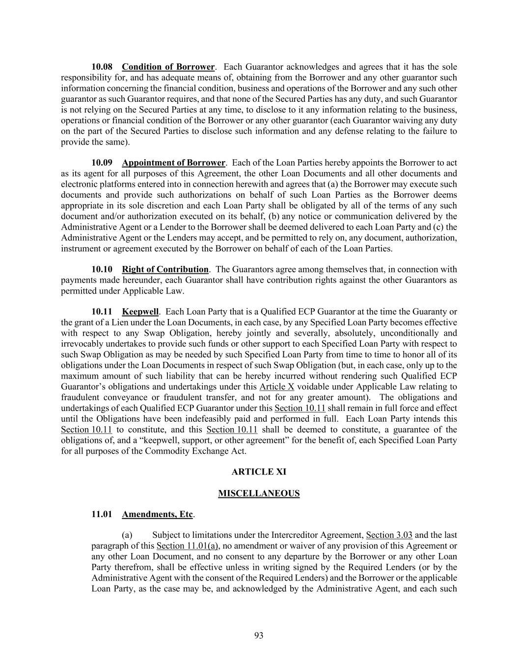 93 10.08 Condition of Borrower. Each Guarantor acknowledges and agrees that it has the sole responsibility for, and has adequate means of, obtaining from the Borrower and any other guarantor such information concerning the financial condition, business and operations of the Borrower and any such other guarantor as such Guarantor requires, and that none of the Secured Parties has any duty, and such Guarantor is not relying on the Secured Parties at any time, to disclose to it any information relating to the business, operations or financial condition of the Borrower or any other guarantor (each Guarantor waiving any duty on the part of the Secured Parties to disclose such information and any defense relating to the failure to provide the same). 10.09 Appointment of Borrower. Each of the Loan Parties hereby appoints the Borrower to act as its agent for all purposes of this Agreement, the other Loan Documents and all other documents and electronic platforms entered into in connection herewith and agrees that (a) the Borrower may execute such documents and provide such authorizations on behalf of such Loan Parties as the Borrower deems appropriate in its sole discretion and each Loan Party shall be obligated by all of the terms of any such document and/or authorization executed on its behalf, (b) any notice or communication delivered by the Administrative Agent or a Lender to the Borrower shall be deemed delivered to each Loan Party and (c) the Administrative Agent or the Lenders may accept, and be permitted to rely on, any document, authorization, instrument or agreement executed by the Borrower on behalf of each of the Loan Parties. 10.10 Right of Contribution. The Guarantors agree among themselves that, in connection with payments made hereunder, each Guarantor shall have contribution rights against the other Guarantors as permitted under Applicable Law. 10.11 Keepwell. Each Loan Party that is a Qualified ECP Guarantor at the time the Guaranty or the grant of a Lien under the Loan Documents, in each case, by any Specified Loan Party becomes effective with respect to any Swap Obligation, hereby jointly and severally, absolutely, unconditionally and irrevocably undertakes to provide such funds or other support to each Specified Loan Party with respect to such Swap Obligation as may be needed by such Specified Loan Party from time to time to honor all of its obligations under the Loan Documents in respect of such Swap Obligation (but, in each case, only up to the maximum amount of such liability that can be hereby incurred without rendering such Qualified ECP Guarantor’s obligations and undertakings under this Article X voidable under Applicable Law relating to fraudulent conveyance or fraudulent transfer, and not for any greater amount). The obligations and undertakings of each Qualified ECP Guarantor under this Section 10.11 shall remain in full force and effect until the Obligations have been indefeasibly paid and performed in full. Each Loan Party intends this Section 10.11 to constitute, and this Section 10.11 shall be deemed to constitute, a guarantee of the obligations of, and a “keepwell, support, or other agreement” for the benefit of, each Specified Loan Party for all purposes of the Commodity Exchange Act. ARTICLE XI MISCELLANEOUS 11.01 Amendments, Etc. (a) Subject to limitations under the Intercreditor Agreement, Section 3.03 and the last paragraph of this Section 11.01(a), no amendment or waiver of any provision of this Agreement or any other Loan Document, and no consent to any departure by the Borrower or any other Loan Party therefrom, shall be effective unless in writing signed by the Required Lenders (or by the Administrative Agent with the consent of the Required Lenders) and the Borrower or the applicable Loan Party, as the case may be, and acknowledged by the Administrative Agent, and each such