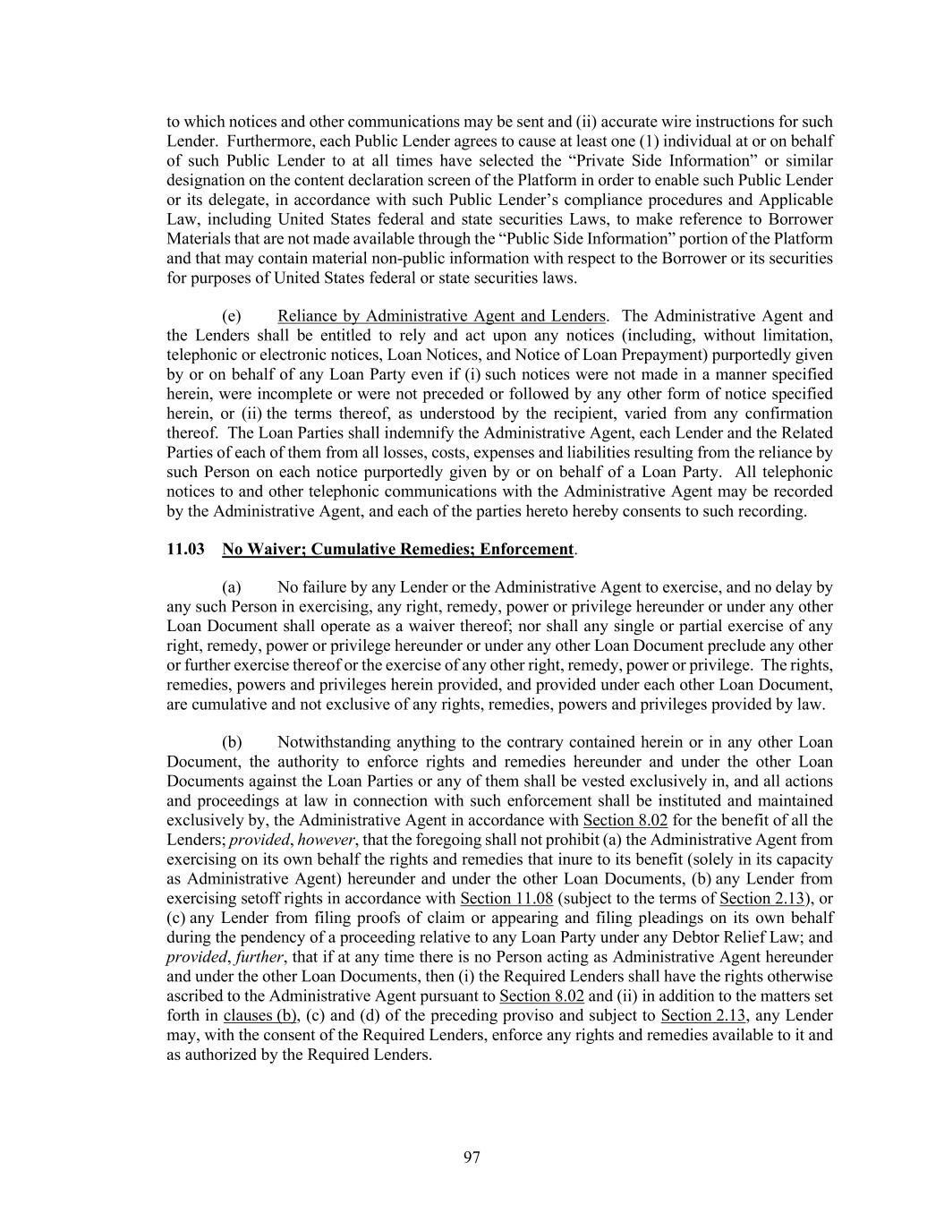97 to which notices and other communications may be sent and (ii) accurate wire instructions for such Lender. Furthermore, each Public Lender agrees to cause at least one (1) individual at or on behalf of such Public Lender to at all times have selected the “Private Side Information” or similar designation on the content declaration screen of the Platform in order to enable such Public Lender or its delegate, in accordance with such Public Lender’s compliance procedures and Applicable Law, including United States federal and state securities Laws, to make reference to Borrower Materials that are not made available through the “Public Side Information” portion of the Platform and that may contain material non-public information with respect to the Borrower or its securities for purposes of United States federal or state securities laws. (e) Reliance by Administrative Agent and Lenders. The Administrative Agent and the Lenders shall be entitled to rely and act upon any notices (including, without limitation, telephonic or electronic notices, Loan Notices, and Notice of Loan Prepayment) purportedly given by or on behalf of any Loan Party even if (i) such notices were not made in a manner specified herein, were incomplete or were not preceded or followed by any other form of notice specified herein, or (ii) the terms thereof, as understood by the recipient, varied from any confirmation thereof. The Loan Parties shall indemnify the Administrative Agent, each Lender and the Related Parties of each of them from all losses, costs, expenses and liabilities resulting from the reliance by such Person on each notice purportedly given by or on behalf of a Loan Party. All telephonic notices to and other telephonic communications with the Administrative Agent may be recorded by the Administrative Agent, and each of the parties hereto hereby consents to such recording. 11.03 No Waiver; Cumulative Remedies; Enforcement. (a) No failure by any Lender or the Administrative Agent to exercise, and no delay by any such Person in exercising, any right, remedy, power or privilege hereunder or under any other Loan Document shall operate as a waiver thereof; nor shall any single or partial exercise of any right, remedy, power or privilege hereunder or under any other Loan Document preclude any other or further exercise thereof or the exercise of any other right, remedy, power or privilege. The rights, remedies, powers and privileges herein provided, and provided under each other Loan Document, are cumulative and not exclusive of any rights, remedies, powers and privileges provided by law. (b) Notwithstanding anything to the contrary contained herein or in any other Loan Document, the authority to enforce rights and remedies hereunder and under the other Loan Documents against the Loan Parties or any of them shall be vested exclusively in, and all actions and proceedings at law in connection with such enforcement shall be instituted and maintained exclusively by, the Administrative Agent in accordance with Section 8.02 for the benefit of all the Lenders; provided, however, that the foregoing shall not prohibit (a) the Administrative Agent from exercising on its own behalf the rights and remedies that inure to its benefit (solely in its capacity as Administrative Agent) hereunder and under the other Loan Documents, (b) any Lender from exercising setoff rights in accordance with Section 11.08 (subject to the terms of Section 2.13), or (c) any Lender from filing proofs of claim or appearing and filing pleadings on its own behalf during the pendency of a proceeding relative to any Loan Party under any Debtor Relief Law; and provided, further, that if at any time there is no Person acting as Administrative Agent hereunder and under the other Loan Documents, then (i) the Required Lenders shall have the rights otherwise ascribed to the Administrative Agent pursuant to Section 8.02 and (ii) in addition to the matters set forth in clauses (b), (c) and (d) of the preceding proviso and subject to Section 2.13, any Lender may, with the consent of the Required Lenders, enforce any rights and remedies available to it and as authorized by the Required Lenders.