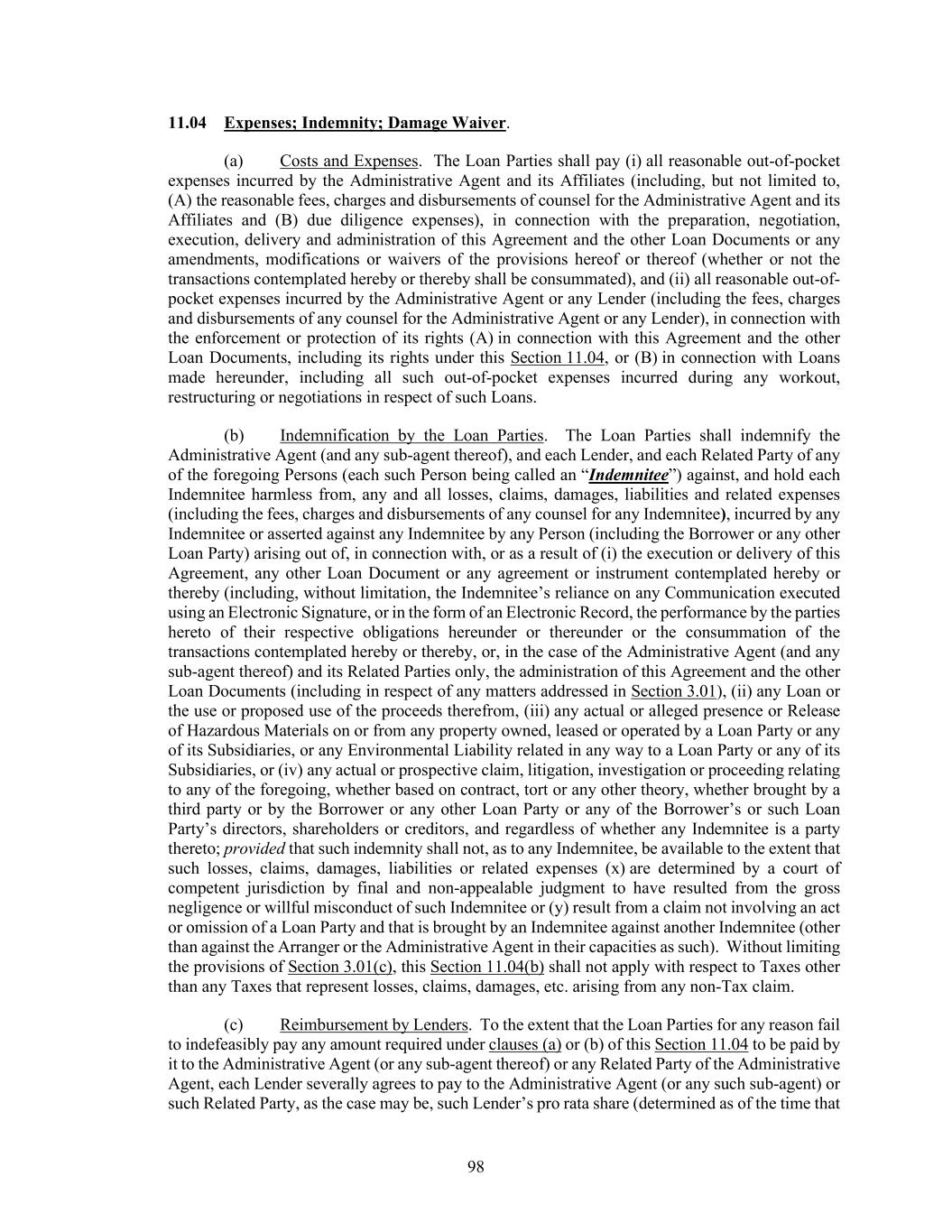 98 11.04 Expenses; Indemnity; Damage Waiver. (a) Costs and Expenses. The Loan Parties shall pay (i) all reasonable out-of-pocket expenses incurred by the Administrative Agent and its Affiliates (including, but not limited to, (A) the reasonable fees, charges and disbursements of counsel for the Administrative Agent and its Affiliates and (B) due diligence expenses), in connection with the preparation, negotiation, execution, delivery and administration of this Agreement and the other Loan Documents or any amendments, modifications or waivers of the provisions hereof or thereof (whether or not the transactions contemplated hereby or thereby shall be consummated), and (ii) all reasonable out-of- pocket expenses incurred by the Administrative Agent or any Lender (including the fees, charges and disbursements of any counsel for the Administrative Agent or any Lender), in connection with the enforcement or protection of its rights (A) in connection with this Agreement and the other Loan Documents, including its rights under this Section 11.04, or (B) in connection with Loans made hereunder, including all such out-of-pocket expenses incurred during any workout, restructuring or negotiations in respect of such Loans. (b) Indemnification by the Loan Parties. The Loan Parties shall indemnify the Administrative Agent (and any sub-agent thereof), and each Lender, and each Related Party of any of the foregoing Persons (each such Person being called an “Indemnitee”) against, and hold each Indemnitee harmless from, any and all losses, claims, damages, liabilities and related expenses (including the fees, charges and disbursements of any counsel for any Indemnitee), incurred by any Indemnitee or asserted against any Indemnitee by any Person (including the Borrower or any other Loan Party) arising out of, in connection with, or as a result of (i) the execution or delivery of this Agreement, any other Loan Document or any agreement or instrument contemplated hereby or thereby (including, without limitation, the Indemnitee’s reliance on any Communication executed using an Electronic Signature, or in the form of an Electronic Record, the performance by the parties hereto of their respective obligations hereunder or thereunder or the consummation of the transactions contemplated hereby or thereby, or, in the case of the Administrative Agent (and any sub-agent thereof) and its Related Parties only, the administration of this Agreement and the other Loan Documents (including in respect of any matters addressed in Section 3.01), (ii) any Loan or the use or proposed use of the proceeds therefrom, (iii) any actual or alleged presence or Release of Hazardous Materials on or from any property owned, leased or operated by a Loan Party or any of its Subsidiaries, or any Environmental Liability related in any way to a Loan Party or any of its Subsidiaries, or (iv) any actual or prospective claim, litigation, investigation or proceeding relating to any of the foregoing, whether based on contract, tort or any other theory, whether brought by a third party or by the Borrower or any other Loan Party or any of the Borrower’s or such Loan Party’s directors, shareholders or creditors, and regardless of whether any Indemnitee is a party thereto; provided that such indemnity shall not, as to any Indemnitee, be available to the extent that such losses, claims, damages, liabilities or related expenses (x) are determined by a court of competent jurisdiction by final and non-appealable judgment to have resulted from the gross negligence or willful misconduct of such Indemnitee or (y) result from a claim not involving an act or omission of a Loan Party and that is brought by an Indemnitee against another Indemnitee (other than against the Arranger or the Administrative Agent in their capacities as such). Without limiting the provisions of Section 3.01(c), this Section 11.04(b) shall not apply with respect to Taxes other than any Taxes that represent losses, claims, damages, etc. arising from any non-Tax claim. (c) Reimbursement by Lenders. To the extent that the Loan Parties for any reason fail to indefeasibly pay any amount required under clauses (a) or (b) of this Section 11.04 to be paid by it to the Administrative Agent (or any sub-agent thereof) or any Related Party of the Administrative Agent, each Lender severally agrees to pay to the Administrative Agent (or any such sub-agent) or such Related Party, as the case may be, such Lender’s pro rata share (determined as of the time that