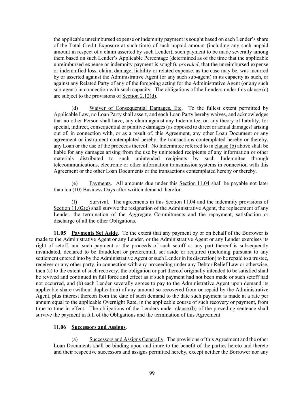 99 the applicable unreimbursed expense or indemnity payment is sought based on each Lender’s share of the Total Credit Exposure at such time) of such unpaid amount (including any such unpaid amount in respect of a claim asserted by such Lender), such payment to be made severally among them based on such Lender’s Applicable Percentage (determined as of the time that the applicable unreimbursed expense or indemnity payment is sought), provided, that the unreimbursed expense or indemnified loss, claim, damage, liability or related expense, as the case may be, was incurred by or asserted against the Administrative Agent (or any such sub-agent) in its capacity as such, or against any Related Party of any of the foregoing acting for the Administrative Agent (or any such sub-agent) in connection with such capacity. The obligations of the Lenders under this clause (c) are subject to the provisions of Section 2.12(d). (d) Waiver of Consequential Damages, Etc. To the fullest extent permitted by Applicable Law, no Loan Party shall assert, and each Loan Party hereby waives, and acknowledges that no other Person shall have, any claim against any Indemnitee, on any theory of liability, for special, indirect, consequential or punitive damages (as opposed to direct or actual damages) arising out of, in connection with, or as a result of, this Agreement, any other Loan Document or any agreement or instrument contemplated hereby, the transactions contemplated hereby or thereby, any Loan or the use of the proceeds thereof. No Indemnitee referred to in clause (b) above shall be liable for any damages arising from the use by unintended recipients of any information or other materials distributed to such unintended recipients by such Indemnitee through telecommunications, electronic or other information transmission systems in connection with this Agreement or the other Loan Documents or the transactions contemplated hereby or thereby. (e) Payments. All amounts due under this Section 11.04 shall be payable not later than ten (10) Business Days after written demand therefor. (f) Survival. The agreements in this Section 11.04 and the indemnity provisions of Section 11.02(e) shall survive the resignation of the Administrative Agent, the replacement of any Lender, the termination of the Aggregate Commitments and the repayment, satisfaction or discharge of all the other Obligations. 11.05 Payments Set Aside. To the extent that any payment by or on behalf of the Borrower is made to the Administrative Agent or any Lender, or the Administrative Agent or any Lender exercises its right of setoff, and such payment or the proceeds of such setoff or any part thereof is subsequently invalidated, declared to be fraudulent or preferential, set aside or required (including pursuant to any settlement entered into by the Administrative Agent or such Lender in its discretion) to be repaid to a trustee, receiver or any other party, in connection with any proceeding under any Debtor Relief Law or otherwise, then (a) to the extent of such recovery, the obligation or part thereof originally intended to be satisfied shall be revived and continued in full force and effect as if such payment had not been made or such setoff had not occurred, and (b) each Lender severally agrees to pay to the Administrative Agent upon demand its applicable share (without duplication) of any amount so recovered from or repaid by the Administrative Agent, plus interest thereon from the date of such demand to the date such payment is made at a rate per annum equal to the applicable Overnight Rate, in the applicable course of such recovery or payment, from time to time in effect. The obligations of the Lenders under clause (b) of the preceding sentence shall survive the payment in full of the Obligations and the termination of this Agreement. 11.06 Successors and Assigns. (a) Successors and Assigns Generally. The provisions of this Agreement and the other Loan Documents shall be binding upon and inure to the benefit of the parties hereto and thereto and their respective successors and assigns permitted hereby, except neither the Borrower nor any