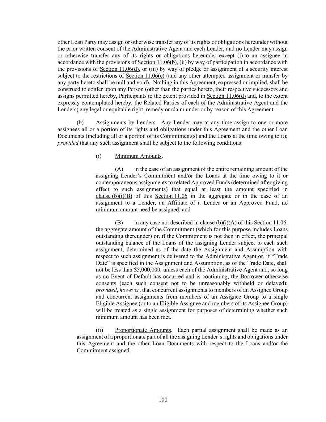 100 other Loan Party may assign or otherwise transfer any of its rights or obligations hereunder without the prior written consent of the Administrative Agent and each Lender, and no Lender may assign or otherwise transfer any of its rights or obligations hereunder except (i) to an assignee in accordance with the provisions of Section 11.06(b), (ii) by way of participation in accordance with the provisions of Section 11.06(d), or (iii) by way of pledge or assignment of a security interest subject to the restrictions of Section 11.06(e) (and any other attempted assignment or transfer by any party hereto shall be null and void). Nothing in this Agreement, expressed or implied, shall be construed to confer upon any Person (other than the parties hereto, their respective successors and assigns permitted hereby, Participants to the extent provided in Section 11.06(d) and, to the extent expressly contemplated hereby, the Related Parties of each of the Administrative Agent and the Lenders) any legal or equitable right, remedy or claim under or by reason of this Agreement. (b) Assignments by Lenders. Any Lender may at any time assign to one or more assignees all or a portion of its rights and obligations under this Agreement and the other Loan Documents (including all or a portion of its Commitment(s) and the Loans at the time owing to it); provided that any such assignment shall be subject to the following conditions: (i) Minimum Amounts. (A) in the case of an assignment of the entire remaining amount of the assigning Lender’s Commitment and/or the Loans at the time owing to it or contemporaneous assignments to related Approved Funds (determined after giving effect to such assignments) that equal at least the amount specified in clause (b)(i)(B) of this Section 11.06 in the aggregate or in the case of an assignment to a Lender, an Affiliate of a Lender or an Approved Fund, no minimum amount need be assigned; and (B) in any case not described in clause (b)(i)(A) of this Section 11.06, the aggregate amount of the Commitment (which for this purpose includes Loans outstanding thereunder) or, if the Commitment is not then in effect, the principal outstanding balance of the Loans of the assigning Lender subject to each such assignment, determined as of the date the Assignment and Assumption with respect to such assignment is delivered to the Administrative Agent or, if “Trade Date” is specified in the Assignment and Assumption, as of the Trade Date, shall not be less than $5,000,000, unless each of the Administrative Agent and, so long as no Event of Default has occurred and is continuing, the Borrower otherwise consents (each such consent not to be unreasonably withheld or delayed); provided, however, that concurrent assignments to members of an Assignee Group and concurrent assignments from members of an Assignee Group to a single Eligible Assignee (or to an Eligible Assignee and members of its Assignee Group) will be treated as a single assignment for purposes of determining whether such minimum amount has been met. (ii) Proportionate Amounts. Each partial assignment shall be made as an assignment of a proportionate part of all the assigning Lender’s rights and obligations under this Agreement and the other Loan Documents with respect to the Loans and/or the Commitment assigned.