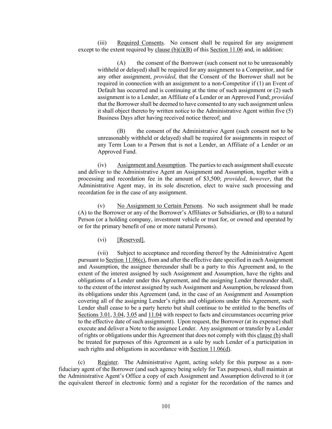 101 (iii) Required Consents. No consent shall be required for any assignment except to the extent required by clause (b)(i)(B) of this Section 11.06 and, in addition: (A) the consent of the Borrower (such consent not to be unreasonably withheld or delayed) shall be required for any assignment to a Competitor, and for any other assignment, provided, that the Consent of the Borrower shall not be required in connection with an assignment to a non-Competitor if (1) an Event of Default has occurred and is continuing at the time of such assignment or (2) such assignment is to a Lender, an Affiliate of a Lender or an Approved Fund; provided that the Borrower shall be deemed to have consented to any such assignment unless it shall object thereto by written notice to the Administrative Agent within five (5) Business Days after having received notice thereof; and (B) the consent of the Administrative Agent (such consent not to be unreasonably withheld or delayed) shall be required for assignments in respect of any Term Loan to a Person that is not a Lender, an Affiliate of a Lender or an Approved Fund. (iv) Assignment and Assumption. The parties to each assignment shall execute and deliver to the Administrative Agent an Assignment and Assumption, together with a processing and recordation fee in the amount of $3,500; provided, however, that the Administrative Agent may, in its sole discretion, elect to waive such processing and recordation fee in the case of any assignment. (v) No Assignment to Certain Persons. No such assignment shall be made (A) to the Borrower or any of the Borrower’s Affiliates or Subsidiaries, or (B) to a natural Person (or a holding company, investment vehicle or trust for, or owned and operated by or for the primary benefit of one or more natural Persons). (vi) [Reserved]. (vii) Subject to acceptance and recording thereof by the Administrative Agent pursuant to Section 11.06(c), from and after the effective date specified in each Assignment and Assumption, the assignee thereunder shall be a party to this Agreement and, to the extent of the interest assigned by such Assignment and Assumption, have the rights and obligations of a Lender under this Agreement, and the assigning Lender thereunder shall, to the extent of the interest assigned by such Assignment and Assumption, be released from its obligations under this Agreement (and, in the case of an Assignment and Assumption covering all of the assigning Lender’s rights and obligations under this Agreement, such Lender shall cease to be a party hereto but shall continue to be entitled to the benefits of Sections 3.01, 3.04, 3.05 and 11.04 with respect to facts and circumstances occurring prior to the effective date of such assignment). Upon request, the Borrower (at its expense) shall execute and deliver a Note to the assignee Lender. Any assignment or transfer by a Lender of rights or obligations under this Agreement that does not comply with this clause (b) shall be treated for purposes of this Agreement as a sale by such Lender of a participation in such rights and obligations in accordance with Section 11.06(d). (c) Register. The Administrative Agent, acting solely for this purpose as a non- fiduciary agent of the Borrower (and such agency being solely for Tax purposes), shall maintain at the Administrative Agent’s Office a copy of each Assignment and Assumption delivered to it (or the equivalent thereof in electronic form) and a register for the recordation of the names and