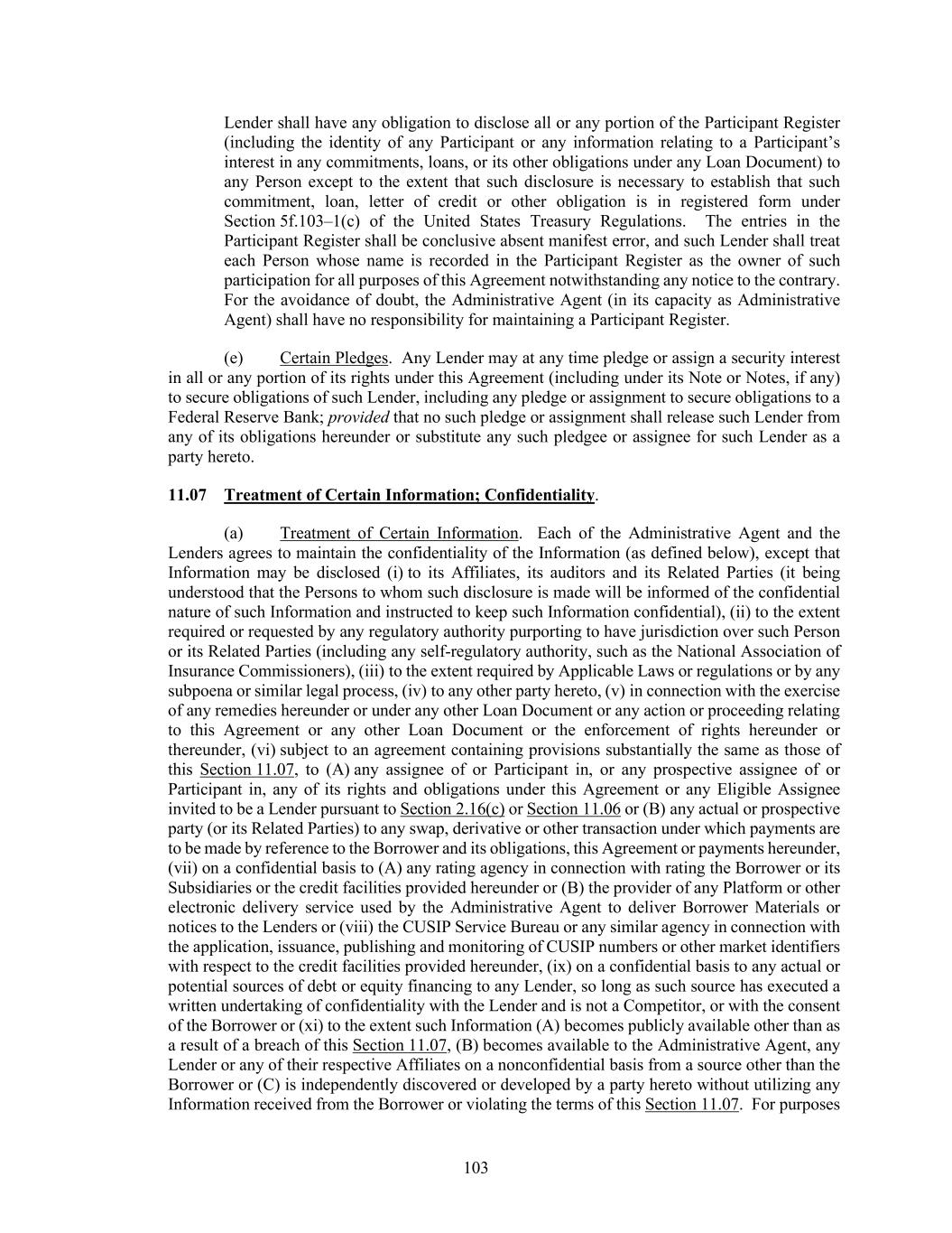 103 Lender shall have any obligation to disclose all or any portion of the Participant Register (including the identity of any Participant or any information relating to a Participant’s interest in any commitments, loans, or its other obligations under any Loan Document) to any Person except to the extent that such disclosure is necessary to establish that such commitment, loan, letter of credit or other obligation is in registered form under Section 5f.103–1(c) of the United States Treasury Regulations. The entries in the Participant Register shall be conclusive absent manifest error, and such Lender shall treat each Person whose name is recorded in the Participant Register as the owner of such participation for all purposes of this Agreement notwithstanding any notice to the contrary. For the avoidance of doubt, the Administrative Agent (in its capacity as Administrative Agent) shall have no responsibility for maintaining a Participant Register. (e) Certain Pledges. Any Lender may at any time pledge or assign a security interest in all or any portion of its rights under this Agreement (including under its Note or Notes, if any) to secure obligations of such Lender, including any pledge or assignment to secure obligations to a Federal Reserve Bank; provided that no such pledge or assignment shall release such Lender from any of its obligations hereunder or substitute any such pledgee or assignee for such Lender as a party hereto. 11.07 Treatment of Certain Information; Confidentiality. (a) Treatment of Certain Information. Each of the Administrative Agent and the Lenders agrees to maintain the confidentiality of the Information (as defined below), except that Information may be disclosed (i) to its Affiliates, its auditors and its Related Parties (it being understood that the Persons to whom such disclosure is made will be informed of the confidential nature of such Information and instructed to keep such Information confidential), (ii) to the extent required or requested by any regulatory authority purporting to have jurisdiction over such Person or its Related Parties (including any self-regulatory authority, such as the National Association of Insurance Commissioners), (iii) to the extent required by Applicable Laws or regulations or by any subpoena or similar legal process, (iv) to any other party hereto, (v) in connection with the exercise of any remedies hereunder or under any other Loan Document or any action or proceeding relating to this Agreement or any other Loan Document or the enforcement of rights hereunder or thereunder, (vi) subject to an agreement containing provisions substantially the same as those of this Section 11.07, to (A) any assignee of or Participant in, or any prospective assignee of or Participant in, any of its rights and obligations under this Agreement or any Eligible Assignee invited to be a Lender pursuant to Section 2.16(c) or Section 11.06 or (B) any actual or prospective party (or its Related Parties) to any swap, derivative or other transaction under which payments are to be made by reference to the Borrower and its obligations, this Agreement or payments hereunder, (vii) on a confidential basis to (A) any rating agency in connection with rating the Borrower or its Subsidiaries or the credit facilities provided hereunder or (B) the provider of any Platform or other electronic delivery service used by the Administrative Agent to deliver Borrower Materials or notices to the Lenders or (viii) the CUSIP Service Bureau or any similar agency in connection with the application, issuance, publishing and monitoring of CUSIP numbers or other market identifiers with respect to the credit facilities provided hereunder, (ix) on a confidential basis to any actual or potential sources of debt or equity financing to any Lender, so long as such source has executed a written undertaking of confidentiality with the Lender and is not a Competitor, or with the consent of the Borrower or (xi) to the extent such Information (A) becomes publicly available other than as a result of a breach of this Section 11.07, (B) becomes available to the Administrative Agent, any Lender or any of their respective Affiliates on a nonconfidential basis from a source other than the Borrower or (C) is independently discovered or developed by a party hereto without utilizing any Information received from the Borrower or violating the terms of this Section 11.07. For purposes