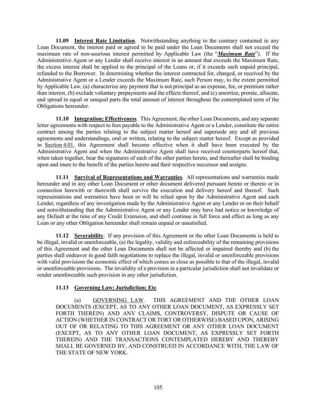 105 11.09 Interest Rate Limitation. Notwithstanding anything to the contrary contained in any Loan Document, the interest paid or agreed to be paid under the Loan Documents shall not exceed the maximum rate of non-usurious interest permitted by Applicable Law (the “Maximum Rate”). If the Administrative Agent or any Lender shall receive interest in an amount that exceeds the Maximum Rate, the excess interest shall be applied to the principal of the Loans or, if it exceeds such unpaid principal, refunded to the Borrower. In determining whether the interest contracted for, charged, or received by the Administrative Agent or a Lender exceeds the Maximum Rate, such Person may, to the extent permitted by Applicable Law, (a) characterize any payment that is not principal as an expense, fee, or premium rather than interest, (b) exclude voluntary prepayments and the effects thereof, and (c) amortize, prorate, allocate, and spread in equal or unequal parts the total amount of interest throughout the contemplated term of the Obligations hereunder. 11.10 Integration; Effectiveness. This Agreement, the other Loan Documents, and any separate letter agreements with respect to fees payable to the Administrative Agent or a Lender, constitute the entire contract among the parties relating to the subject matter hereof and supersede any and all previous agreements and understandings, oral or written, relating to the subject matter hereof. Except as provided in Section 4.01, this Agreement shall become effective when it shall have been executed by the Administrative Agent and when the Administrative Agent shall have received counterparts hereof that, when taken together, bear the signatures of each of the other parties hereto, and thereafter shall be binding upon and inure to the benefit of the parties hereto and their respective successor and assigns. 11.11 Survival of Representations and Warranties. All representations and warranties made hereunder and in any other Loan Document or other document delivered pursuant hereto or thereto or in connection herewith or therewith shall survive the execution and delivery hereof and thereof. Such representations and warranties have been or will be relied upon by the Administrative Agent and each Lender, regardless of any investigation made by the Administrative Agent or any Lender or on their behalf and notwithstanding that the Administrative Agent or any Lender may have had notice or knowledge of any Default at the time of any Credit Extension, and shall continue in full force and effect as long as any Loan or any other Obligation hereunder shall remain unpaid or unsatisfied. 11.12 Severability. If any provision of this Agreement or the other Loan Documents is held to be illegal, invalid or unenforceable, (a) the legality, validity and enforceability of the remaining provisions of this Agreement and the other Loan Documents shall not be affected or impaired thereby and (b) the parties shall endeavor in good faith negotiations to replace the illegal, invalid or unenforceable provisions with valid provisions the economic effect of which comes as close as possible to that of the illegal, invalid or unenforceable provisions. The invalidity of a provision in a particular jurisdiction shall not invalidate or render unenforceable such provision in any other jurisdiction. 11.13 Governing Law; Jurisdiction; Etc. (a) GOVERNING LAW. THIS AGREEMENT AND THE OTHER LOAN DOCUMENTS (EXCEPT, AS TO ANY OTHER LOAN DOCUMENT, AS EXPRESSLY SET FORTH THEREIN) AND ANY CLAIMS, CONTROVERSY, DISPUTE OR CAUSE OF ACTION (WHETHER IN CONTRACT OR TORT OR OTHERWISE) BASED UPON, ARISING OUT OF OR RELATING TO THIS AGREEMENT OR ANY OTHER LOAN DOCUMENT (EXCEPT, AS TO ANY OTHER LOAN DOCUMENT, AS EXPRESSLY SET FORTH THEREIN) AND THE TRANSACTIONS CONTEMPLATED HEREBY AND THEREBY SHALL BE GOVERNED BY, AND CONSTRUED IN ACCORDANCE WITH, THE LAW OF THE STATE OF NEW YORK.