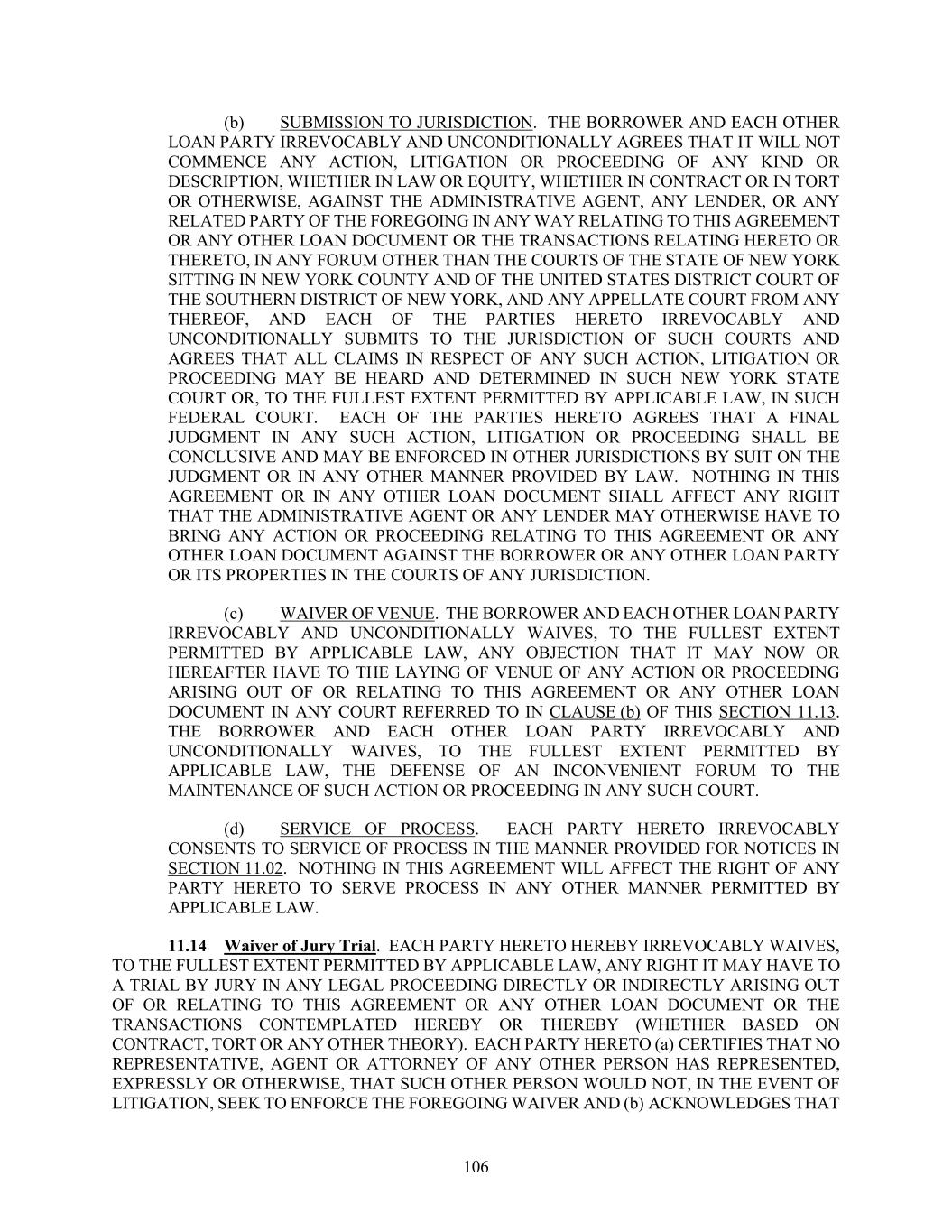 106 (b) SUBMISSION TO JURISDICTION. THE BORROWER AND EACH OTHER LOAN PARTY IRREVOCABLY AND UNCONDITIONALLY AGREES THAT IT WILL NOT COMMENCE ANY ACTION, LITIGATION OR PROCEEDING OF ANY KIND OR DESCRIPTION, WHETHER IN LAW OR EQUITY, WHETHER IN CONTRACT OR IN TORT OR OTHERWISE, AGAINST THE ADMINISTRATIVE AGENT, ANY LENDER, OR ANY RELATED PARTY OF THE FOREGOING IN ANY WAY RELATING TO THIS AGREEMENT OR ANY OTHER LOAN DOCUMENT OR THE TRANSACTIONS RELATING HERETO OR THERETO, IN ANY FORUM OTHER THAN THE COURTS OF THE STATE OF NEW YORK SITTING IN NEW YORK COUNTY AND OF THE UNITED STATES DISTRICT COURT OF THE SOUTHERN DISTRICT OF NEW YORK, AND ANY APPELLATE COURT FROM ANY THEREOF, AND EACH OF THE PARTIES HERETO IRREVOCABLY AND UNCONDITIONALLY SUBMITS TO THE JURISDICTION OF SUCH COURTS AND AGREES THAT ALL CLAIMS IN RESPECT OF ANY SUCH ACTION, LITIGATION OR PROCEEDING MAY BE HEARD AND DETERMINED IN SUCH NEW YORK STATE COURT OR, TO THE FULLEST EXTENT PERMITTED BY APPLICABLE LAW, IN SUCH FEDERAL COURT. EACH OF THE PARTIES HERETO AGREES THAT A FINAL JUDGMENT IN ANY SUCH ACTION, LITIGATION OR PROCEEDING SHALL BE CONCLUSIVE AND MAY BE ENFORCED IN OTHER JURISDICTIONS BY SUIT ON THE JUDGMENT OR IN ANY OTHER MANNER PROVIDED BY LAW. NOTHING IN THIS AGREEMENT OR IN ANY OTHER LOAN DOCUMENT SHALL AFFECT ANY RIGHT THAT THE ADMINISTRATIVE AGENT OR ANY LENDER MAY OTHERWISE HAVE TO BRING ANY ACTION OR PROCEEDING RELATING TO THIS AGREEMENT OR ANY OTHER LOAN DOCUMENT AGAINST THE BORROWER OR ANY OTHER LOAN PARTY OR ITS PROPERTIES IN THE COURTS OF ANY JURISDICTION. (c) WAIVER OF VENUE. THE BORROWER AND EACH OTHER LOAN PARTY IRREVOCABLY AND UNCONDITIONALLY WAIVES, TO THE FULLEST EXTENT PERMITTED BY APPLICABLE LAW, ANY OBJECTION THAT IT MAY NOW OR HEREAFTER HAVE TO THE LAYING OF VENUE OF ANY ACTION OR PROCEEDING ARISING OUT OF OR RELATING TO THIS AGREEMENT OR ANY OTHER LOAN DOCUMENT IN ANY COURT REFERRED TO IN CLAUSE (b) OF THIS SECTION 11.13. THE BORROWER AND EACH OTHER LOAN PARTY IRREVOCABLY AND UNCONDITIONALLY WAIVES, TO THE FULLEST EXTENT PERMITTED BY APPLICABLE LAW, THE DEFENSE OF AN INCONVENIENT FORUM TO THE MAINTENANCE OF SUCH ACTION OR PROCEEDING IN ANY SUCH COURT. (d) SERVICE OF PROCESS. EACH PARTY HERETO IRREVOCABLY CONSENTS TO SERVICE OF PROCESS IN THE MANNER PROVIDED FOR NOTICES IN SECTION 11.02. NOTHING IN THIS AGREEMENT WILL AFFECT THE RIGHT OF ANY PARTY HERETO TO SERVE PROCESS IN ANY OTHER MANNER PERMITTED BY APPLICABLE LAW. 11.14 Waiver of Jury Trial. EACH PARTY HERETO HEREBY IRREVOCABLY WAIVES, TO THE FULLEST EXTENT PERMITTED BY APPLICABLE LAW, ANY RIGHT IT MAY HAVE TO A TRIAL BY JURY IN ANY LEGAL PROCEEDING DIRECTLY OR INDIRECTLY ARISING OUT OF OR RELATING TO THIS AGREEMENT OR ANY OTHER LOAN DOCUMENT OR THE TRANSACTIONS CONTEMPLATED HEREBY OR THEREBY (WHETHER BASED ON CONTRACT, TORT OR ANY OTHER THEORY). EACH PARTY HERETO (a) CERTIFIES THAT NO REPRESENTATIVE, AGENT OR ATTORNEY OF ANY OTHER PERSON HAS REPRESENTED, EXPRESSLY OR OTHERWISE, THAT SUCH OTHER PERSON WOULD NOT, IN THE EVENT OF LITIGATION, SEEK TO ENFORCE THE FOREGOING WAIVER AND (b) ACKNOWLEDGES THAT