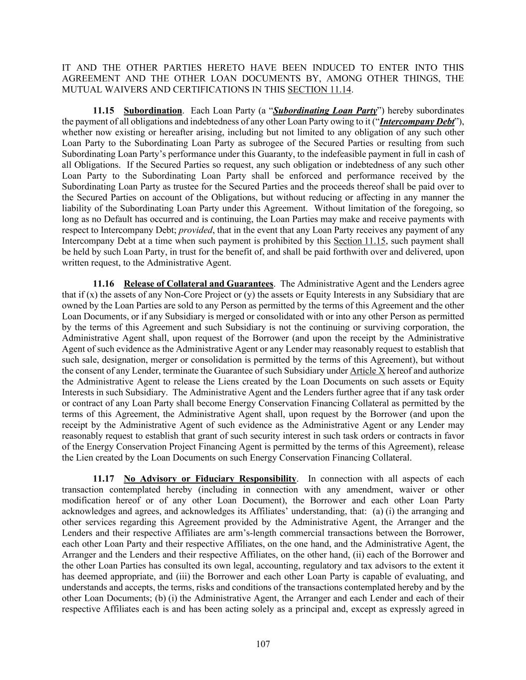 107 IT AND THE OTHER PARTIES HERETO HAVE BEEN INDUCED TO ENTER INTO THIS AGREEMENT AND THE OTHER LOAN DOCUMENTS BY, AMONG OTHER THINGS, THE MUTUAL WAIVERS AND CERTIFICATIONS IN THIS SECTION 11.14. 11.15 Subordination. Each Loan Party (a “Subordinating Loan Party”) hereby subordinates the payment of all obligations and indebtedness of any other Loan Party owing to it (“Intercompany Debt”), whether now existing or hereafter arising, including but not limited to any obligation of any such other Loan Party to the Subordinating Loan Party as subrogee of the Secured Parties or resulting from such Subordinating Loan Party’s performance under this Guaranty, to the indefeasible payment in full in cash of all Obligations. If the Secured Parties so request, any such obligation or indebtedness of any such other Loan Party to the Subordinating Loan Party shall be enforced and performance received by the Subordinating Loan Party as trustee for the Secured Parties and the proceeds thereof shall be paid over to the Secured Parties on account of the Obligations, but without reducing or affecting in any manner the liability of the Subordinating Loan Party under this Agreement. Without limitation of the foregoing, so long as no Default has occurred and is continuing, the Loan Parties may make and receive payments with respect to Intercompany Debt; provided, that in the event that any Loan Party receives any payment of any Intercompany Debt at a time when such payment is prohibited by this Section 11.15, such payment shall be held by such Loan Party, in trust for the benefit of, and shall be paid forthwith over and delivered, upon written request, to the Administrative Agent. 11.16 Release of Collateral and Guarantees. The Administrative Agent and the Lenders agree that if (x) the assets of any Non-Core Project or (y) the assets or Equity Interests in any Subsidiary that are owned by the Loan Parties are sold to any Person as permitted by the terms of this Agreement and the other Loan Documents, or if any Subsidiary is merged or consolidated with or into any other Person as permitted by the terms of this Agreement and such Subsidiary is not the continuing or surviving corporation, the Administrative Agent shall, upon request of the Borrower (and upon the receipt by the Administrative Agent of such evidence as the Administrative Agent or any Lender may reasonably request to establish that such sale, designation, merger or consolidation is permitted by the terms of this Agreement), but without the consent of any Lender, terminate the Guarantee of such Subsidiary under Article X hereof and authorize the Administrative Agent to release the Liens created by the Loan Documents on such assets or Equity Interests in such Subsidiary. The Administrative Agent and the Lenders further agree that if any task order or contract of any Loan Party shall become Energy Conservation Financing Collateral as permitted by the terms of this Agreement, the Administrative Agent shall, upon request by the Borrower (and upon the receipt by the Administrative Agent of such evidence as the Administrative Agent or any Lender may reasonably request to establish that grant of such security interest in such task orders or contracts in favor of the Energy Conservation Project Financing Agent is permitted by the terms of this Agreement), release the Lien created by the Loan Documents on such Energy Conservation Financing Collateral. 11.17 No Advisory or Fiduciary Responsibility. In connection with all aspects of each transaction contemplated hereby (including in connection with any amendment, waiver or other modification hereof or of any other Loan Document), the Borrower and each other Loan Party acknowledges and agrees, and acknowledges its Affiliates’ understanding, that: (a) (i) the arranging and other services regarding this Agreement provided by the Administrative Agent, the Arranger and the Lenders and their respective Affiliates are arm’s-length commercial transactions between the Borrower, each other Loan Party and their respective Affiliates, on the one hand, and the Administrative Agent, the Arranger and the Lenders and their respective Affiliates, on the other hand, (ii) each of the Borrower and the other Loan Parties has consulted its own legal, accounting, regulatory and tax advisors to the extent it has deemed appropriate, and (iii) the Borrower and each other Loan Party is capable of evaluating, and understands and accepts, the terms, risks and conditions of the transactions contemplated hereby and by the other Loan Documents; (b) (i) the Administrative Agent, the Arranger and each Lender and each of their respective Affiliates each is and has been acting solely as a principal and, except as expressly agreed in