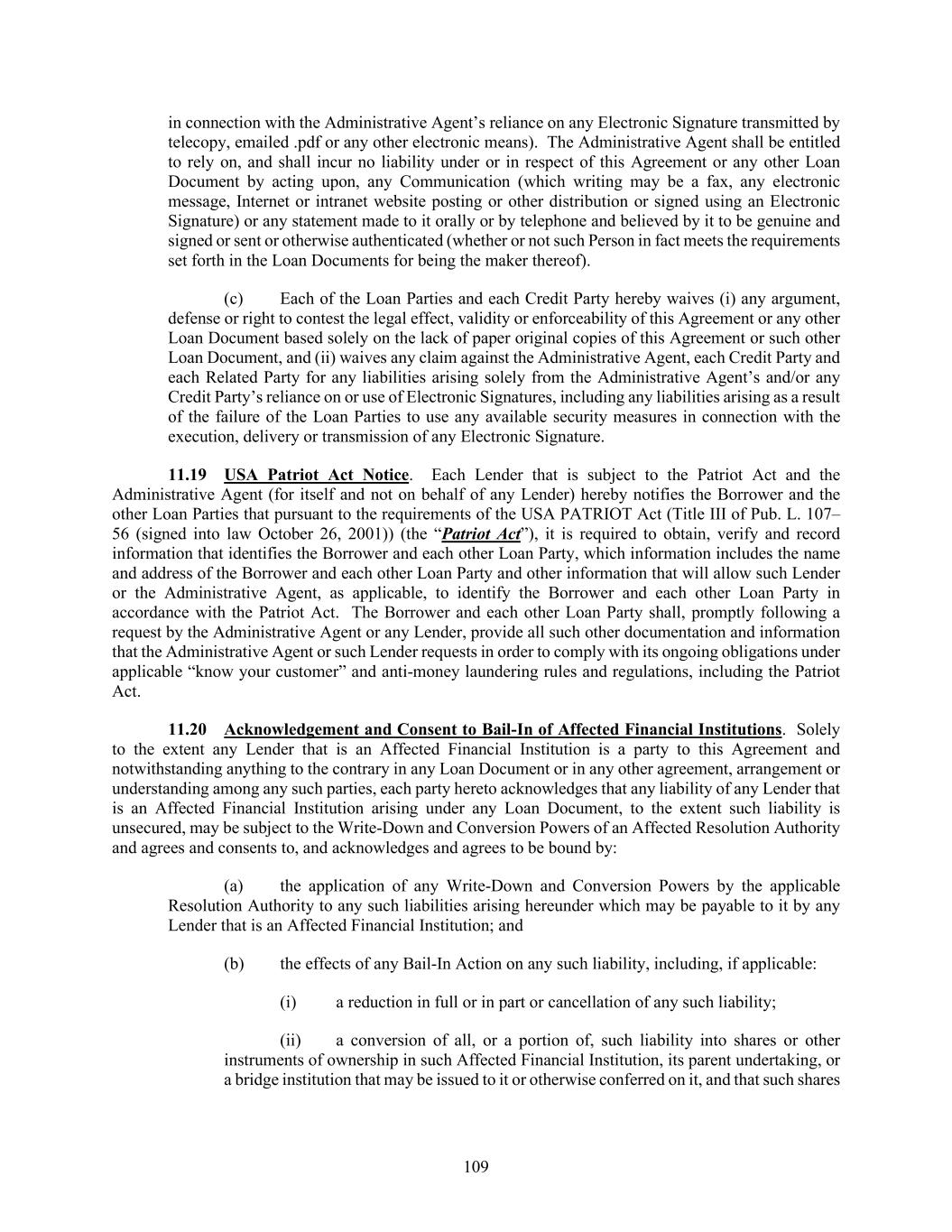 109 in connection with the Administrative Agent’s reliance on any Electronic Signature transmitted by telecopy, emailed .pdf or any other electronic means). The Administrative Agent shall be entitled to rely on, and shall incur no liability under or in respect of this Agreement or any other Loan Document by acting upon, any Communication (which writing may be a fax, any electronic message, Internet or intranet website posting or other distribution or signed using an Electronic Signature) or any statement made to it orally or by telephone and believed by it to be genuine and signed or sent or otherwise authenticated (whether or not such Person in fact meets the requirements set forth in the Loan Documents for being the maker thereof). (c) Each of the Loan Parties and each Credit Party hereby waives (i) any argument, defense or right to contest the legal effect, validity or enforceability of this Agreement or any other Loan Document based solely on the lack of paper original copies of this Agreement or such other Loan Document, and (ii) waives any claim against the Administrative Agent, each Credit Party and each Related Party for any liabilities arising solely from the Administrative Agent’s and/or any Credit Party’s reliance on or use of Electronic Signatures, including any liabilities arising as a result of the failure of the Loan Parties to use any available security measures in connection with the execution, delivery or transmission of any Electronic Signature. 11.19 USA Patriot Act Notice. Each Lender that is subject to the Patriot Act and the Administrative Agent (for itself and not on behalf of any Lender) hereby notifies the Borrower and the other Loan Parties that pursuant to the requirements of the USA PATRIOT Act (Title III of Pub. L. 107– 56 (signed into law October 26, 2001)) (the “Patriot Act”), it is required to obtain, verify and record information that identifies the Borrower and each other Loan Party, which information includes the name and address of the Borrower and each other Loan Party and other information that will allow such Lender or the Administrative Agent, as applicable, to identify the Borrower and each other Loan Party in accordance with the Patriot Act. The Borrower and each other Loan Party shall, promptly following a request by the Administrative Agent or any Lender, provide all such other documentation and information that the Administrative Agent or such Lender requests in order to comply with its ongoing obligations under applicable “know your customer” and anti-money laundering rules and regulations, including the Patriot Act. 11.20 Acknowledgement and Consent to Bail-In of Affected Financial Institutions. Solely to the extent any Lender that is an Affected Financial Institution is a party to this Agreement and notwithstanding anything to the contrary in any Loan Document or in any other agreement, arrangement or understanding among any such parties, each party hereto acknowledges that any liability of any Lender that is an Affected Financial Institution arising under any Loan Document, to the extent such liability is unsecured, may be subject to the Write-Down and Conversion Powers of an Affected Resolution Authority and agrees and consents to, and acknowledges and agrees to be bound by: (a) the application of any Write-Down and Conversion Powers by the applicable Resolution Authority to any such liabilities arising hereunder which may be payable to it by any Lender that is an Affected Financial Institution; and (b) the effects of any Bail-In Action on any such liability, including, if applicable: (i) a reduction in full or in part or cancellation of any such liability; (ii) a conversion of all, or a portion of, such liability into shares or other instruments of ownership in such Affected Financial Institution, its parent undertaking, or a bridge institution that may be issued to it or otherwise conferred on it, and that such shares