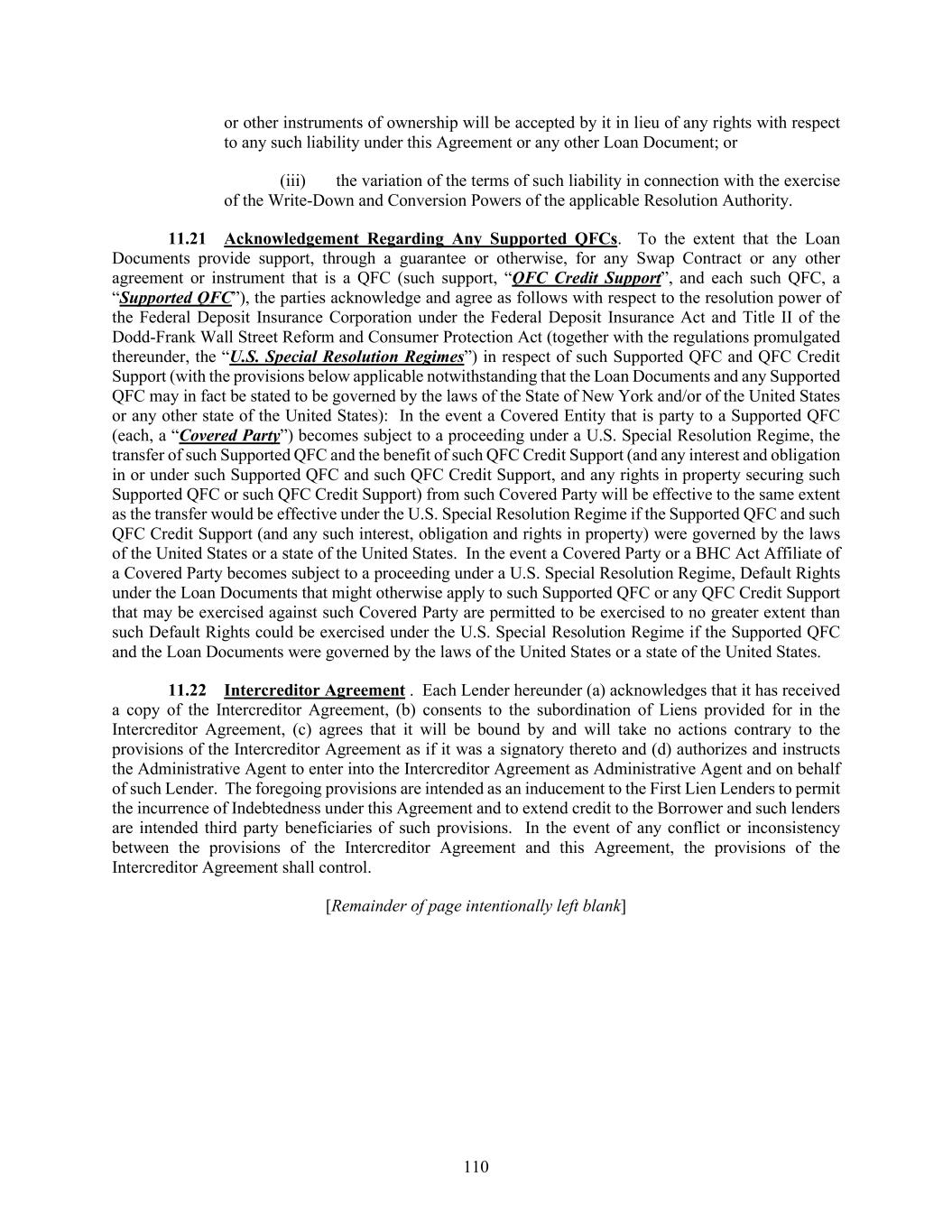 110 or other instruments of ownership will be accepted by it in lieu of any rights with respect to any such liability under this Agreement or any other Loan Document; or (iii) the variation of the terms of such liability in connection with the exercise of the Write-Down and Conversion Powers of the applicable Resolution Authority. 11.21 Acknowledgement Regarding Any Supported QFCs. To the extent that the Loan Documents provide support, through a guarantee or otherwise, for any Swap Contract or any other agreement or instrument that is a QFC (such support, “QFC Credit Support”, and each such QFC, a “Supported QFC”), the parties acknowledge and agree as follows with respect to the resolution power of the Federal Deposit Insurance Corporation under the Federal Deposit Insurance Act and Title II of the Dodd-Frank Wall Street Reform and Consumer Protection Act (together with the regulations promulgated thereunder, the “U.S. Special Resolution Regimes”) in respect of such Supported QFC and QFC Credit Support (with the provisions below applicable notwithstanding that the Loan Documents and any Supported QFC may in fact be stated to be governed by the laws of the State of New York and/or of the United States or any other state of the United States): In the event a Covered Entity that is party to a Supported QFC (each, a “Covered Party”) becomes subject to a proceeding under a U.S. Special Resolution Regime, the transfer of such Supported QFC and the benefit of such QFC Credit Support (and any interest and obligation in or under such Supported QFC and such QFC Credit Support, and any rights in property securing such Supported QFC or such QFC Credit Support) from such Covered Party will be effective to the same extent as the transfer would be effective under the U.S. Special Resolution Regime if the Supported QFC and such QFC Credit Support (and any such interest, obligation and rights in property) were governed by the laws of the United States or a state of the United States. In the event a Covered Party or a BHC Act Affiliate of a Covered Party becomes subject to a proceeding under a U.S. Special Resolution Regime, Default Rights under the Loan Documents that might otherwise apply to such Supported QFC or any QFC Credit Support that may be exercised against such Covered Party are permitted to be exercised to no greater extent than such Default Rights could be exercised under the U.S. Special Resolution Regime if the Supported QFC and the Loan Documents were governed by the laws of the United States or a state of the United States. 11.22 Intercreditor Agreement . Each Lender hereunder (a) acknowledges that it has received a copy of the Intercreditor Agreement, (b) consents to the subordination of Liens provided for in the Intercreditor Agreement, (c) agrees that it will be bound by and will take no actions contrary to the provisions of the Intercreditor Agreement as if it was a signatory thereto and (d) authorizes and instructs the Administrative Agent to enter into the Intercreditor Agreement as Administrative Agent and on behalf of such Lender. The foregoing provisions are intended as an inducement to the First Lien Lenders to permit the incurrence of Indebtedness under this Agreement and to extend credit to the Borrower and such lenders are intended third party beneficiaries of such provisions. In the event of any conflict or inconsistency between the provisions of the Intercreditor Agreement and this Agreement, the provisions of the Intercreditor Agreement shall control. [Remainder of page intentionally left blank]