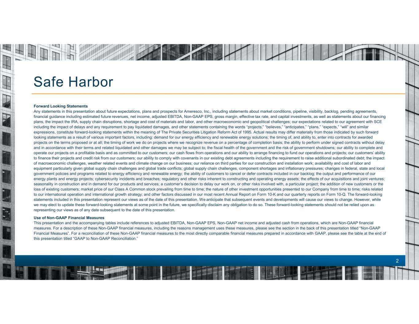 2 Safe Harbor Forward Looking Statements Any statements in this presentation about future expectations, plans and prospects for Ameresco, Inc., including statements about market conditions, pipeline, visibility, backlog, pending agreements, financial guidance including estimated future revenues, net income, adjusted EBITDA, Non-GAAP EPS, gross margin, effective tax rate, and capital investments, as well as statements about our financing plans, the impact the IRA, supply chain disruptions, shortage and cost of materials and labor, and other macroeconomic and geopolitical challenges; our expectations related to our agreement with SCE including the impact of delays and any requirement to pay liquidated damages, and other statements containing the words “projects,” “believes,” “anticipates,” “plans,” “expects,” “will” and similar expressions, constitute forward-looking statements within the meaning of The Private Securities Litigation Reform Act of 1995. Actual results may differ materially from those indicated by such forward looking statements as a result of various important factors, including: demand for our energy efficiency and renewable energy solutions; the timing of, and ability to, enter into contracts for awarded projects on the terms proposed or at all; the timing of work we do on projects where we recognize revenue on a percentage of completion basis; the ability to perform under signed contracts without delay and in accordance with their terms and related liquidated and other damages we may be subject to; the fiscal health of the government and the risk of government shutdowns; our ability to complete and operate our projects on a profitable basis and as committed to our customers; our cash flows from operations and our ability to arrange financing to fund our operations and projects; our customers’ ability to finance their projects and credit risk from our customers; our ability to comply with covenants in our existing debt agreements including the requirement to raise additional subordinated debt; the impact of macroeconomic challenges, weather related events and climate change on our business; our reliance on third parties for our construction and installation work; availability and cost of labor and equipment particularly given global supply chain challenges and global trade conflicts; global supply chain challenges, component shortages and inflationary pressures; changes in federal, state and local government policies and programs related to energy efficiency and renewable energy; the ability of customers to cancel or defer contracts included in our backlog; the output and performance of our energy plants and energy projects; cybersecurity incidents and breaches; regulatory and other risks inherent to constructing and operating energy assets; the effects of our acquisitions and joint ventures; seasonality in construction and in demand for our products and services; a customer’s decision to delay our work on, or other risks involved with, a particular project; the addition of new customers or the loss of existing customers; market price of our Class A Common stock prevailing from time to time; the nature of other investment opportunities presented to our Company from time to time; risks related to our international operation and international growth strategy; and other factors discussed in our most recent Annual Report on Form 10-K and our quarterly reports on Form 10-Q. The forward-looking statements included in this presentation represent our views as of the date of this presentation. We anticipate that subsequent events and developments will cause our views to change. However, while we may elect to update these forward-looking statements at some point in the future, we specifically disclaim any obligation to do so. These forward-looking statements should not be relied upon as representing our views as of any date subsequent to the date of this presentation. Use of Non-GAAP Financial Measures This presentation and the accompanying tables include references to adjusted EBITDA, Non-GAAP EPS, Non-GAAP net income and adjusted cash from operations, which are Non-GAAP financial measures. For a description of these Non-GAAP financial measures, including the reasons management uses these measures, please see the section in the back of this presentation titled “Non-GAAP Financial Measures”. For a reconciliation of these Non-GAAP financial measures to the most directly comparable financial measures prepared in accordance with GAAP, please see the table at the end of this presentation titled “GAAP to Non-GAAP Reconciliation.”