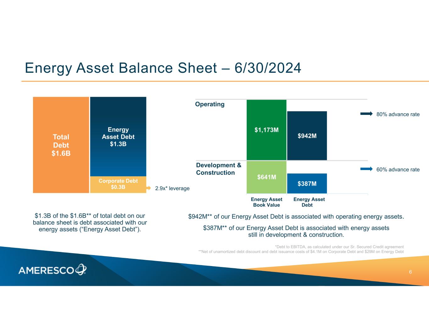 Energy Asset Portfolio – 6/30/2024 5 661 MWe of Energy Assets in operation. 92 MW of non-RNG biogas, 49 MW of RNG, Solar is 387 MW, Battery is 125 MW, Other is 9 MW 641 MWe of total assets in development. 635 MWe of Ameresco-owned capacity after minority interest Operating Energy Assets, 661 MWe Other, 1% Battery, 19% Solar, 59% Biogas: RNG, 7% Biogas: Non-RNG, 14% Energy Assets in Development & Construction, 635 MWe EaaS*, 22% Battery, 36% Solar, 22% Biogas, 21% Numbers may not sum due to rounding *$5M of our anticipated Assets in Development spending is for Energy as a Service assets which do not include generation assets that can be measured in MWe. This metric now also includes Puuloa and Ukiu Energy engine plants. Ameresco’s Ownership