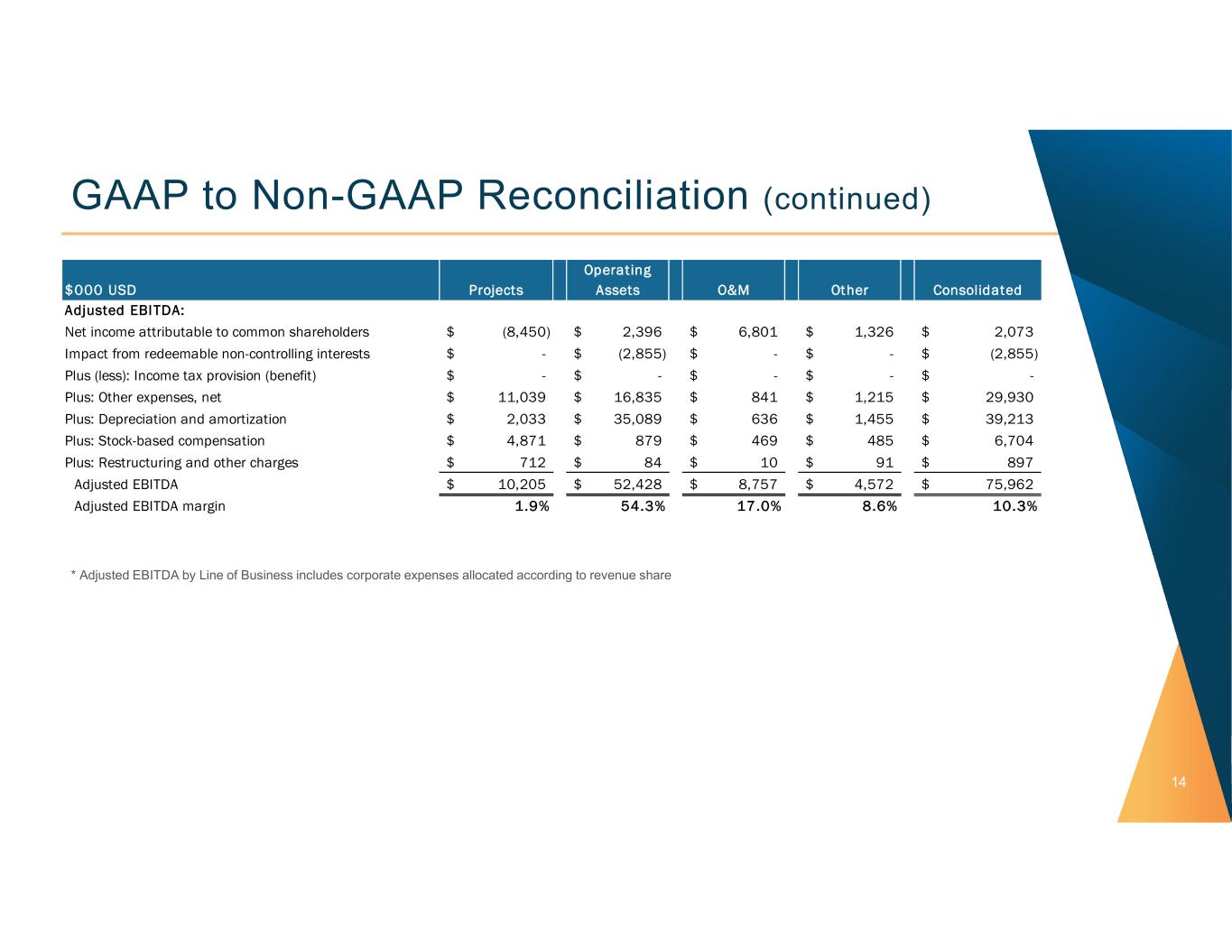 GAAP to Non-GAAP Reconciliation (continued) 14 * Adjusted EBITDA by Line of Business includes corporate expenses allocated according to revenue share $000 USD Projects Operating Assets O&M Other Consolidated Adjusted EBITDA: Net income attributable to common shareholders (8,450)$ 2,396$ 6,801$ 1,326$ 2,073$ Impact from redeemable non-controlling interests -$ (2,855)$ -$ -$ (2,855)$ Plus (less): Income tax provision (benefit) -$ -$ -$ -$ -$ Plus: Other expenses, net 11,039$ 16,835$ 841$ 1,215$ 29,930$ Plus: Depreciation and amortization 2,033$ 35,089$ 636$ 1,455$ 39,213$ Plus: Stock-based compensation 4,871$ 879$ 469$ 485$ 6,704$ Plus: Restructuring and other charges 712$ 84$ 10$ 91$ 897$ Adjusted EBITDA 10,205$ 52,428$ 8,757$ 4,572$ 75,962$ Adjusted EBITDA margin 1.9% 54.3% 17.0% 8.6% 10.3%
