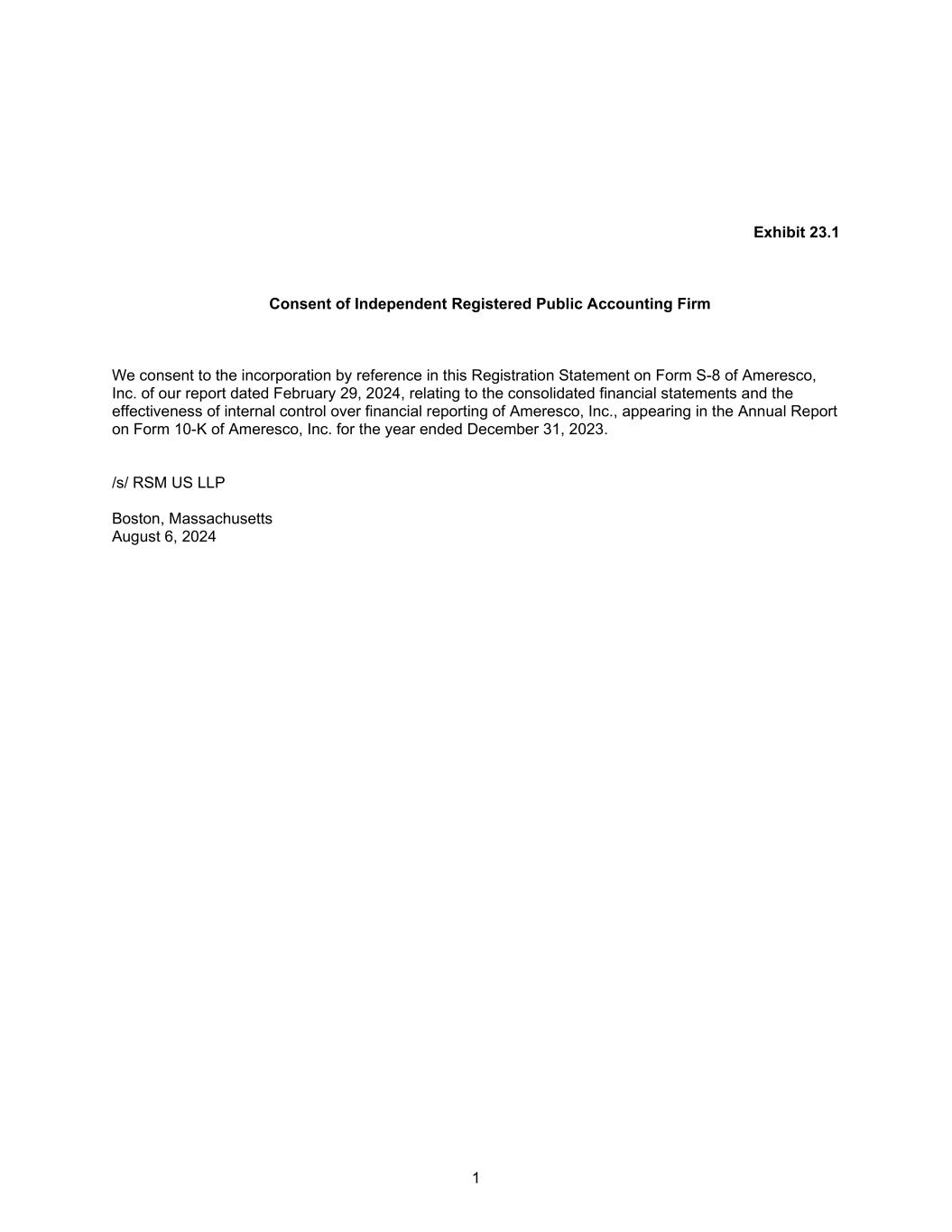 1 Exhibit 23.1 Consent of Independent Registered Public Accounting Firm We consent to the incorporation by reference in this Registration Statement on Form S-8 of Ameresco, Inc. of our report dated February 29, 2024, relating to the consolidated financial statements and the effectiveness of internal control over financial reporting of Ameresco, Inc., appearing in the Annual Report on Form 10-K of Ameresco, Inc. for the year ended December 31, 2023. /s/ RSM US LLP Boston, Massachusetts August 6, 2024