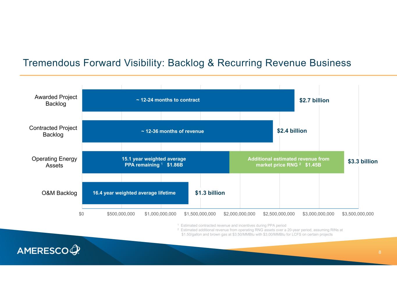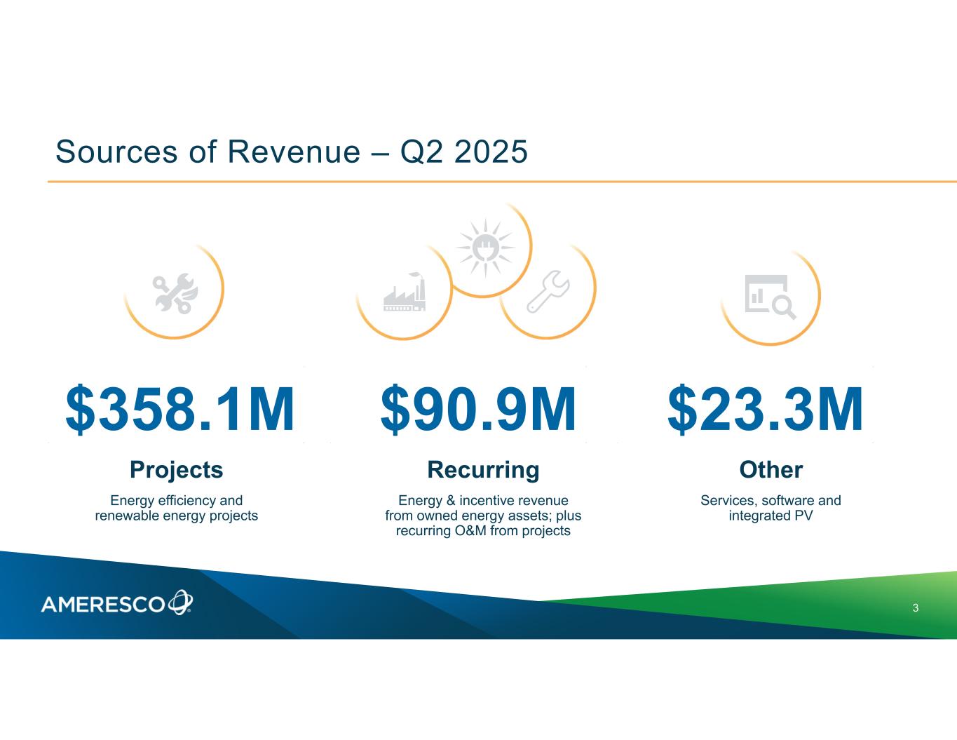 2 Safe Harbor Forward Looking Statements Any statements in this presentation about future expectations, plans and prospects for Ameresco, Inc., including statements about market conditions, pipeline, visibility, backlog, pending agreements, financial guidance including estimated future revenues, net income, adjusted EBITDA, Non-GAAP EPS, gross margin, effective tax rate, interest rate, depreciation, tax attributes and capital investments, as well as statements about our financing plans, the impact of the OBBB Act, the impact of other policies and regulatory changes implemented by the new U.S. administration, supply chain disruptions, shortage and cost of materials and labor, and other macroeconomic and geopolitical challenges, the impact from a possible change in accounting principle; our expectations related to our agreement with SCE including the impact of delays and any requirement to pay liquidated damages, and other statements containing the words “projects,” “believes,” “anticipates,” “plans,” “expects,” “will” and similar expressions, constitute forward-looking statements within the meaning of The Private Securities Litigation Reform Act of 1995. Actual results may differ materially from those indicated by such forward looking statements as a result of various important factors, including: demand for our energy efficiency and renewable energy solutions; the timing of, and ability to, enter into contracts for awarded projects on the terms proposed or at all; the timing of work we do on projects where we recognize revenue on a percentage of completion basis; the ability to perform under signed contracts without delay and in accordance with their terms and the potential for liquidated and other damages we may be subject to; the fiscal health of the government and the risk of government shutdowns and reductions in the federal workforce; our ability to complete and operate our projects on a profitable basis and as committed to our customers; our cash flows from operations and our ability to arrange financing to fund our operations and projects; our customers’ ability to finance their projects and credit risk from our customers; our ability to comply with covenants in our existing debt agreements; the impact of macroeconomic challenges, weather related events and climate change; our reliance on third parties for our construction and installation work; availability and cost of labor and equipment particularly given global supply chain challenges, tariffs and global trade conflicts; global supply chain challenges, component shortages and inflationary pressures; changes in federal, state and local government policies and programs related to energy efficiency and renewable energy; the ability of customers to cancel or defer contracts included in our backlog; the output and performance of our energy plants and energy projects; cybersecurity incidents and breaches; regulatory and other risks inherent to constructing and operating energy assets; the effects of our acquisitions and joint ventures; seasonality in construction and in demand for our products and services; a customer’s decision to delay our work on, or other risks involved with, a particular project; the addition of new customers or the loss of existing customers; market price of our Class A Common stock prevailing from time to time; the nature of other investment opportunities presented to our Company from time to time; risks related to our international operation and international growth strategy; and other factors discussed in our most recent Annual Report on Form 10-K and our quarterly reports on Form 10-Q. The forward-looking statements included in this presentation represent our views as of the date of this presentation. We anticipate that subsequent events and developments will cause our views to change. However, while we may elect to update these forward-looking statements at some point in the future, we specifically disclaim any obligation to do so. These forward-looking statements should not be relied upon as representing our views as of any date subsequent to the date of this presentation. Use of Non-GAAP Financial Measures This presentation and the accompanying tables include references to adjusted EBITDA, Non-GAAP EPS, Non-GAAP net income and adjusted cash from operations, which are Non-GAAP financial measures. For a description of these Non-GAAP financial measures, including the reasons management uses these measures, please see the section in the back of this presentation titled “Non-GAAP Financial Measures”. For a reconciliation of these Non-GAAP financial measures to the most directly comparable financial measures prepared in accordance with GAAP, please see the table at the end of this presentation titled “GAAP to Non-GAAP Reconciliation.”