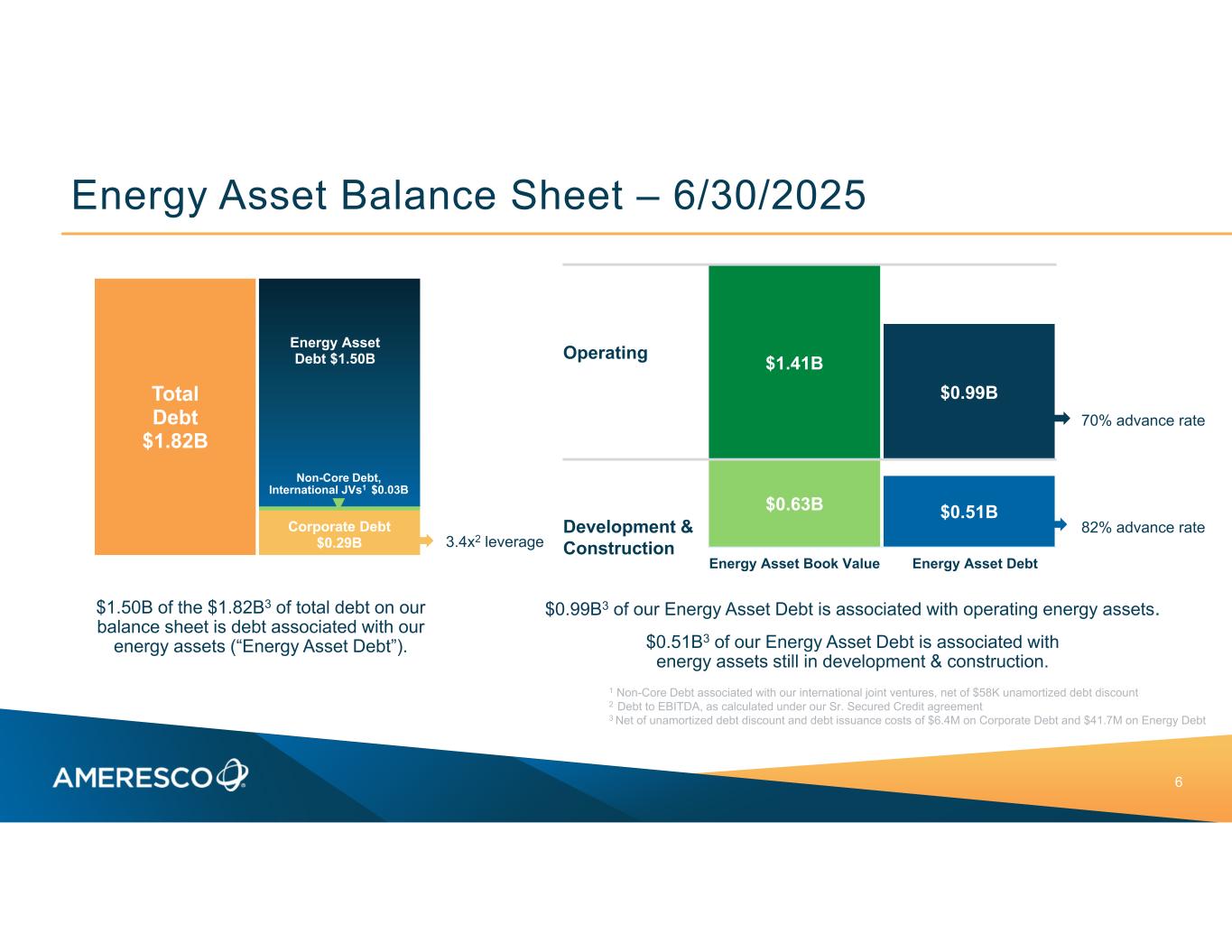 Energy Asset Portfolio – 6/30/2025 5 749 MWe of Energy Assets in Operation: 83 MWe of non-RNG biogas, 70 MWe of RNG, 421 MW of Solar, 166 MW of Battery, 9 MW of Other 615 MWe of Energy Assets in Development; No minority partners in pipeline currently. Operating Energy Assets, 749 MWe Other, 1% Battery, 22% Solar, 56% Biogas: RNG, 9% Biogas: Non-RNG, 11% Energy Assets in Development & Construction, 615 MWe Firm Generation*, 23% Battery, 40% Solar, 22% Biogas, 15% Numbers may not sum due to rounding *Energy as a Service renamed to Firm Generation. This metric now only includes Puuloa and Ukiu Energy engine plants Ameresco’s Ownership