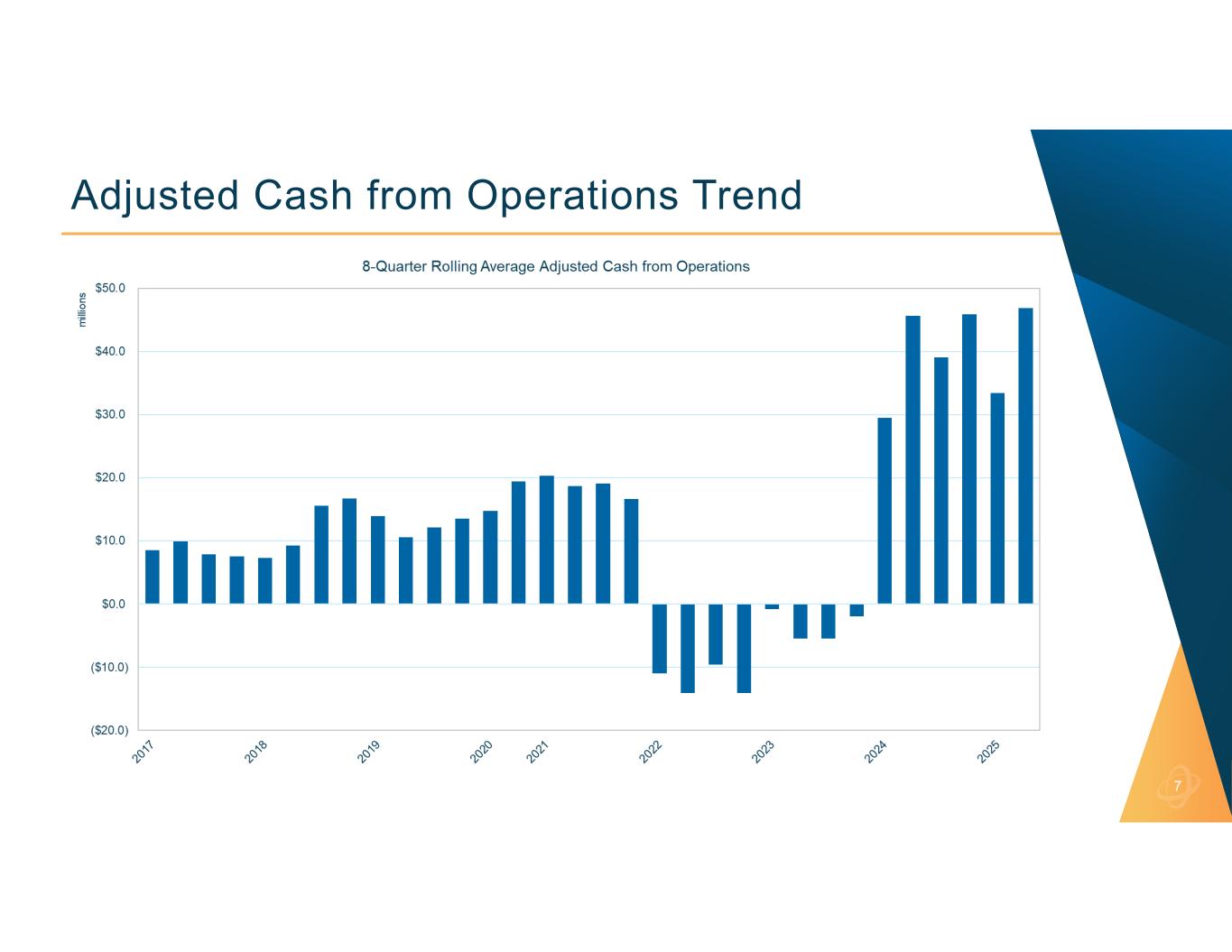 Energy Asset Balance Sheet – 6/30/2025 6 1 Non-Core Debt associated with our international joint ventures, net of $58K unamortized debt discount 2 Debt to EBITDA, as calculated under our Sr. Secured Credit agreement 3 Net of unamortized debt discount and debt issuance costs of $6.4M on Corporate Debt and $41.7M on Energy Debt $0.99B3 of our Energy Asset Debt is associated with operating energy assets. $0.51B3 of our Energy Asset Debt is associated with energy assets still in development & construction. $1.50B of the $1.82B3 of total debt on our balance sheet is debt associated with our energy assets (“Energy Asset Debt”). Total Debt $1.82B Corporate Debt $0.29B Non-Core Debt, International JVs1 $0.03B ▼ Energy Asset Debt $1.50B 3.4x2 leverage $0.63B $0.51B $1.41B $0.99B Energy Asset Book Value Energy Asset Debt 70% advance rate Operating Development & Construction 82% advance rate