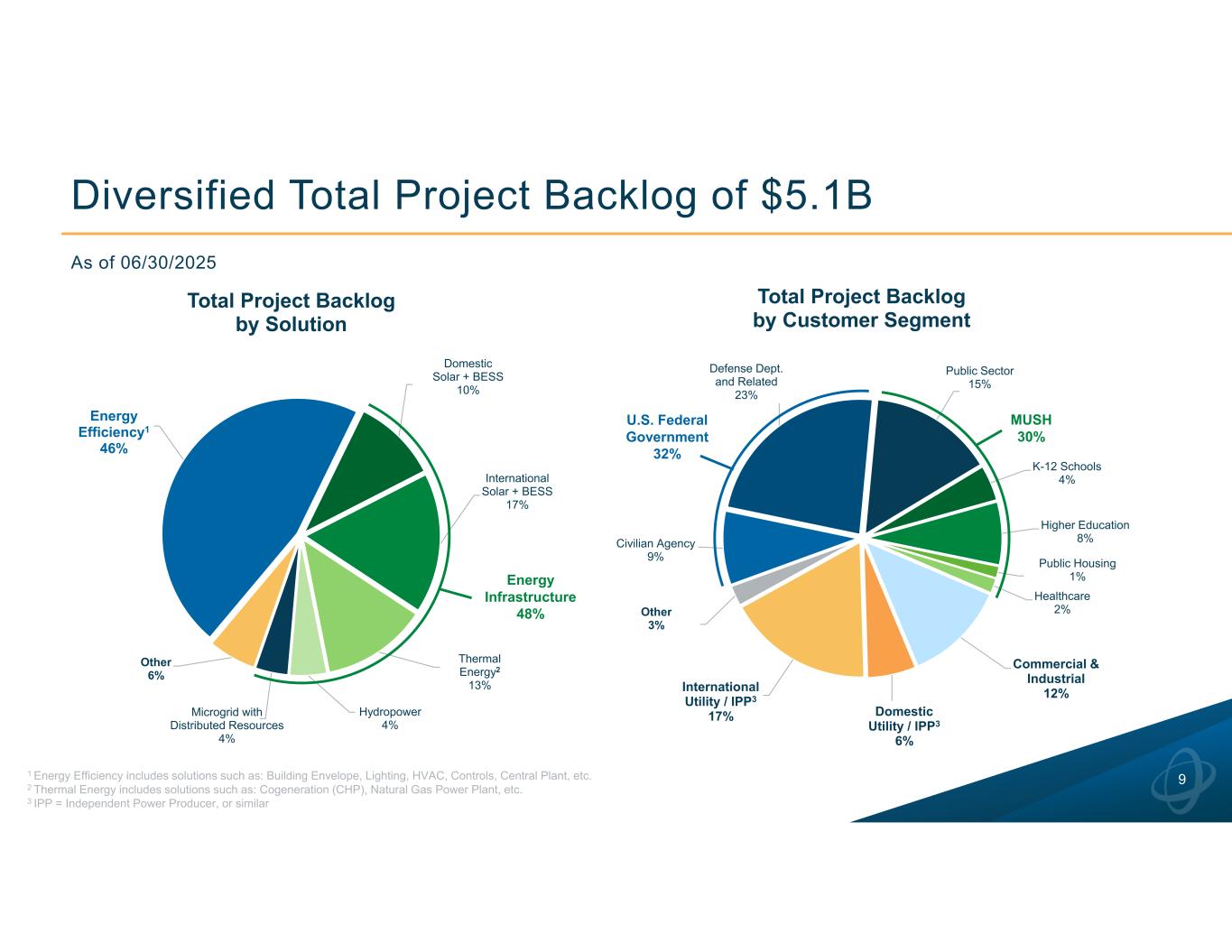 Diversified Total Project Backlog of $5.1B 9 As of 06/30/2025 1 Energy Efficiency includes solutions such as: Building Envelope, Lighting, HVAC, Controls, Central Plant, etc. 2 Thermal Energy includes solutions such as: Cogeneration (CHP), Natural Gas Power Plant, etc. 3 IPP = Independent Power Producer, or similar Energy Efficiency1 46% Domestic Solar + BESS 10% International Solar + BESS 17% Thermal Energy2 13% Hydropower 4% Microgrid with Distributed Resources 4% Other 6% Total Project Backlog by Solution Energy Infrastructure 48% Civilian Agency 9% Defense Dept. and Related 23% Public Sector 15% K-12 Schools 4% Higher Education 8% Public Housing 1% Healthcare 2% Commercial & Industrial 12% Domestic Utility / IPP3 6% International Utility / IPP3 17% Other 3% Total Project Backlog by Customer Segment U.S. Federal Government 32% MUSH 30%