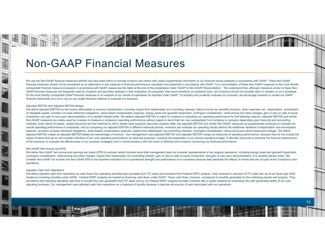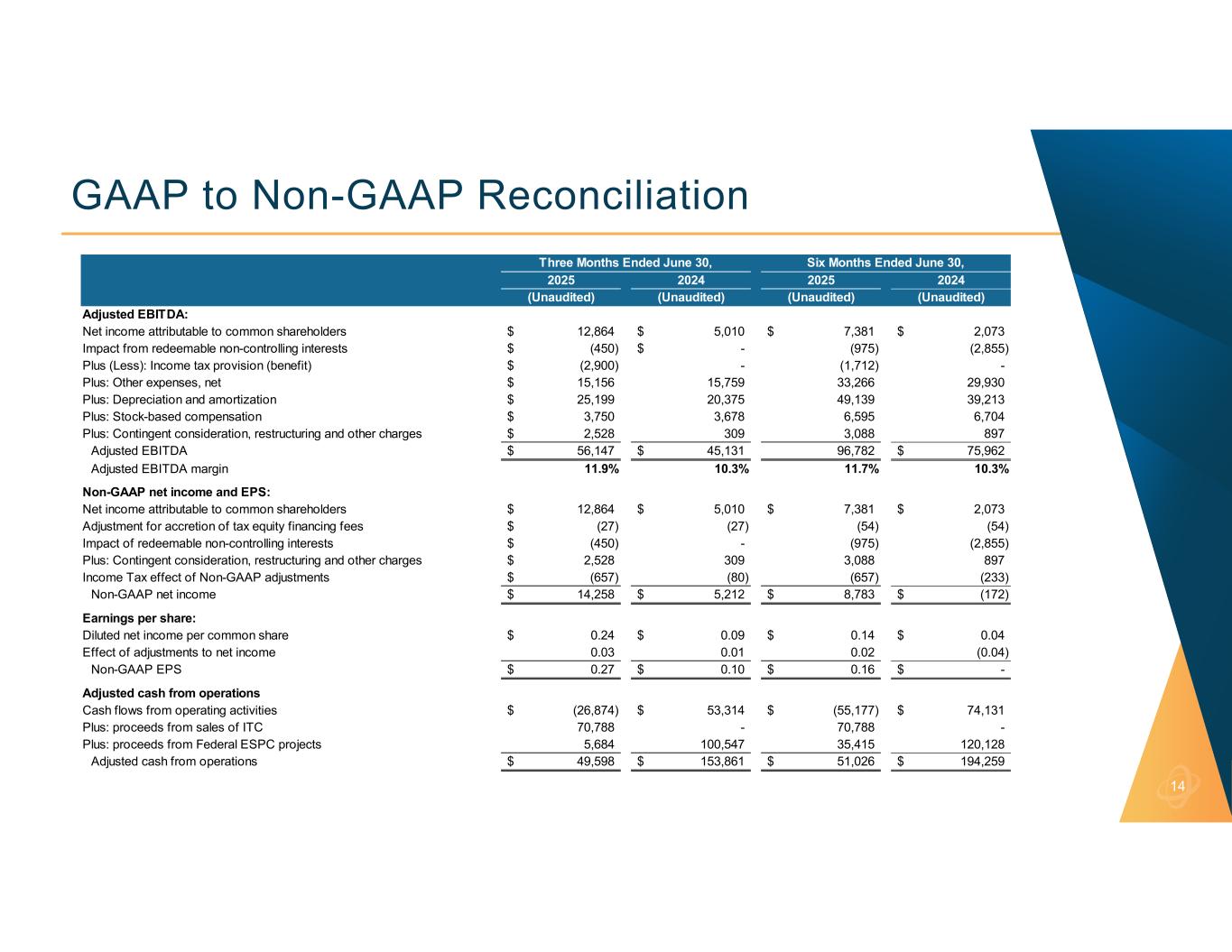 13 Non-GAAP Financial Measures We use the Non-GAAP financial measures defined and discussed below to provide investors and others with useful supplemental information to our financial results prepared in accordance with GAAP. These Non-GAAP financial measures should not be considered as an alternative to any measure of financial performance calculated and presented in accordance with GAAP. For a reconciliation of these Non-GAAP measures to the most directly comparable financial measures prepared in accordance with GAAP, please see the table at the end of this presentation titled “GAAP to Non-GAAP Reconciliation.” We understand that, although measures similar to these Non- GAAP financial measures are frequently used by investors and securities analysts in their evaluation of companies, they have limitations as analytical tools, and investors should not consider them in isolation or as a substitute for the most directly comparable GAAP financial measures or an analysis of our results of operations as reported under GAAP. To properly and prudently evaluate our business, we encourage investors to review our GAAP financial statements and not to rely on any single financial measure to evaluate our business. Adjusted EBITDA and Adjusted EBITDA Margin We define adjusted EBITDA as net income attributable to common shareholders, including impact from redeemable non-controlling interests, before income tax (benefit) provision, other expenses net, depreciation, amortization of intangible assets, accretion of asset retirement obligations, stock-based compensation expense, energy asset and goodwill impairment, contingent consideration, restructuring and other charges, gain or loss on sale of equity investment, and gain or loss upon deconsolidation of a variable interest entity. We believe adjusted EBITDA is useful to investors in evaluating our operating performance for the following reasons: adjusted EBITDA and similar Non-GAAP measures are widely used by investors to measure a company's operating performance without regard to items that can vary substantially from company to company depending upon financing and accounting methods, book values of assets, capital structures and the methods by which assets were acquired; securities analysts often use adjusted EBITDA and similar Non-GAAP measures as supplemental measures to evaluate the overall operating performance of companies; and by comparing our adjusted EBITDA in different historical periods, investors can evaluate our operating results without the additional variations of depreciation and amortization expense, accretion of asset retirement obligations, stock-based compensation expense, impact from redeemable non-controlling interests, contingent consideration, restructuring and asset impairment charges. We define adjusted EBITDA margin as adjusted EBITDA stated as a percentage of revenue. Our management uses adjusted EBITDA and adjusted EBITDA margin as measures of operating performance, because they do not include the impact of items that we do not consider indicative of our core operating performance; for planning purposes, including the preparation of our annual operating budget; to allocate resources to enhance the financial performance of the business; to evaluate the effectiveness of our business strategies; and in communications with the board of directors and investors concerning our financial performance. Non-GAAP Net Income and EPS We define Non-GAAP net income and earnings per share (EPS) to exclude certain discrete items that management does not consider representative of our ongoing operations, including energy asset and goodwill impairment, contingent consideration, restructuring and other charges, impact from redeemable non-controlling interest, gain or loss on sale of equity investment, and gain or loss upon deconsolidation of a variable interest entity. We consider Non-GAAP net income and Non-GAAP EPS to be important indicators of our operational strength and performance of our business because they eliminate the effects of events that are not part of the Company's core operations. Adjusted Cash from Operations We define adjusted cash from operations as cash flows from operating activities plus proceeds from ITC sales and proceeds from Federal ESPC projects. Cash received in payment of ITC sales are, as of our fiscal year 2025, treated as investing activities under GAAP. Federal ESPC projects are treated as financing cash flows under GAAP. These cash flows, however, correspond to benefits generated by the underlying assets and projects. Thus, we believe that adjusting operating cash flow to include the cash generated from ITC sales and by our Federal ESPC projects provides investors with a useful measure for evaluating the cash generating ability of our core operating business. Our management uses adjusted cash from operations as a measure of liquidity because it captures all sources of cash associated with our operations.