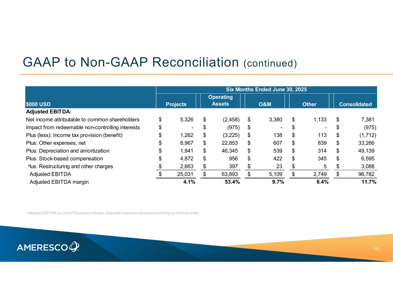 GAAP to Non-GAAP Reconciliation 14 (Unaudited) (Unaudited) (Unaudited) (Unaudited) Adjusted EBITDA: Net income attributable to common shareholders 12,864$ 5,010$ 7,381$ 2,073$ Impact from redeemable non-controlling interests (450)$ -$ (975) (2,855) Plus (Less): Income tax provision (benefit) (2,900)$ - (1,712) - Plus: Other expenses, net 15,156$ 15,759 33,266 29,930 Plus: Depreciation and amortization 25,199$ 20,375 49,139 39,213 Plus: Stock-based compensation 3,750$ 3,678 6,595 6,704 Plus: Contingent consideration, restructuring and other charges 2,528$ 309 3,088 897 Adjusted EBITDA 56,147$ 45,131$ 96,782 75,962$ Adjusted EBITDA margin 11.9% 10.3% 11.7% 10.3% Non-GAAP net income and EPS: Net income attributable to common shareholders 12,864$ 5,010$ 7,381$ 2,073$ Adjustment for accretion of tax equity financing fees (27)$ (27) (54) (54) Impact of redeemable non-controlling interests (450)$ - (975) (2,855) Plus: Contingent consideration, restructuring and other charges 2,528$ 309 3,088 897 Income Tax effect of Non-GAAP adjustments (657)$ (80) (657) (233) Non-GAAP net income 14,258$ 5,212$ 8,783$ (172)$ Earnings per share: Diluted net income per common share 0.24$ 0.09$ 0.14$ 0.04$ Effect of adjustments to net income 0.03 0.01 0.02 (0.04) Non-GAAP EPS 0.27$ 0.10$ 0.16$ -$ Adjusted cash from operations Cash flows from operating activities (26,874)$ 53,314$ (55,177)$ 74,131$ Plus: proceeds from sales of ITC 70,788 - 70,788 - Plus: proceeds from Federal ESPC projects 5,684 100,547 35,415 120,128 Adjusted cash from operations 49,598$ 153,861$ 51,026$ 194,259$ 2025 2024 2025 2024 Six Months Ended June 30,Three Months Ended June 30,