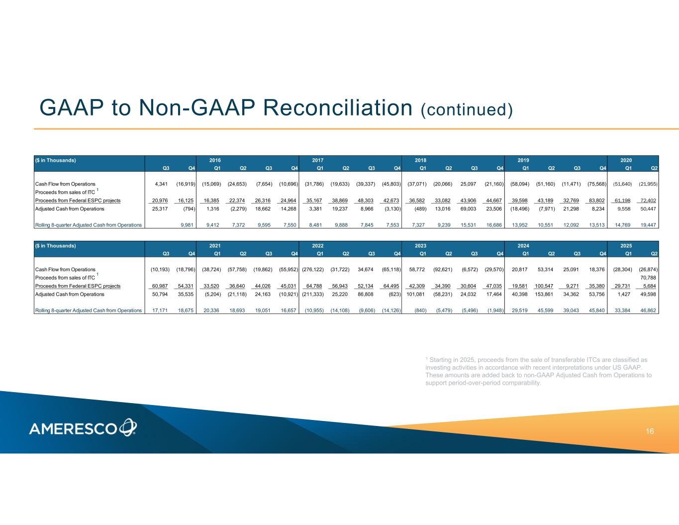 GAAP to Non-GAAP Reconciliation (continued) 15 * Adjusted EBITDA by Line of Business includes corporate expenses allocated according to revenue share $000 USD Projects Operating Assets O&M Other Consolidated Adjusted EBITDA: Net income attributable to common shareholders 5,326$ (2,458)$ 3,380$ 1,133$ 7,381$ Impact from redeemable non-controlling interests -$ (975)$ -$ -$ (975)$ Plus (less): Income tax provision (benefit) 1,262$ (3,225)$ 138$ 113$ (1,712)$ Plus: Other expenses, net 8,967$ 22,853$ 607$ 839$ 33,266$ Plus: Depreciation and amortization 1,941$ 46,345$ 539$ 314$ 49,139$ Plus: Stock-based compensation 4,872$ 956$ 422$ 345$ 6,595$ Plus: Restructuring and other charges 2,663$ 397$ 23$ 5$ 3,088$ Adjusted EBITDA 25,031$ 63,893$ 5,109$ 2,749$ 96,782$ Adjusted EBITDA margin 4.1% 53.4% 9.7% 6.4% 11.7% Six Months Ended June 30, 2025