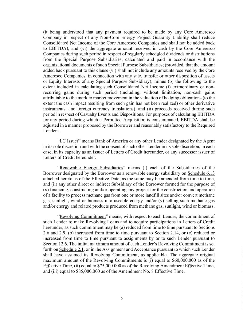 (it being understood that any payment required to be made by any Core Ameresco Company in respect of any Non-Core Energy Project Guaranty Liability shall reduce Consolidated Net Income of the Core Ameresco Companies and shall not be added back to EBITDA), and (vi) the aggregate amount received in cash by the Core Ameresco Companies during such period in respect of regularly scheduled dividends or distributions from the Special Purpose Subsidiaries, calculated and paid in accordance with the organizational documents of such Special Purpose Subsidiaries; (provided, that the amount added back pursuant to this clause (vi) shall not include any amounts received by the Core Ameresco Companies, in connection with any sale, transfer or other disposition of assets or Equity Interests of any Special Purpose Subsidiary); minus (b) the following to the extent included in calculating such Consolidated Net Income (i) extraordinary or non- recurring gains during such period (including, without limitation, non-cash gains attributable to the mark to market movement in the valuation of hedging obligations (to the extent the cash impact resulting from such gain has not been realized) or other derivative instruments, and foreign currency translations), and (ii) proceeds received during such period in respect of Casualty Events and Dispositions. For purposes of calculating EBITDA for any period during which a Permitted Acquisition is consummated, EBITDA shall be adjusted in a manner proposed by the Borrower and reasonably satisfactory to the Required Lenders. “LC Issuer” means Bank of America or any other Lender designated by the Agent in its sole discretion and with the consent of such other Lender in its sole discretion, in each case, in its capacity as an issuer of Letters of Credit hereunder, or any successor issuer of Letters of Credit hereunder. “Renewable Energy Subsidiaries” means (i) each of the Subsidiaries of the Borrower designated by the Borrower as a renewable energy subsidiary on Schedule 6.13 attached hereto as of the Effective Date, as the same may be amended from time to time, and (ii) any other direct or indirect Subsidiary of the Borrower formed for the purpose of (x) financing, constructing and/or operating any project for the construction and operation of a facility to process methane gas from one or more landfill sites and/or convert methane gas, sunlight, wind or biomass into useable energy and/or (y) selling such methane gas and/or energy and related products produced from methane gas, sunlight, wind or biomass. “Revolving Commitment” means, with respect to each Lender, the commitment of such Lender to make Revolving Loans and to acquire participations in Letters of Credit hereunder, as such commitment may be (a) reduced from time to time pursuant to Sections 2.6 and 2.9, (b) increased from time to time pursuant to Section 2.14, or (c) reduced or increased from time to time pursuant to assignments by or to such Lender pursuant to Section 12.6. The initial maximum amount of each Lender’s Revolving Commitment is set forth on Schedule 2.1, or in the Assignment and Acceptance pursuant to which such Lender shall have assumed its Revolving Commitment, as applicable. The aggregate original maximum amount of the Revolving Commitments is (i) equal to $60,000,000 as of the Effective Time, (ii) equal to $75,000,000 as of the Revolving Amendment Effective Time, and (iii) equal to $85,000,000 as of the Amendment No. 8 Effective Time. 2