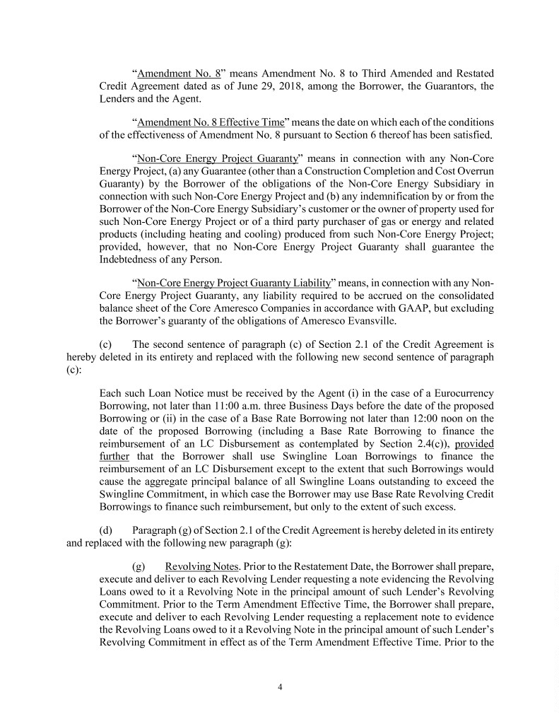 “Amendment No. 8” means Amendment No. 8 to Third Amended and Restated Credit Agreement dated as of June 29, 2018, among the Borrower, the Guarantors, the Lenders and the Agent. “Amendment No. 8 Effective Time” means the date on which each of the conditions of the effectiveness of Amendment No. 8 pursuant to Section 6 thereof has been satisfied. “Non-Core Energy Project Guaranty” means in connection with any Non-Core Energy Project, (a) any Guarantee (other than a Construction Completion and Cost Overrun Guaranty) by the Borrower of the obligations of the Non-Core Energy Subsidiary in connection with such Non-Core Energy Project and (b) any indemnification by or from the Borrower of the Non-Core Energy Subsidiary’s customer or the owner of property used for such Non-Core Energy Project or of a third party purchaser of gas or energy and related products (including heating and cooling) produced from such Non-Core Energy Project; provided, however, that no Non-Core Energy Project Guaranty shall guarantee the Indebtedness of any Person. “Non-Core Energy Project Guaranty Liability” means, in connection with any Non- Core Energy Project Guaranty, any liability required to be accrued on the consolidated balance sheet of the Core Ameresco Companies in accordance with GAAP, but excluding the Borrower’s guaranty of the obligations of Ameresco Evansville. (c) The second sentence of paragraph (c) of Section 2.1 of the Credit Agreement is hereby deleted in its entirety and replaced with the following new second sentence of paragraph (c): Each such Loan Notice must be received by the Agent (i) in the case of a Eurocurrency Borrowing, not later than 11:00 a.m. three Business Days before the date of the proposed Borrowing or (ii) in the case of a Base Rate Borrowing not later than 12:00 noon on the date of the proposed Borrowing (including a Base Rate Borrowing to finance the reimbursement of an LC Disbursement as contemplated by Section 2.4(c)), provided further that the Borrower shall use Swingline Loan Borrowings to finance the reimbursement of an LC Disbursement except to the extent that such Borrowings would cause the aggregate principal balance of all Swingline Loans outstanding to exceed the Swingline Commitment, in which case the Borrower may use Base Rate Revolving Credit Borrowings to finance such reimbursement, but only to the extent of such excess. (d) Paragraph (g) of Section 2.1 of the Credit Agreement is hereby deleted in its entirety and replaced with the following new paragraph (g): (g) Revolving Notes. Prior to the Restatement Date, the Borrower shall prepare, execute and deliver to each Revolving Lender requesting a note evidencing the Revolving Loans owed to it a Revolving Note in the principal amount of such Lender’s Revolving Commitment. Prior to the Term Amendment Effective Time, the Borrower shall prepare, execute and deliver to each Revolving Lender requesting a replacement note to evidence the Revolving Loans owed to it a Revolving Note in the principal amount of such Lender’s Revolving Commitment in effect as of the Term Amendment Effective Time. Prior to the 4
