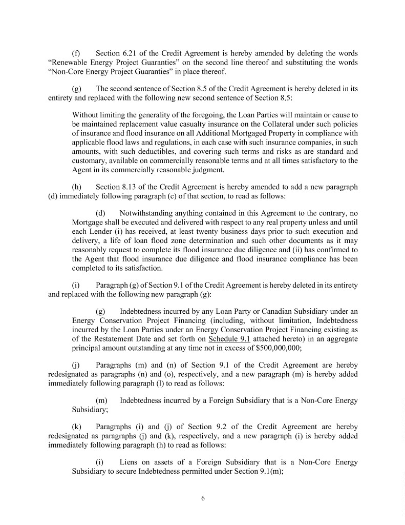 (f) Section 6.21 of the Credit Agreement is hereby amended by deleting the words “Renewable Energy Project Guaranties” on the second line thereof and substituting the words “Non-Core Energy Project Guaranties” in place thereof. (g) The second sentence of Section 8.5 of the Credit Agreement is hereby deleted in its entirety and replaced with the following new second sentence of Section 8.5: Without limiting the generality of the foregoing, the Loan Parties will maintain or cause to be maintained replacement value casualty insurance on the Collateral under such policies of insurance and flood insurance on all Additional Mortgaged Property in compliance with applicable flood laws and regulations, in each case with such insurance companies, in such amounts, with such deductibles, and covering such terms and risks as are standard and customary, available on commercially reasonable terms and at all times satisfactory to the Agent in its commercially reasonable judgment. (h) Section 8.13 of the Credit Agreement is hereby amended to add a new paragraph (d) immediately following paragraph (c) of that section, to read as follows: (d) Notwithstanding anything contained in this Agreement to the contrary, no Mortgage shall be executed and delivered with respect to any real property unless and until each Lender (i) has received, at least twenty business days prior to such execution and delivery, a life of loan flood zone determination and such other documents as it may reasonably request to complete its flood insurance due diligence and (ii) has confirmed to the Agent that flood insurance due diligence and flood insurance compliance has been completed to its satisfaction. (i) Paragraph (g) of Section 9.1 of the Credit Agreement is hereby deleted in its entirety and replaced with the following new paragraph (g): (g) Indebtedness incurred by any Loan Party or Canadian Subsidiary under an Energy Conservation Project Financing (including, without limitation, Indebtedness incurred by the Loan Parties under an Energy Conservation Project Financing existing as of the Restatement Date and set forth on Schedule 9.1 attached hereto) in an aggregate principal amount outstanding at any time not in excess of $500,000,000; (j) Paragraphs (m) and (n) of Section 9.1 of the Credit Agreement are hereby redesignated as paragraphs (n) and (o), respectively, and a new paragraph (m) is hereby added immediately following paragraph (l) to read as follows: (m) Indebtedness incurred by a Foreign Subsidiary that is a Non-Core Energy Subsidiary; (k) Paragraphs (i) and (j) of Section 9.2 of the Credit Agreement are hereby redesignated as paragraphs (j) and (k), respectively, and a new paragraph (i) is hereby added immediately following paragraph (h) to read as follows: (i) Liens on assets of a Foreign Subsidiary that is a Non-Core Energy Subsidiary to secure Indebtedness permitted under Section 9.1(m); 6