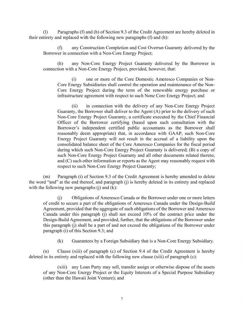 (l) Paragraphs (f) and (h) of Section 9.3 of the Credit Agreement are hereby deleted in their entirety and replaced with the following new paragraphs (f) and (h): (f) any Construction Completion and Cost Overrun Guaranty delivered by the Borrower in connection with a Non-Core Energy Project; (h) any Non-Core Energy Project Guaranty delivered by the Borrower in connection with a Non-Core Energy Project, provided, however, that: (i) one or more of the Core Domestic Ameresco Companies or Non- Core Energy Subsidiaries shall control the operation and maintenance of the Non- Core Energy Project during the term of the renewable energy purchase or infrastructure agreement with respect to such None Core Energy Project; and (ii) in connection with the delivery of any Non-Core Energy Project Guaranty, the Borrower shall deliver to the Agent (A) prior to the delivery of such Non-Core Energy Project Guaranty, a certificate executed by the Chief Financial Officer of the Borrower certifying (based upon such consultation with the Borrower’s independent certified public accountants as the Borrower shall reasonably deem appropriate) that, in accordance with GAAP, such Non-Core Energy Project Guaranty will not result in the accrual of a liability upon the consolidated balance sheet of the Core Ameresco Companies for the fiscal period during which such Non-Core Energy Project Guaranty is delivered; (B) a copy of such Non-Core Energy Project Guaranty and all other documents related thereto; and (C) such other information or reports as the Agent may reasonably request with respect to such Non-Core Energy Project Guaranty; (m) Paragraph (i) of Section 9.3 of the Credit Agreement is hereby amended to delete the word “and” at the end thereof, and paragraph (j) is hereby deleted in its entirety and replaced with the following new paragraphs (j) and (k): (j) Obligations of Ameresco Canada or the Borrower under one or more letters of credit to secure a part of the obligations of Ameresco Canada under the Design-Build Agreement, provided that the aggregate of such obligations of the Borrower and Ameresco Canada under this paragraph (j) shall not exceed 10% of the contract price under the Design-Build Agreement, and provided, further, that the obligations of the Borrower under this paragraph (j) shall be a part of and not exceed the obligations of the Borrower under paragraph (i) of this Section 9.3; and (k) Guarantees by a Foreign Subsidiary that is a Non-Core Energy Subsidiary. (n) Clause (xiii) of paragraph (c) of Section 9.4 of the Credit Agreement is hereby deleted in its entirety and replaced with the following new clause (xiii) of paragraph (c): (xiii) any Loan Party may sell, transfer assign or otherwise dispose of the assets of any Non-Core Energy Project or the Equity Interests of a Special Purpose Subsidiary (other than the Hawaii Joint Venture); and 7