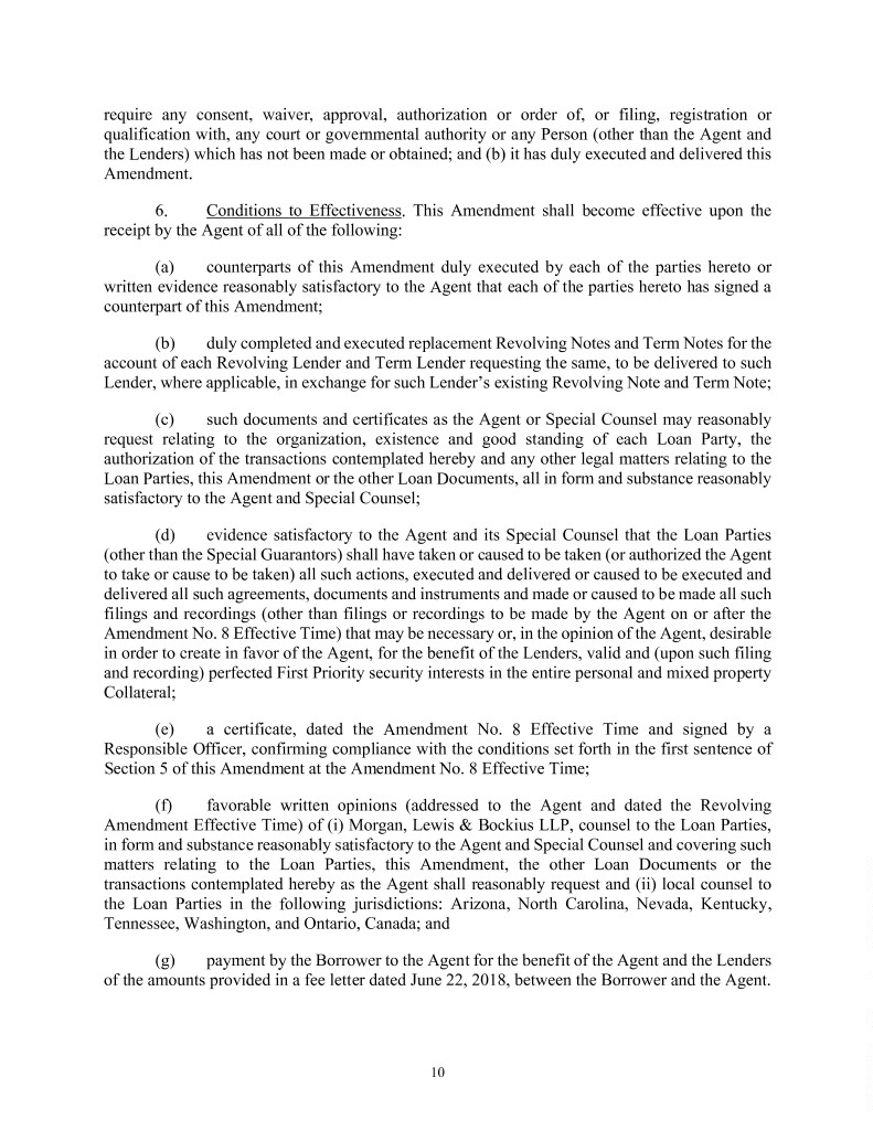 require any consent, waiver, approval, authorization or order of, or filing, registration or qualification with, any court or governmental authority or any Person (other than the Agent and the Lenders) which has not been made or obtained; and (b) it has duly executed and delivered this Amendment. 6. Conditions to Effectiveness. This Amendment shall become effective upon the receipt by the Agent of all of the following: (a) counterparts of this Amendment duly executed by each of the parties hereto or written evidence reasonably satisfactory to the Agent that each of the parties hereto has signed a counterpart of this Amendment; (b) duly completed and executed replacement Revolving Notes and Term Notes for the account of each Revolving Lender and Term Lender requesting the same, to be delivered to such Lender, where applicable, in exchange for such Lender’s existing Revolving Note and Term Note; (c) such documents and certificates as the Agent or Special Counsel may reasonably request relating to the organization, existence and good standing of each Loan Party, the authorization of the transactions contemplated hereby and any other legal matters relating to the Loan Parties, this Amendment or the other Loan Documents, all in form and substance reasonably satisfactory to the Agent and Special Counsel; (d) evidence satisfactory to the Agent and its Special Counsel that the Loan Parties (other than the Special Guarantors) shall have taken or caused to be taken (or authorized the Agent to take or cause to be taken) all such actions, executed and delivered or caused to be executed and delivered all such agreements, documents and instruments and made or caused to be made all such filings and recordings (other than filings or recordings to be made by the Agent on or after the Amendment No. 8 Effective Time) that may be necessary or, in the opinion of the Agent, desirable in order to create in favor of the Agent, for the benefit of the Lenders, valid and (upon such filing and recording) perfected First Priority security interests in the entire personal and mixed property Collateral; (e) a certificate, dated the Amendment No. 8 Effective Time and signed by a Responsible Officer, confirming compliance with the conditions set forth in the first sentence of Section 5 of this Amendment at the Amendment No. 8 Effective Time; (f) favorable written opinions (addressed to the Agent and dated the Revolving Amendment Effective Time) of (i) Morgan, Lewis & Bockius LLP, counsel to the Loan Parties, in form and substance reasonably satisfactory to the Agent and Special Counsel and covering such matters relating to the Loan Parties, this Amendment, the other Loan Documents or the transactions contemplated hereby as the Agent shall reasonably request and (ii) local counsel to the Loan Parties in the following jurisdictions: Arizona, North Carolina, Nevada, Kentucky, Tennessee, Washington, and Ontario, Canada; and (g) payment by the Borrower to the Agent for the benefit of the Agent and the Lenders of the amounts provided in a fee letter dated June 22, 2018, between the Borrower and the Agent. 10
