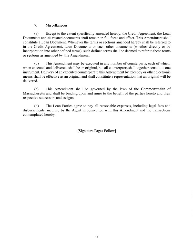 7. Miscellaneous. (a) Except to the extent specifically amended hereby, the Credit Agreement, the Loan Documents and all related documents shall remain in full force and effect. This Amendment shall constitute a Loan Document. Whenever the terms or sections amended hereby shall be referred to in the Credit Agreement, Loan Documents or such other documents (whether directly or by incorporation into other defined terms), such defined terms shall be deemed to refer to those terms or sections as amended by this Amendment. (b) This Amendment may be executed in any number of counterparts, each of which, when executed and delivered, shall be an original, but all counterparts shall together constitute one instrument. Delivery of an executed counterpart to this Amendment by telecopy or other electronic means shall be effective as an original and shall constitute a representation that an original will be delivered. (c) This Amendment shall be governed by the laws of the Commonwealth of Massachusetts and shall be binding upon and inure to the benefit of the parties hereto and their respective successors and assigns. (d) The Loan Parties agree to pay all reasonable expenses, including legal fees and disbursements, incurred by the Agent in connection with this Amendment and the transactions contemplated hereby. [Signature Pages Follow] 11