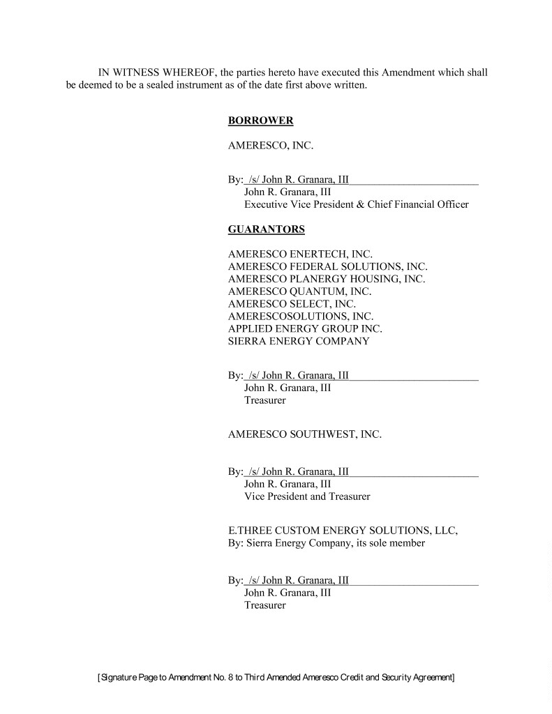 IN WITNESS WHEREOF, the parties hereto have executed this Amendment which shall be deemed to be a sealed instrument as of the date first above written. BORROWER AMERESCO, INC. By: /s/ John R. Granara, III __________________________ John R. Granara, III Executive Vice President & Chief Financial Officer GUARANTORS AMERESCO ENERTECH, INC. AMERESCO FEDERAL SOLUTIONS, INC. AMERESCO PLANERGY HOUSING, INC. AMERESCO QUANTUM, INC. AMERESCO SELECT, INC. AMERESCOSOLUTIONS, INC. APPLIED ENERGY GROUP INC. SIERRA ENERGY COMPANY By: /s/ John R. Granara, III __________________________ John R. Granara, III Treasurer AMERESCO SOUTHWEST, INC. By: /s/ John R. Granara, III __________________________ John R. Granara, III Vice President and Treasurer E.THREE CUSTOM ENERGY SOLUTIONS, LLC, By: Sierra Energy Company, its sole member By: /s/ John R. Granara, III __________________________ John R. Granara, III Treasurer [Signature Page to Amendment No. 8 to Third Amended Ameresco Credit and Security Agreement]