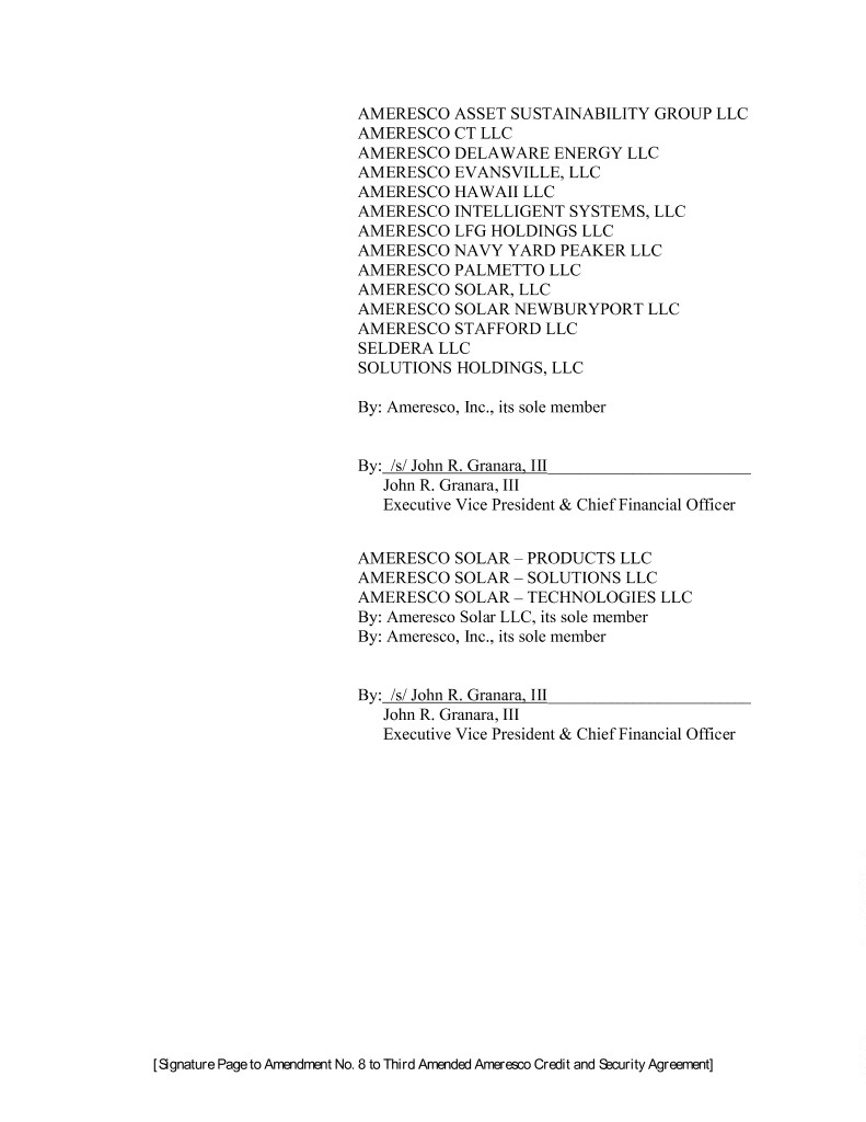 AMERESCO ASSET SUSTAINABILITY GROUP LLC AMERESCO CT LLC AMERESCO DELAWARE ENERGY LLC AMERESCO EVANSVILLE, LLC AMERESCO HAWAII LLC AMERESCO INTELLIGENT SYSTEMS, LLC AMERESCO LFG HOLDINGS LLC AMERESCO NAVY YARD PEAKER LLC AMERESCO PALMETTO LLC AMERESCO SOLAR, LLC AMERESCO SOLAR NEWBURYPORT LLC AMERESCO STAFFORD LLC SELDERA LLC SOLUTIONS HOLDINGS, LLC By: Ameresco, Inc., its sole member By: /s/ John R. Granara, III __________________________ John R. Granara, III Executive Vice President & Chief Financial Officer AMERESCO SOLAR – PRODUCTS LLC AMERESCO SOLAR – SOLUTIONS LLC AMERESCO SOLAR – TECHNOLOGIES LLC By: Ameresco Solar LLC, its sole member By: Ameresco, Inc., its sole member By: /s/ John R. Granara, III __________________________ John R. Granara, III Executive Vice President & Chief Financial Officer [Signature Page to Amendment No. 8 to Third Amended Ameresco Credit and Security Agreement]