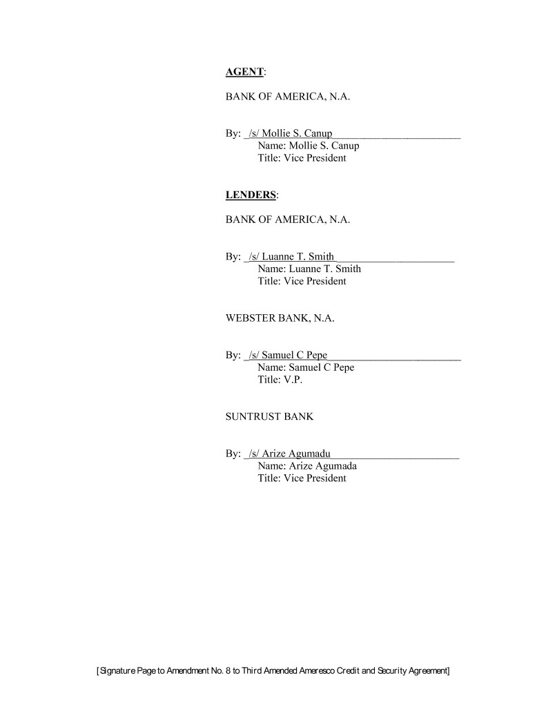 AGENT: BANK OF AMERICA, N.A. By: _/s/ Mollie S. Canup________________________ Name: Mollie S. Canup Title: Vice President LENDERS: BANK OF AMERICA, N.A. By: _/s/ Luanne T. Smith ______________________ Name: Luanne T. Smith Title: Vice President WEBSTER BANK, N.A. By: _/s/ Samuel C Pepe_________________________ Name: Samuel C Pepe Title: V.P. SUNTRUST BANK By: _/s/ Arize Agumadu________________________ Name: Arize Agumada Title: Vice President [Signature Page to Amendment No. 8 to Third Amended Ameresco Credit and Security Agreement]