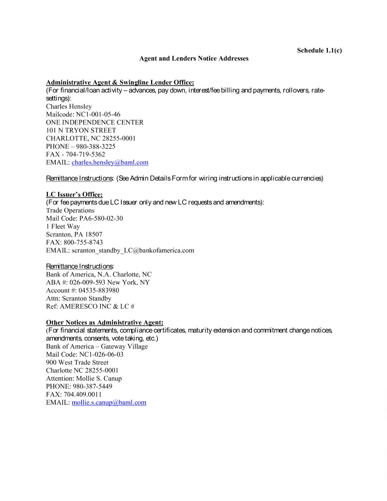 Schedule 1.1(c) Agent and Lenders Notice Addresses Administrative Agent & Swingline Lender Office: (For financial/loan activity – advances, pay down, interest/fee billing and payments, rollovers, rate- settings): Charles Hensley Mailcode: NC1-001-05-46 ONE INDEPENDENCE CENTER 101 N TRYON STREET CHARLOTTE, NC 28255-0001 PHONE – 980-388-3225 FAX - 704-719-5362 EMAIL: charles.hensley@baml.com Remittance Instructions: (See Admin Details Form for wiring instructions in applicable currencies) LC Issuer’s Office: (For fee payments due LC Issuer only and new LC requests and amendments): Trade Operations Mail Code: PA6-580-02-30 1 Fleet Way Scranton, PA 18507 FAX: 800-755-8743 EMAIL: scranton_standby_LC@bankofamerica.com Remittance Instructions: Bank of America, N.A. Charlotte, NC ABA #: 026-009-593 New York, NY Account #: 04535-883980 Attn: Scranton Standby Ref: AMERESCO INC & LC # Other Notices as Administrative Agent: (For financial statements, compliance certificates, maturity extension and commitment change notices, amendments, consents, vote taking, etc.) Bank of America – Gateway Village Mail Code: NC1-026-06-03 900 West Trade Street Charlotte NC 28255-0001 Attention: Mollie S. Canup PHONE: 980-387-5449 FAX: 704.409.0011 EMAIL: mollie.s.canup@baml.com