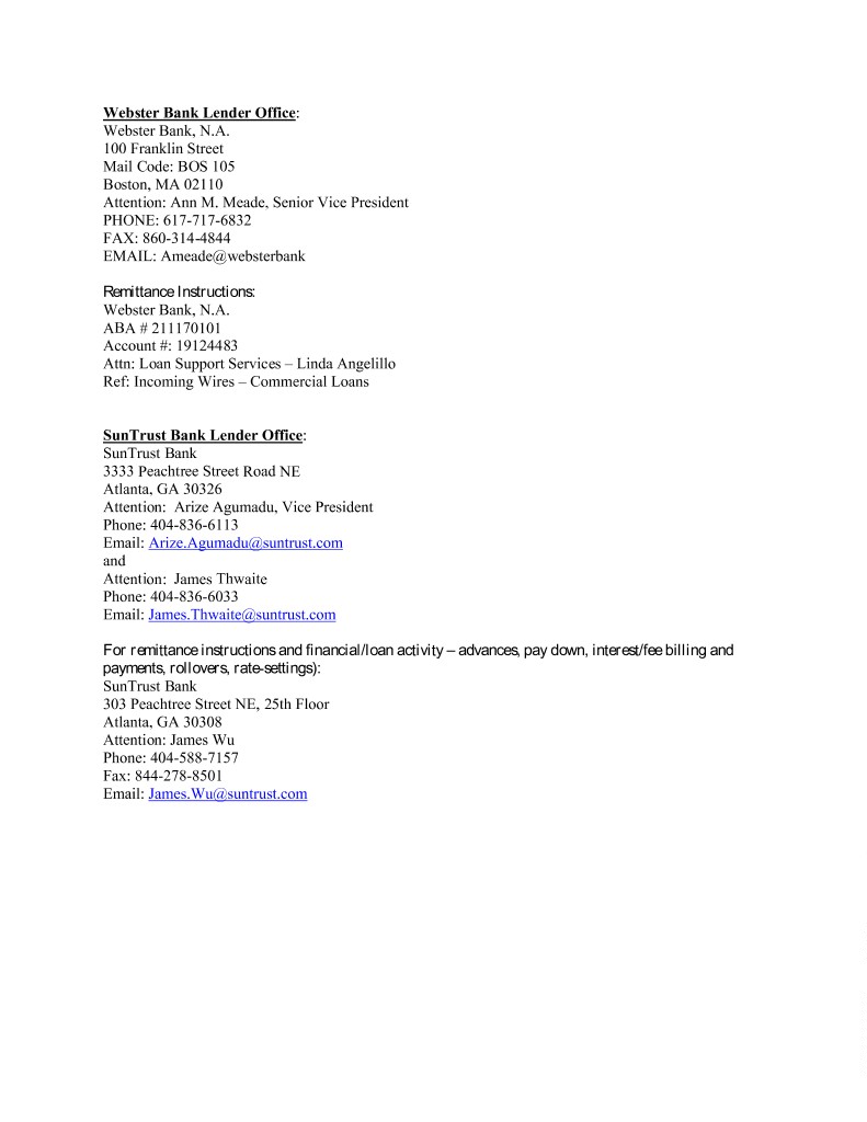 Webster Bank Lender Office: Webster Bank, N.A. 100 Franklin Street Mail Code: BOS 105 Boston, MA 02110 Attention: Ann M. Meade, Senior Vice President PHONE: 617-717-6832 FAX: 860-314-4844 EMAIL: Ameade@websterbank Remittance Instructions: Webster Bank, N.A. ABA # 211170101 Account #: 19124483 Attn: Loan Support Services – Linda Angelillo Ref: Incoming Wires – Commercial Loans SunTrust Bank Lender Office: SunTrust Bank 3333 Peachtree Street Road NE Atlanta, GA 30326 Attention: Arize Agumadu, Vice President Phone: 404-836-6113 Email: Arize.Agumadu@suntrust.com and Attention: James Thwaite Phone: 404-836-6033 Email: James.Thwaite@suntrust.com For remittance instructions and financial/loan activity – advances, pay down, interest/fee billing and payments, rollovers, rate-settings): SunTrust Bank 303 Peachtree Street NE, 25th Floor Atlanta, GA 30308 Attention: James Wu Phone: 404-588-7157 Fax: 844-278-8501 Email: James.Wu@suntrust.com