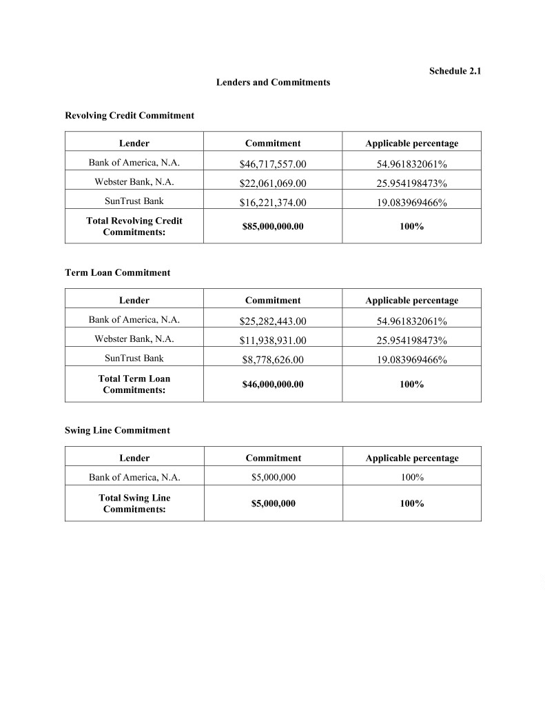 Schedule 2.1 Lenders and Commitments Revolving Credit Commitment Lender Commitment Applicable percentage Bank of America, N.A. $46,717,557.00 54.961832061% Webster Bank, N.A. $22,061,069.00 25.954198473% SunTrust Bank $16,221,374.00 19.083969466% Total Revolving Credit $85,000,000.00 100% Commitments: Term Loan Commitment Lender Commitment Applicable percentage Bank of America, N.A. $25,282,443.00 54.961832061% Webster Bank, N.A. $11,938,931.00 25.954198473% SunTrust Bank $8,778,626.00 19.083969466% Total Term Loan $46,000,000.00 100% Commitments: Swing Line Commitment Lender Commitment Applicable percentage Bank of America, N.A. $5,000,000 100% Total Swing Line $5,000,000 100% Commitments: